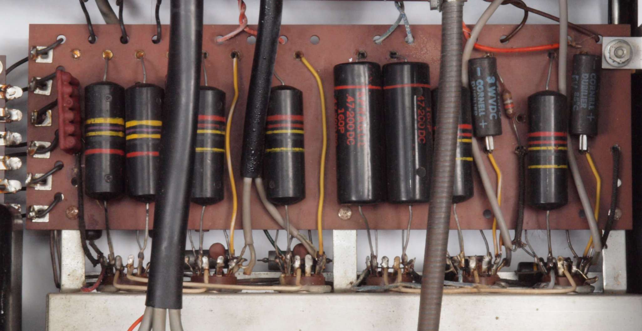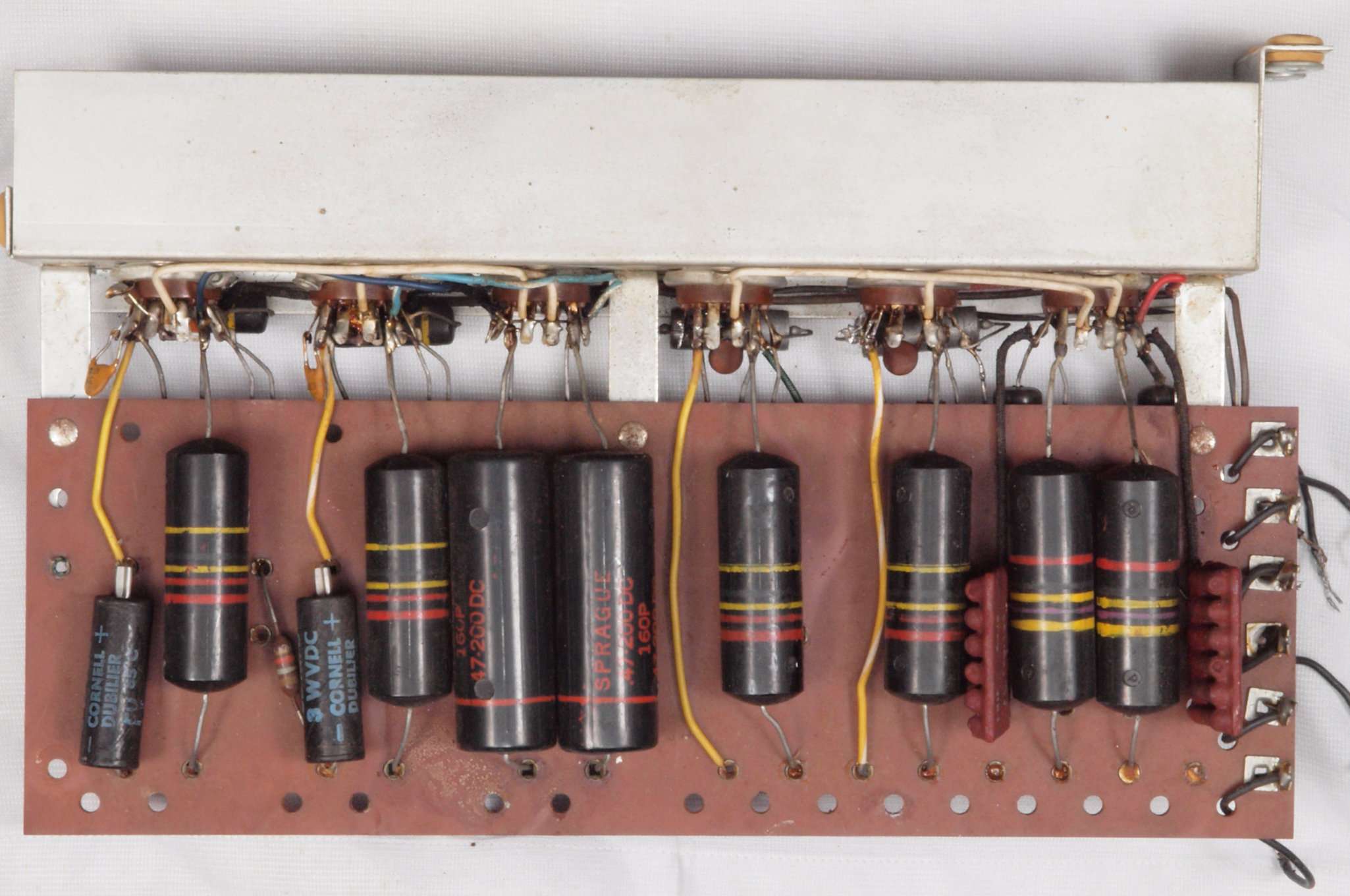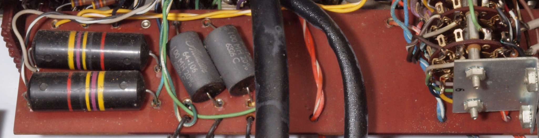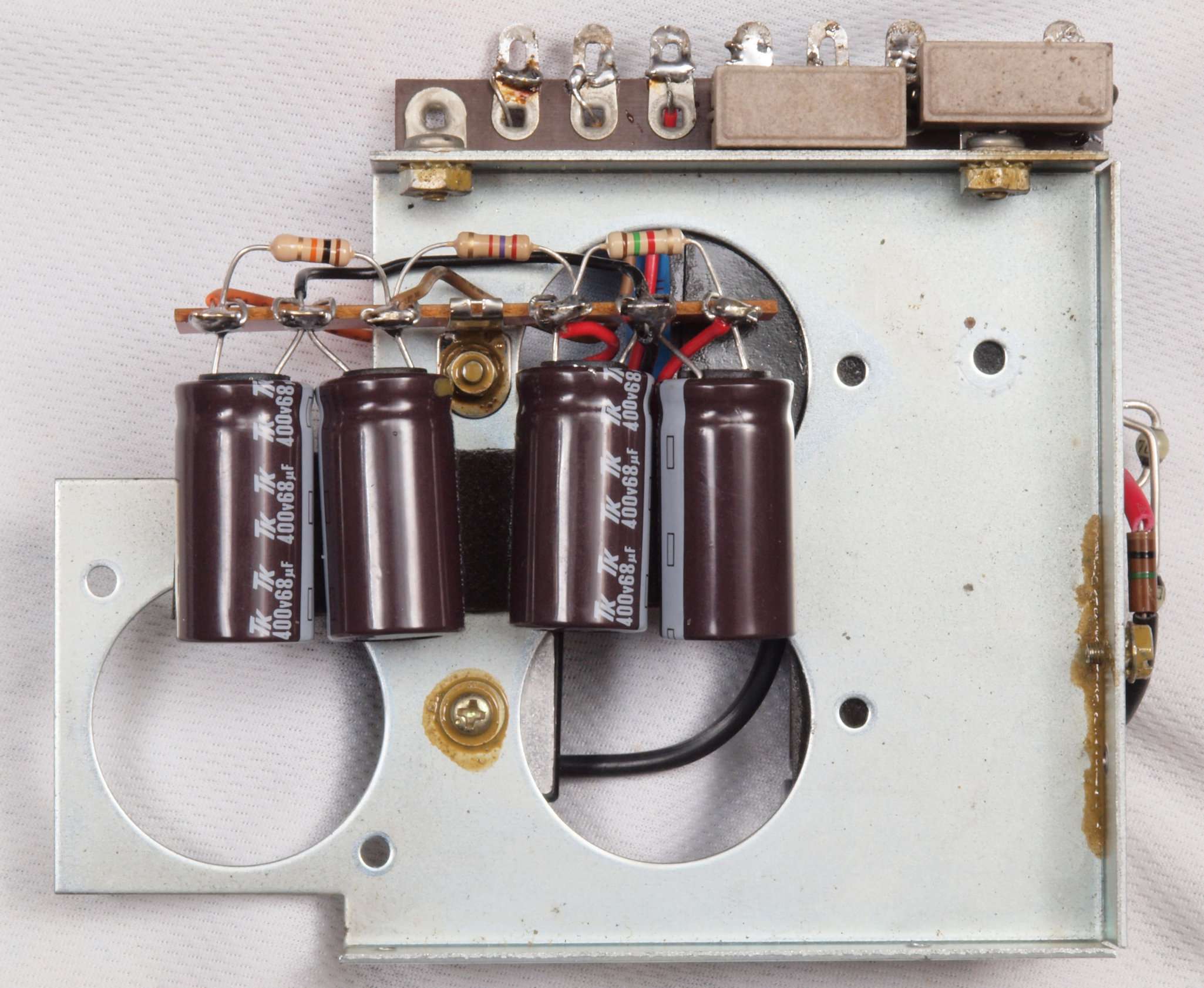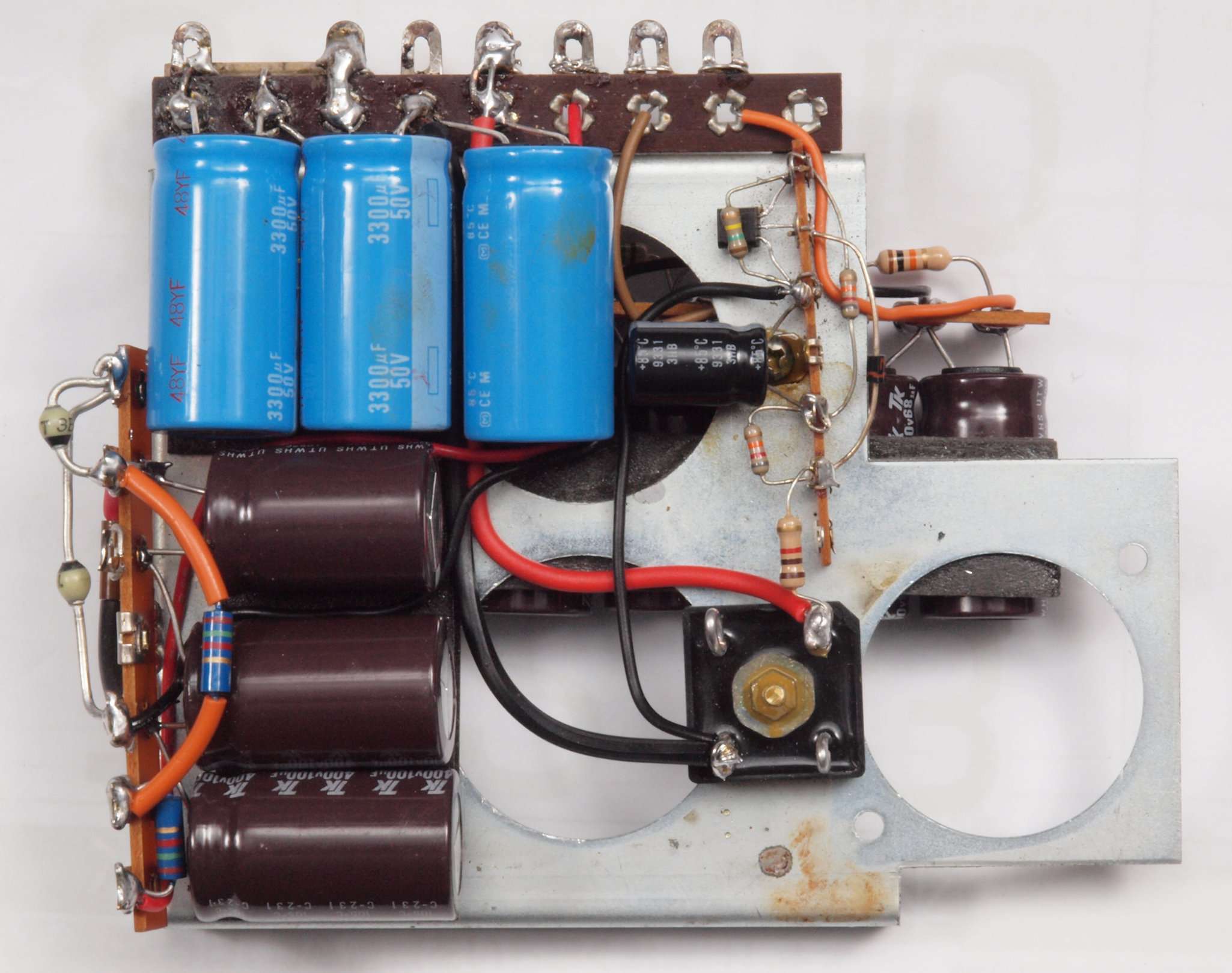 | C54. 修理後 電源部シャーシ裏。 整流器、電解コンデンサー全部交換する。出力遅延回路組み込み。 | ||||||||||||||||||||||||||||||