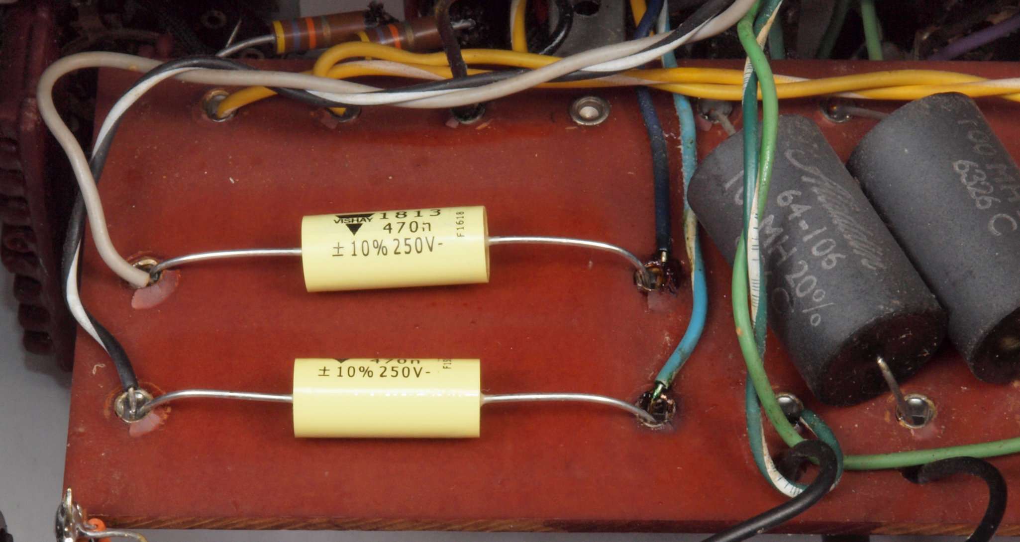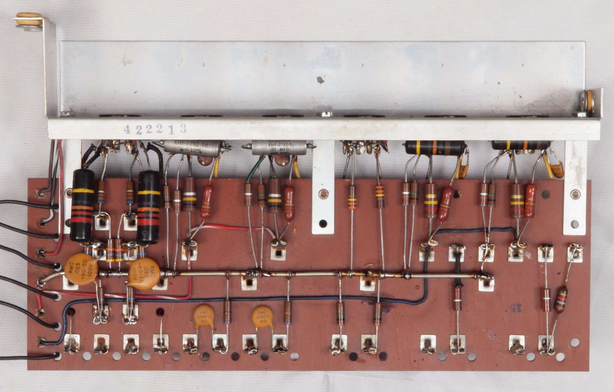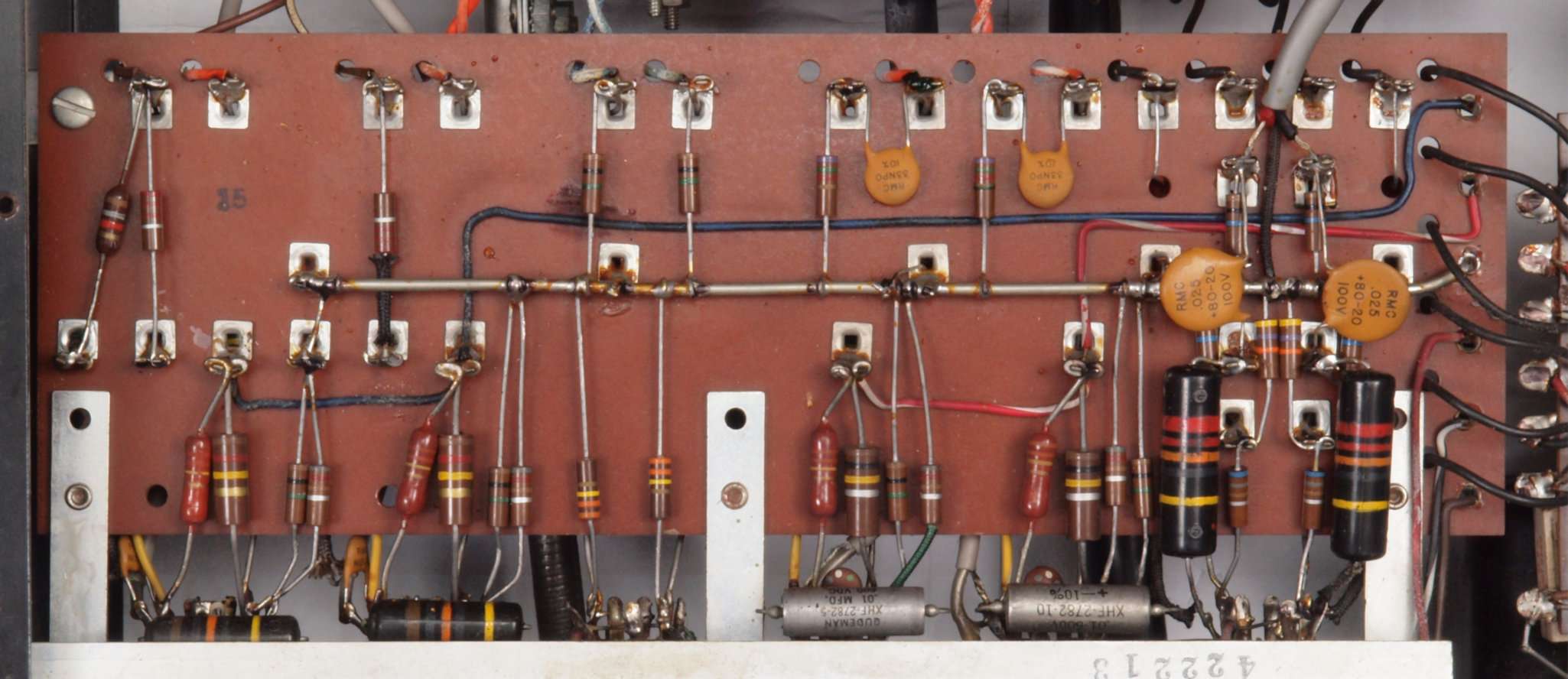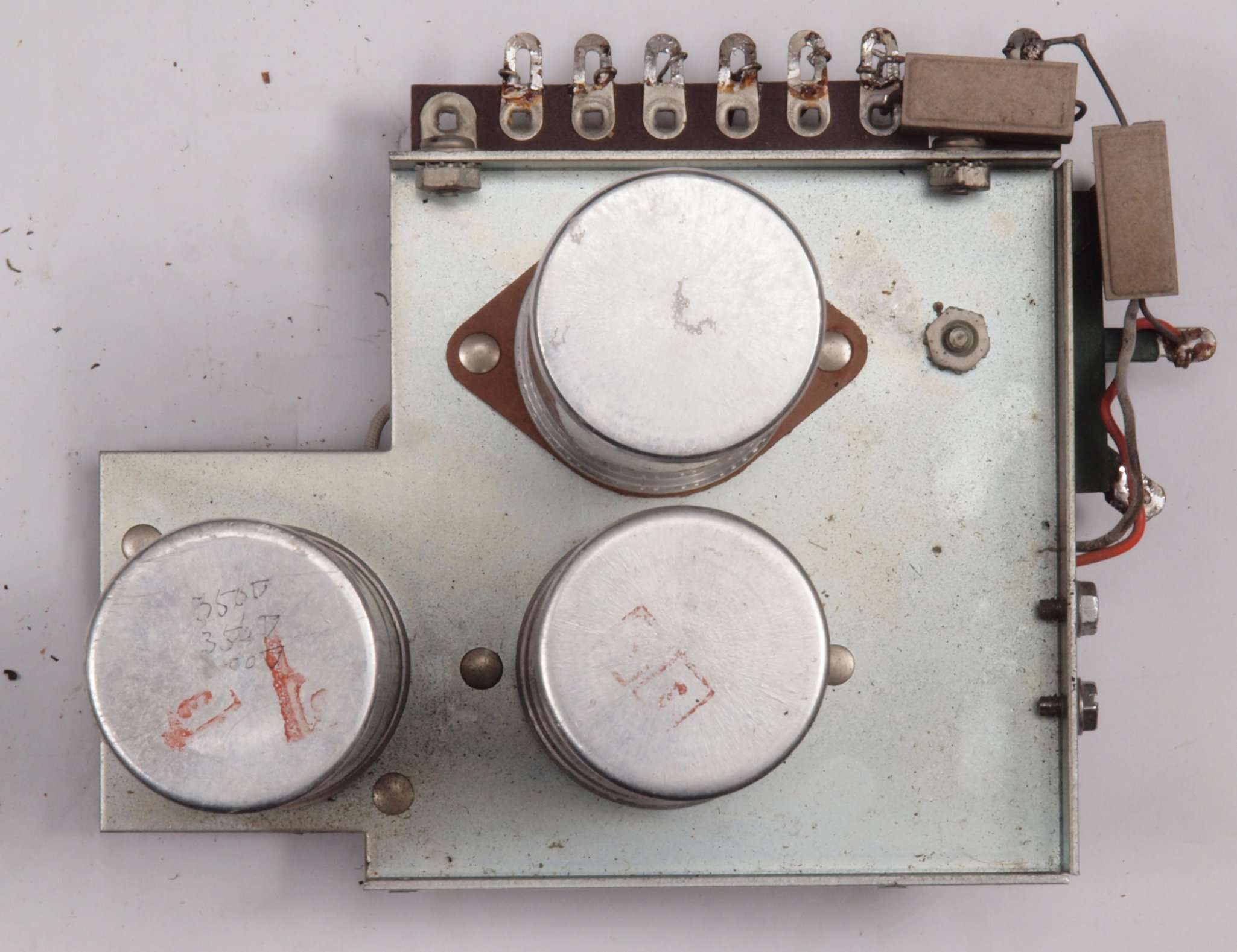 | C54. 修理後 電源部シャーシ裏。 整流器、電解コンデンサー全部交換する。出力遅延回路組み込み。 | ||||||||||||||||||||||||||||||