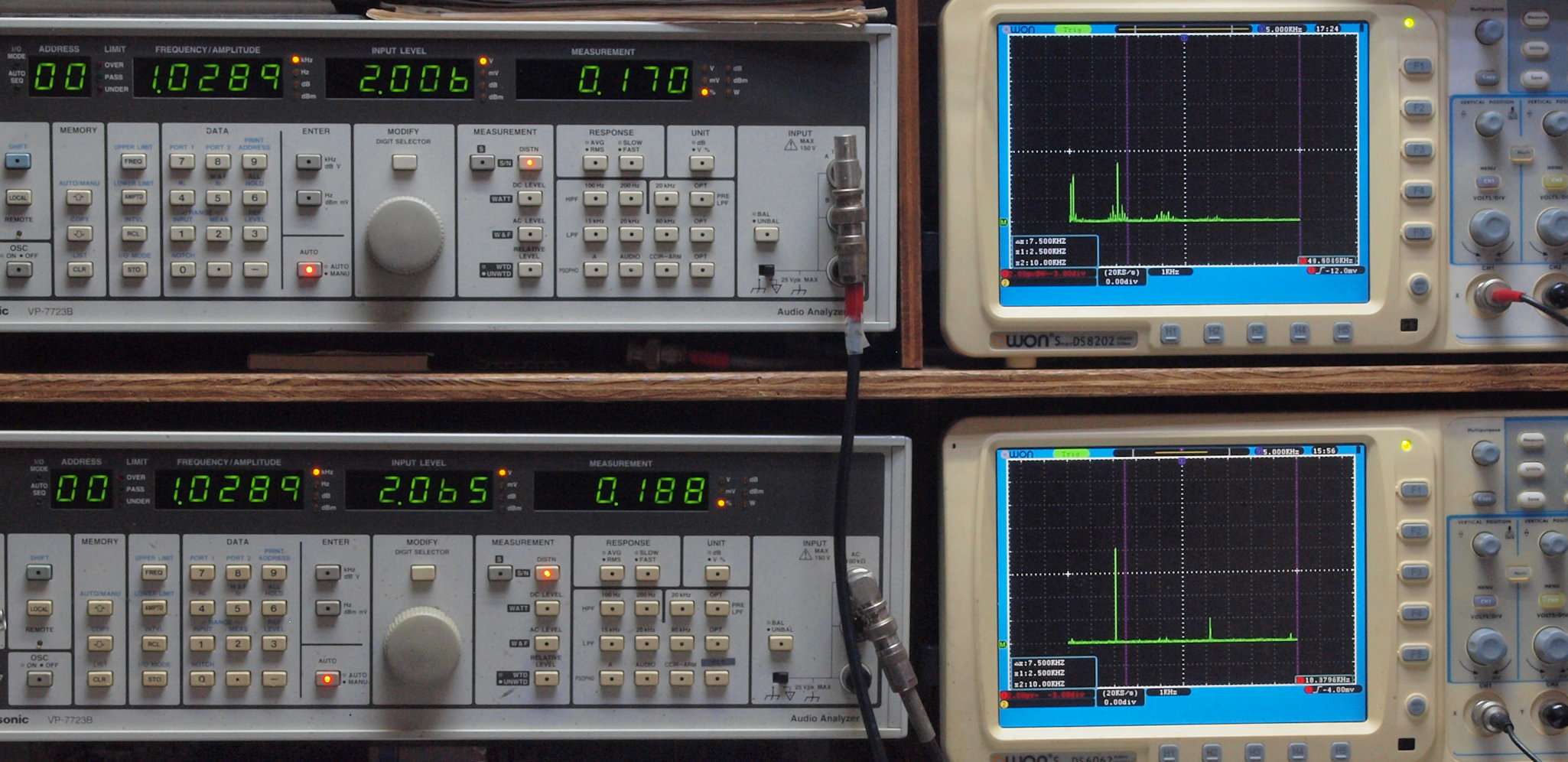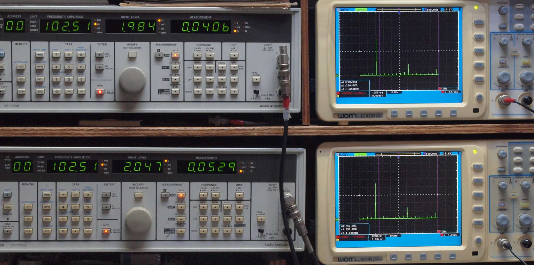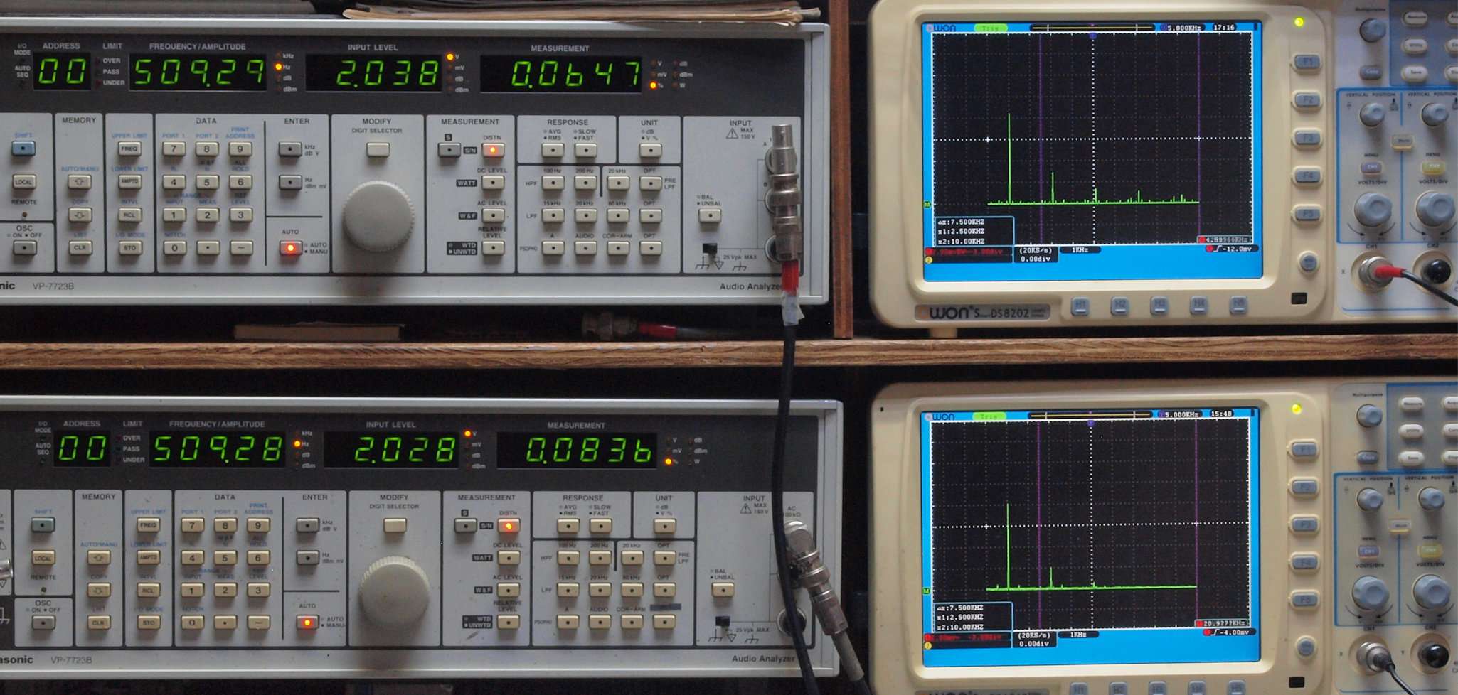 | E. 調整・測定。 画像をクリックすると、大きく(横幅2050ドット)表示されます。 E1. 出力・歪み率測定・調整。 電源電圧100Vにて測定。 「見方」。 上段中 右側出力を「Audio Analyzer Panasonic VP−7723B」により測定。 表示LED、 左端=メモリーNo、 中左=周波数測定、 中右=出力電圧測定、 右端=歪み率測定。 上段右端 VP−7723Bの基本波除去出力を「owon SDS8202(200MHZ)」で「FFT分析」表示。 下段中 左側出力を「Audio Analyzer Panasonic VP−7723B」により測定。 表示LED、 左端=メモリーNo、 中左=周波数測定、 中右=出力電圧測定、 右端=歪み率測定。 下段右端 VP−7723Bの基本波除去出力を「owon SDS6062(200MHZ)」で「FFT分析」表示。 下段左端 オーディオ発振器 VP−7201A より50Hz〜100kHzの信号を出し(歪み率=約0.003%)、ATT+分配器を通し、AMPに入力。 よって、ダイアル設定出力レベルより低くなります。測定機器の仕様や整備の様子はこちら、「VP−7723B」「VP−7201A」。 FFT画面の見方はこちら。 |