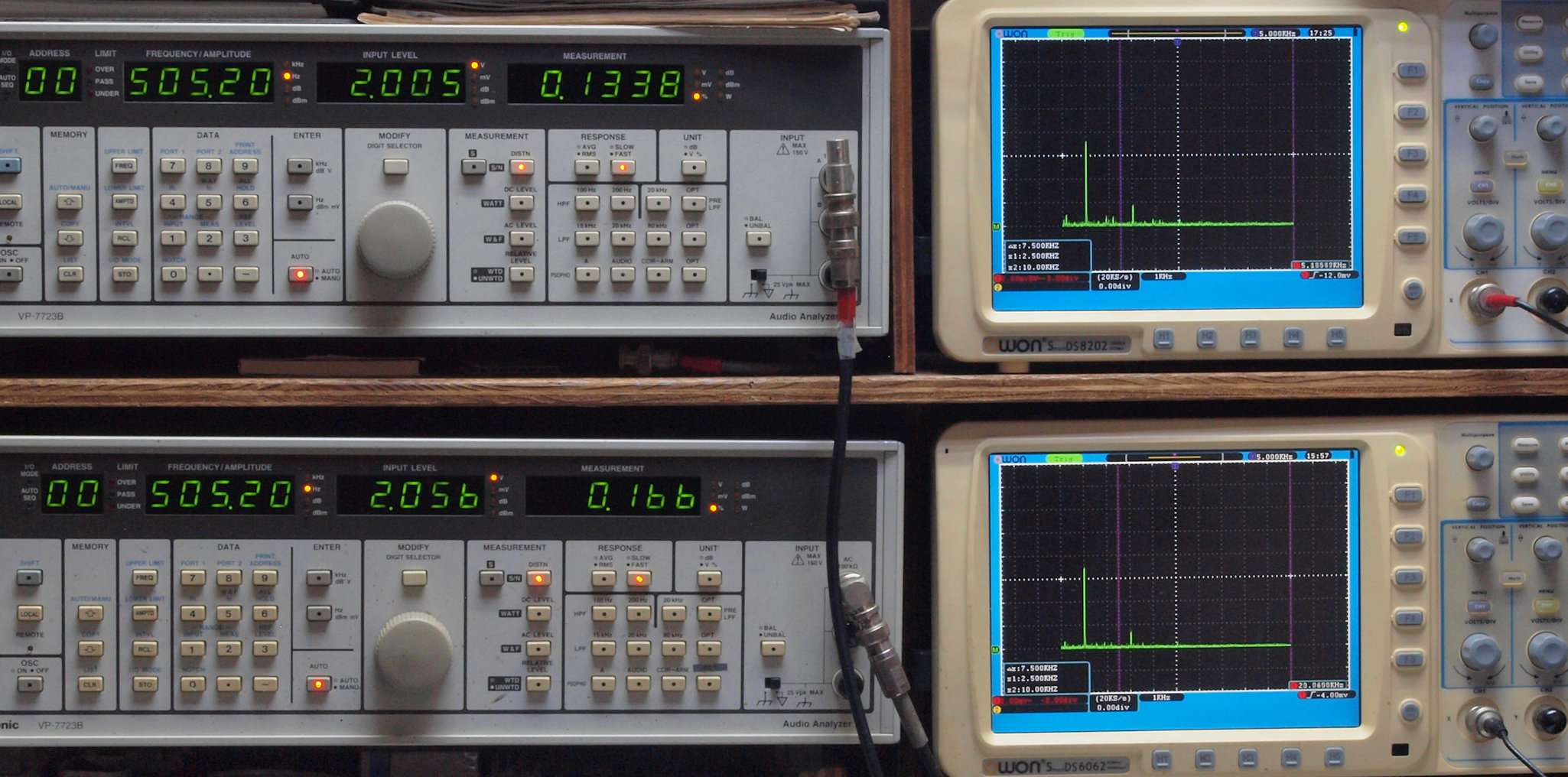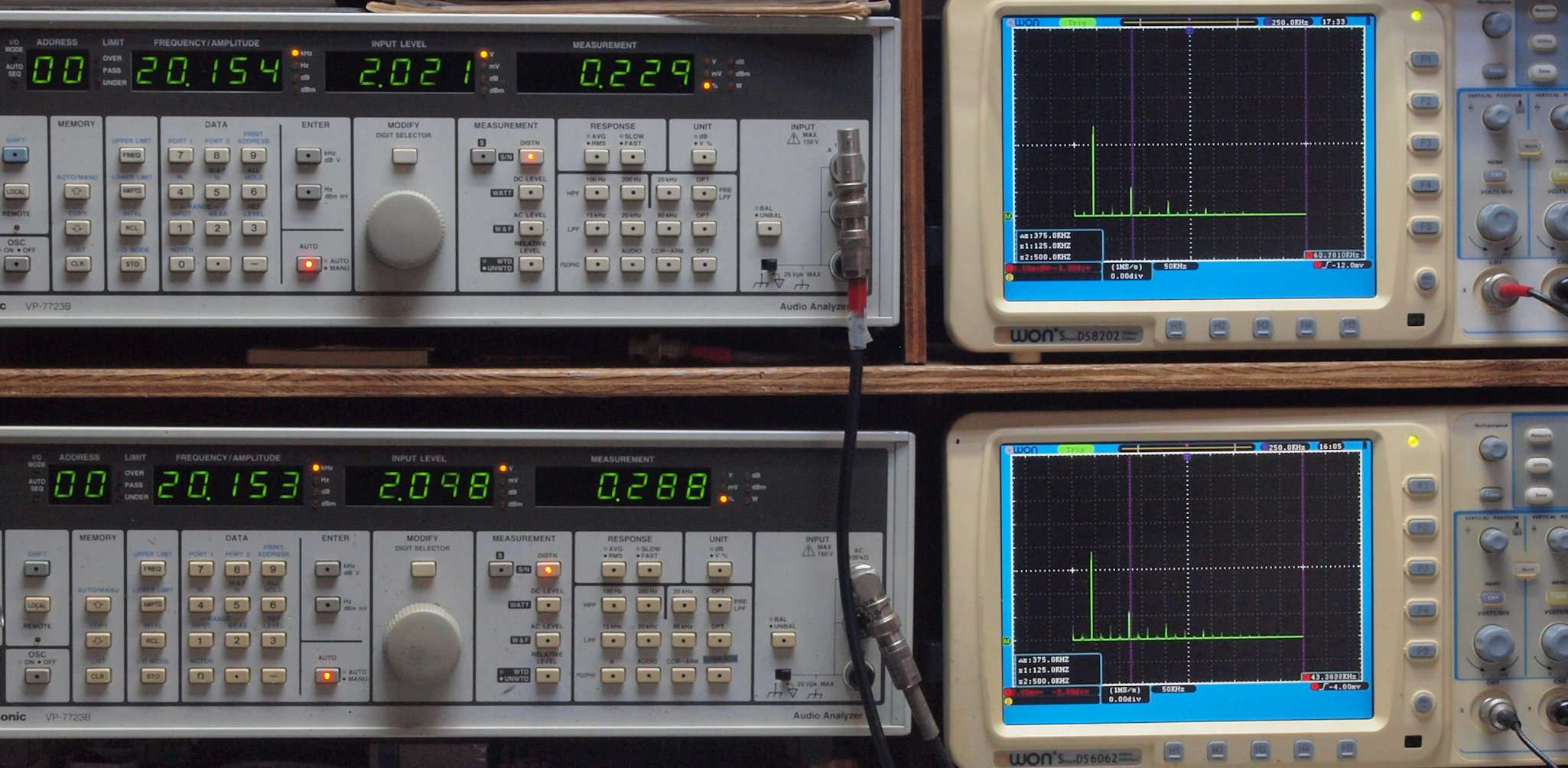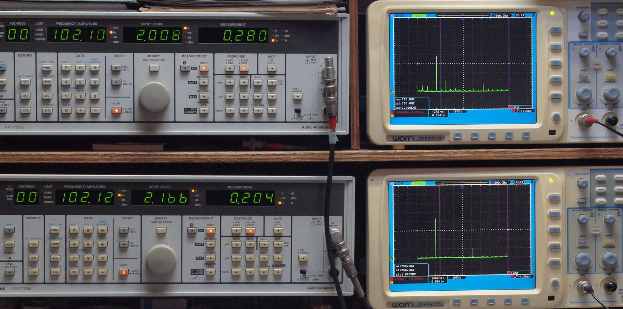 | E. 調整・測定。 画像をクリックすると、大きく(横幅2050ドット)表示されます。 E1. 出力・歪み率測定・調整。 電源電圧100Vにて測定。 「見方」。 上段中 右側出力を「Audio Analyzer Panasonic VP−7723B」により測定。 表示LED、 左端=メモリーNo、 中左=周波数測定、 中右=出力電圧測定、 右端=歪み率測定。 上段右端 VP−7723Bの基本波除去出力を「owon SDS8202(200MHZ)」で「FFT分析」表示。 下段中 左側出力を「Audio Analyzer Panasonic VP−7723B」により測定。 表示LED、 左端=メモリーNo、 中左=周波数測定、 中右=出力電圧測定、 右端=歪み率測定。 下段右端 VP−7723Bの基本波除去出力を「owon SDS6062(200MHZ)」で「FFT分析」表示。 下段左端 オーディオ発振器 VP−7201A より50Hz〜100kHzの信号を出し(歪み率=約0.003%)、ATT+分配器を通し、AMPに入力。 よって、ダイアル設定出力レベルより低くなります。測定機器の仕様や整備の様子はこちら、「VP−7723B」「VP−7201A」。 FFT画面の見方はこちら。 |