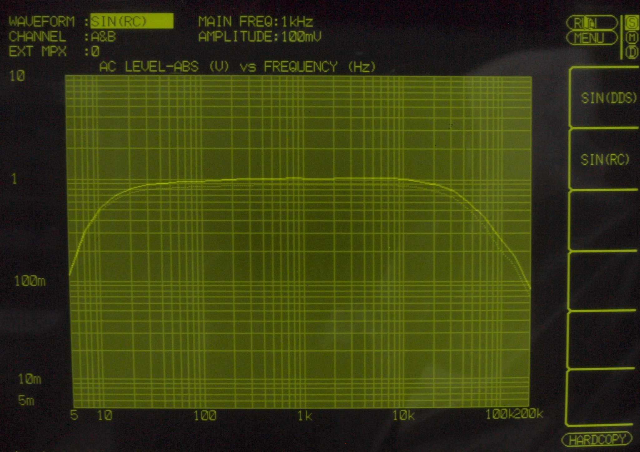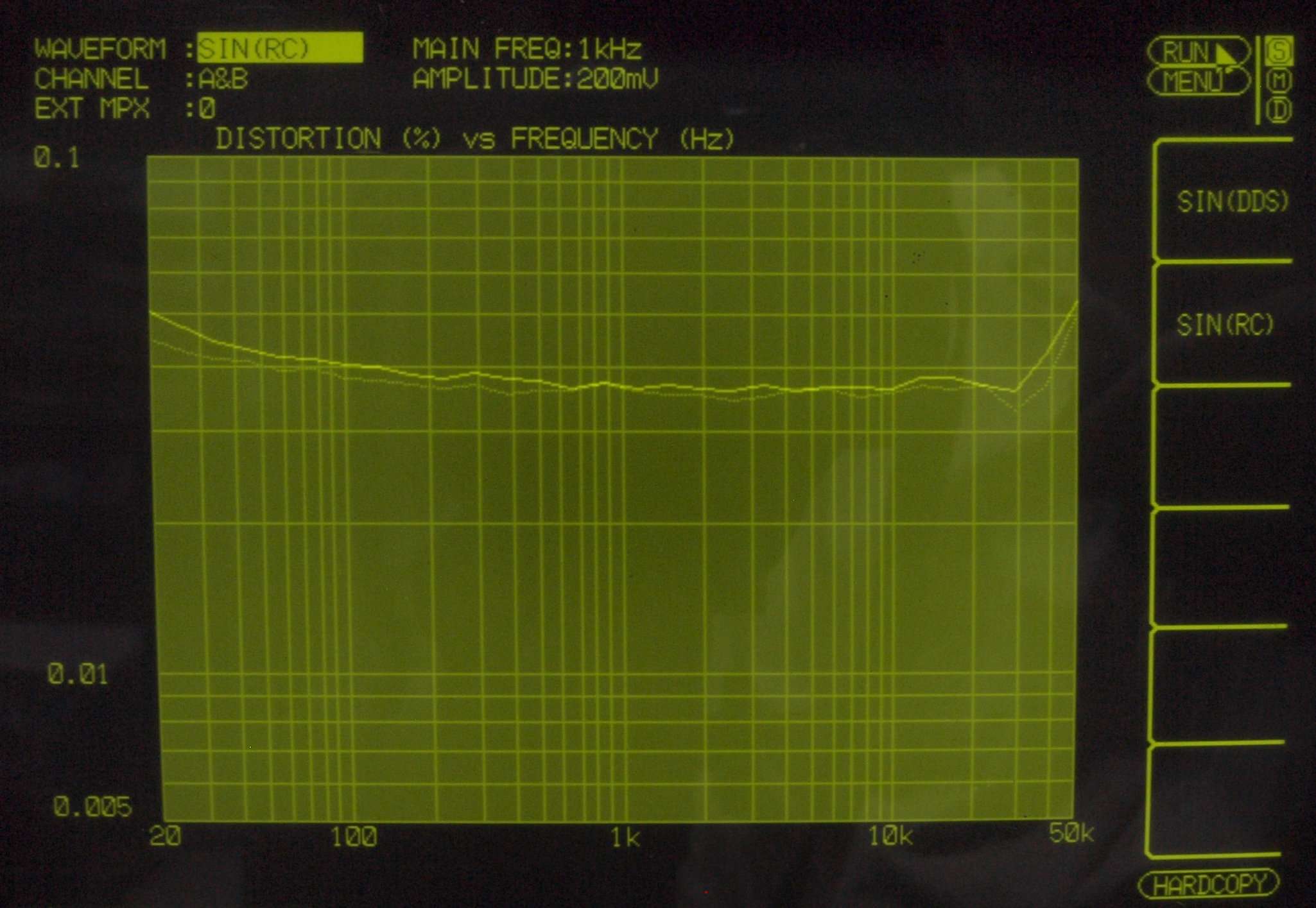 | F22. 歪み率測定 AUX入力端子へ100mV一定入力、メインVRはmax。 左出力=薄(細い)色 右出力=濃い(太い)色。 レベルは測定器任せの全自動。 |