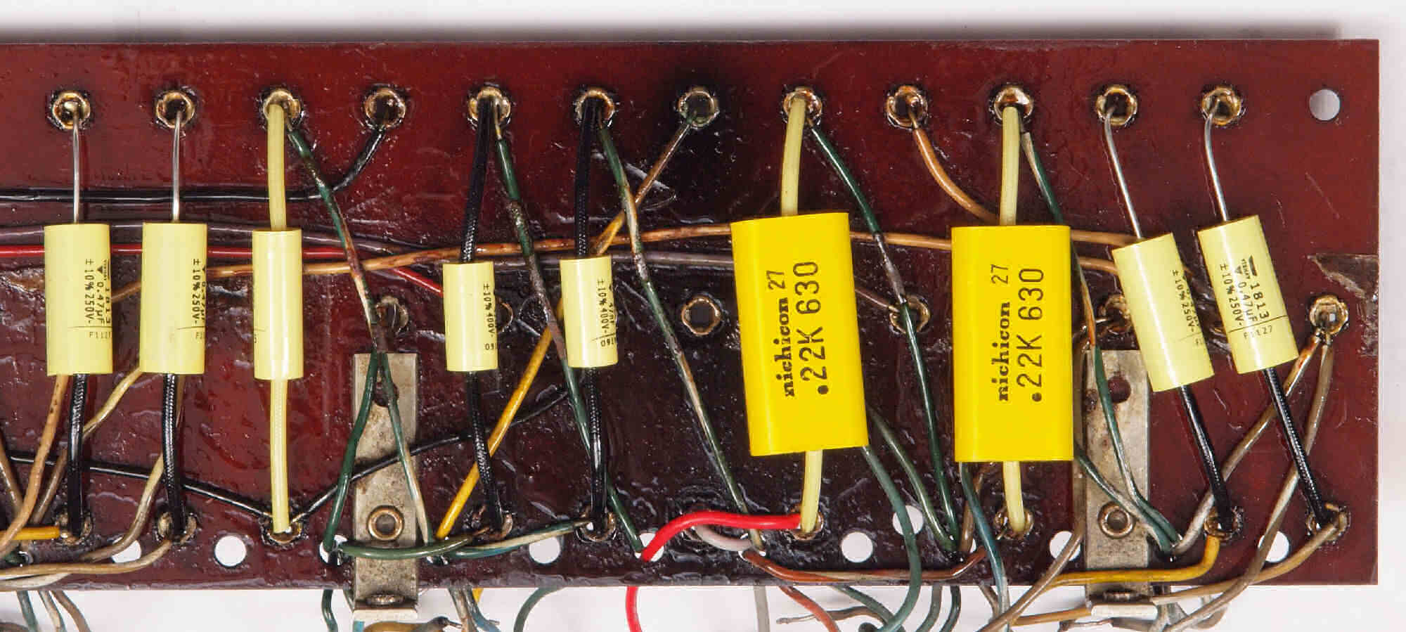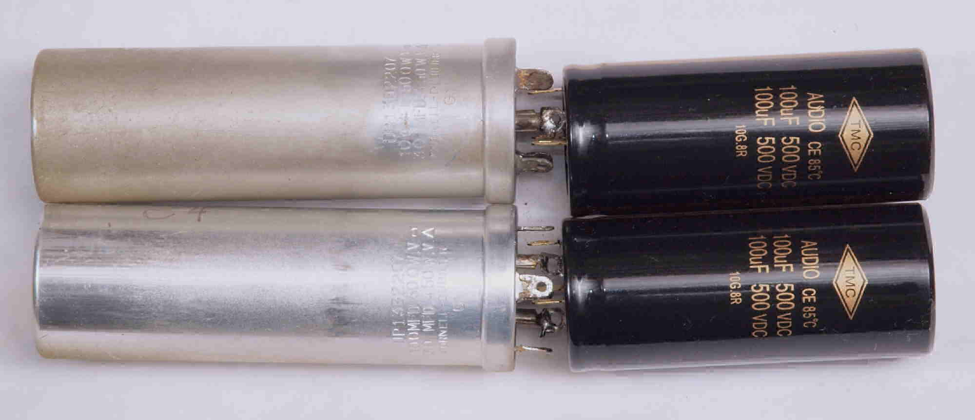 | C95. 交換部品、 左=100μ/500WV+30μ/450WV、右=新しい物100μ×2/500WV。 | ||||||||||||||||||||||||