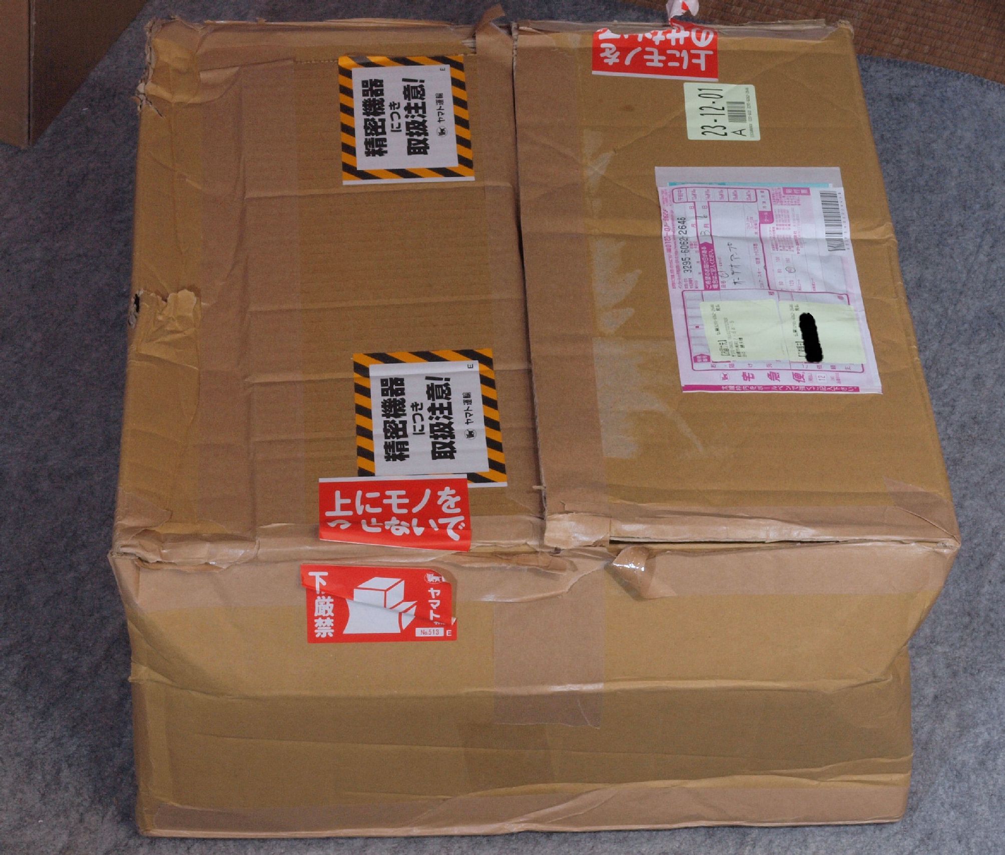 | A. 修理前の点検状況。 画像をクリックすると、大きく(横幅2050ドット)表示されます。 A01. 点検中 梱包の様子、弱い1重ねのダンボール。 |