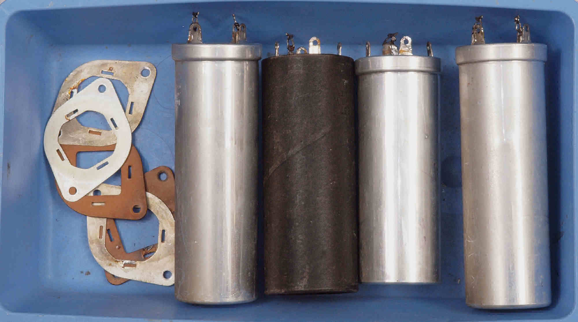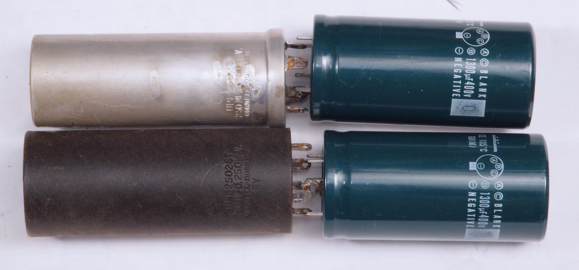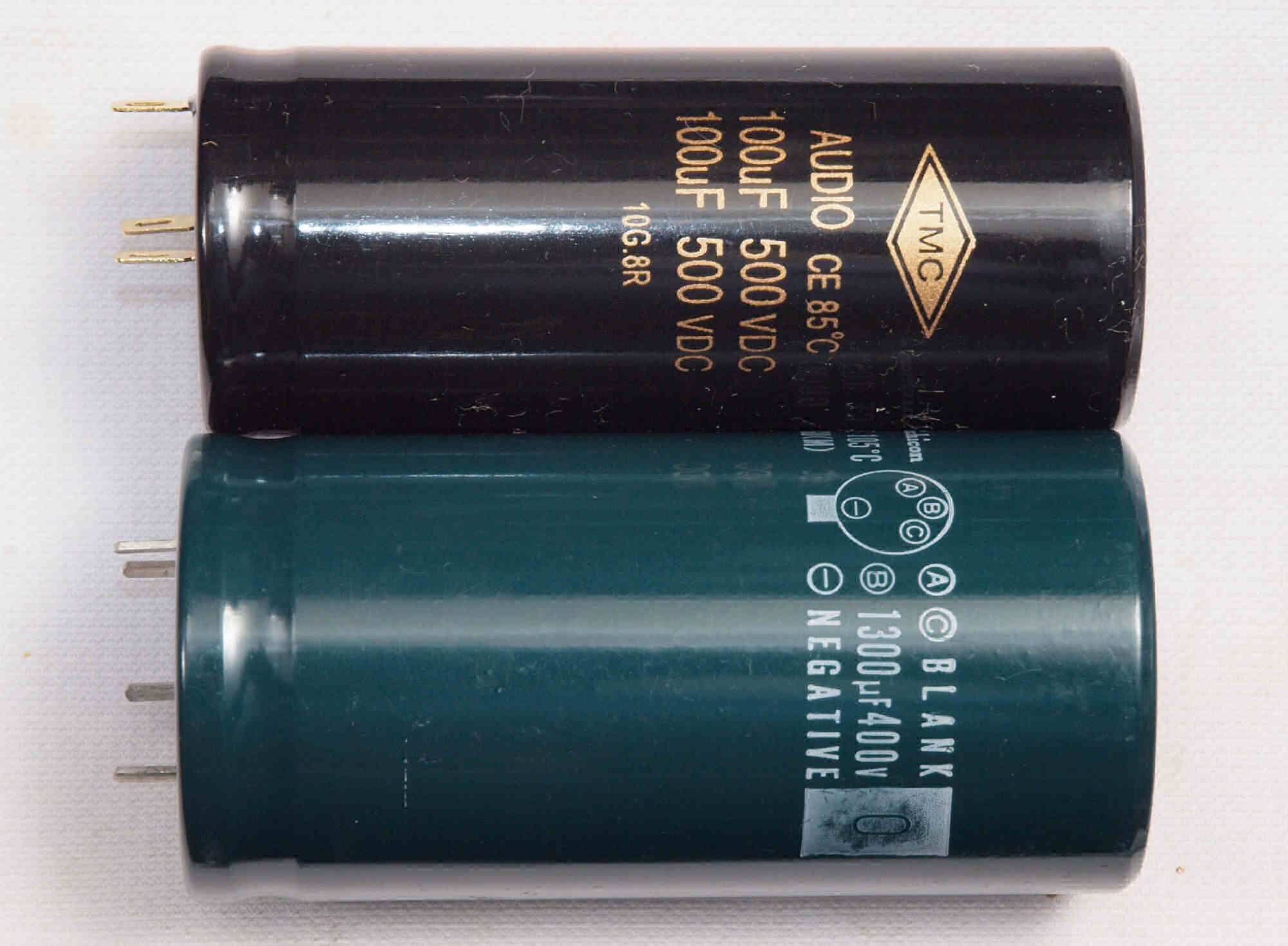 | A32. 点検中 使用する電解コンデンサー。 上=100μF×2/500WV、 下=1300μF/400WV | ||||||||||||||||||||||||