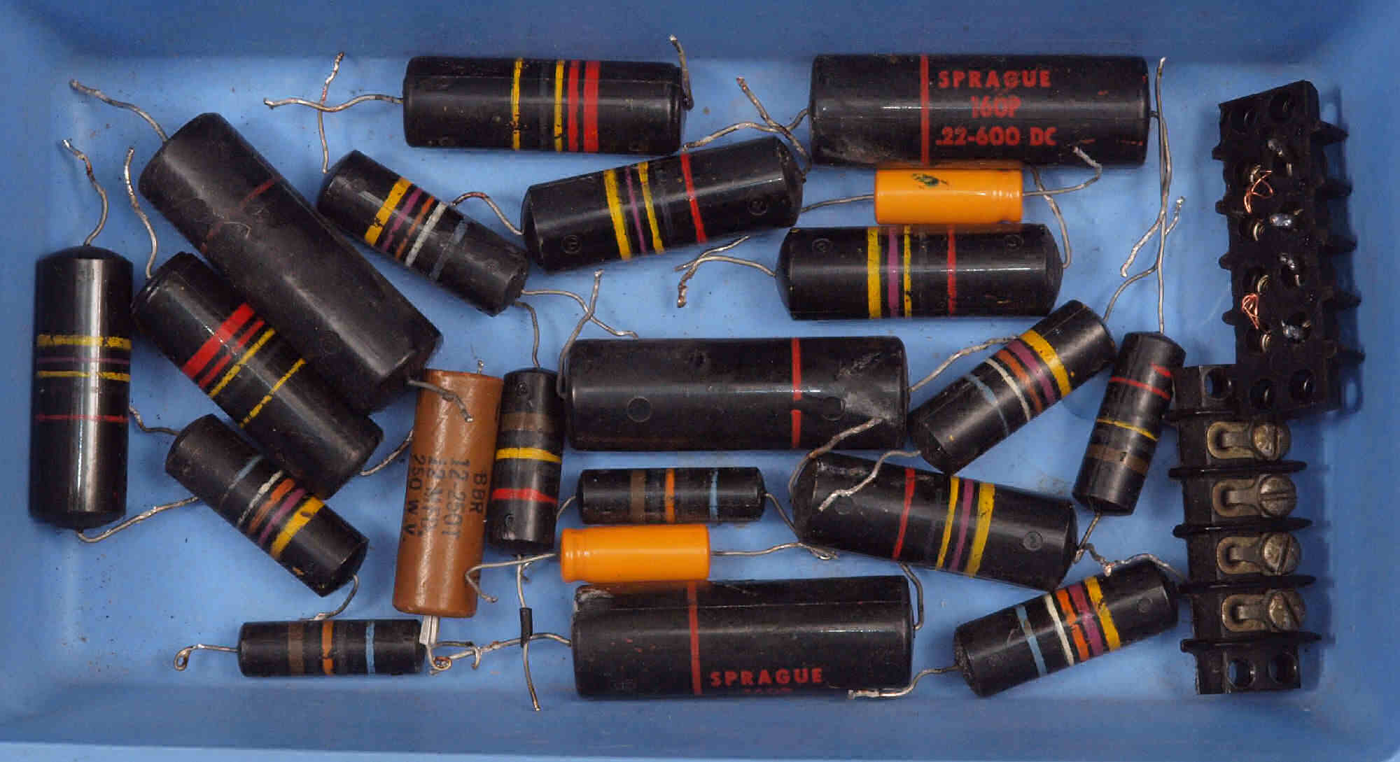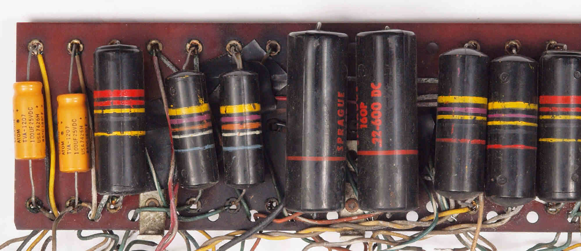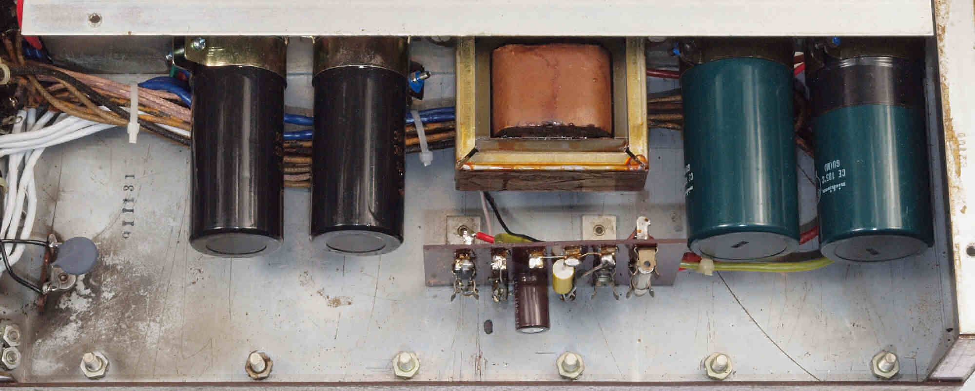 | A32. 点検中 使用する電解コンデンサー。 上=100μF×2/500WV、 下=1300μF/400WV | ||||||||||||||||||||||||