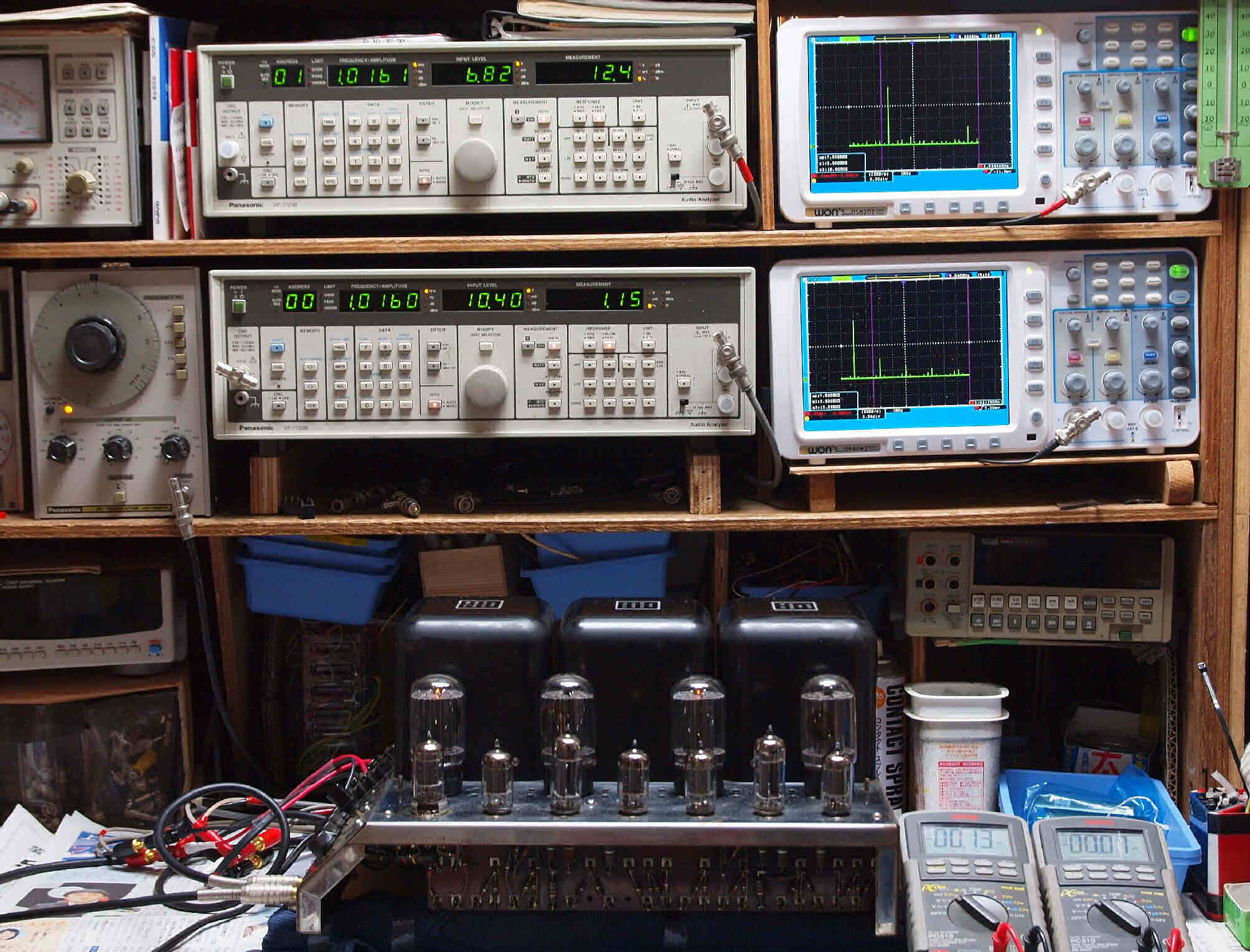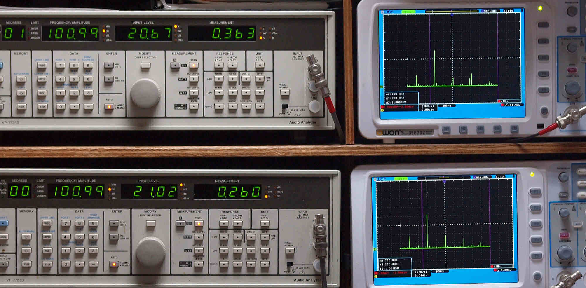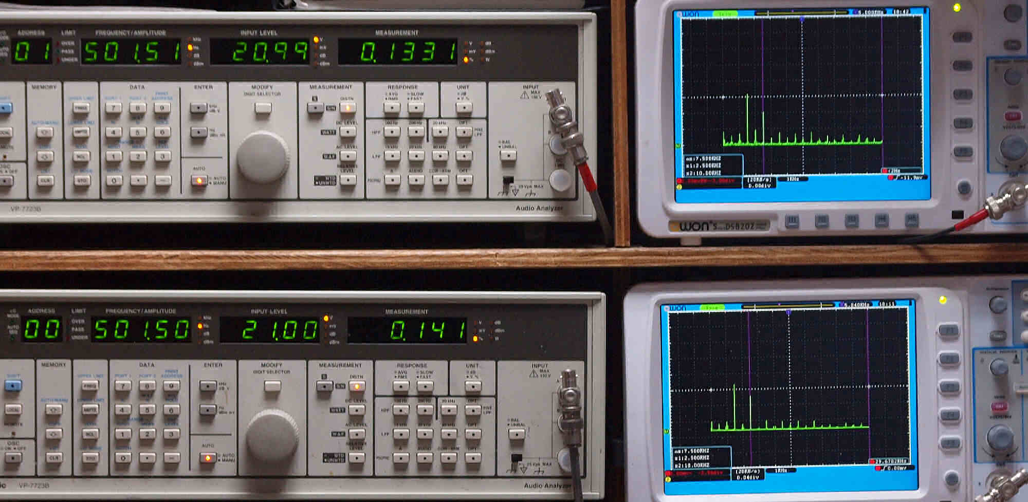 | E. 測定・調整。 画像をクリックすると、大きく(横幅2050ドット)表示されます。 E0. 出力・歪み率測定・調整 「見方」。 上段中 右側SP出力を「Audio Analyzer Panasonic VP−7723B」により測定。 表示LED、 左端=メモリーNo、 中左=周波数測定、 中右=出力電圧測定、 右端=歪み率測定。 上段右端 VP−7723Bの基本波除去出力を「owon SDS8202(200MHZ)」で「FFT分析」表示。 下段中 左側SP出力を「Audio Analyzer Panasonic VP−7723B」により測定。 表示LED、 左端=メモリーNo、 中左=周波数測定、 中右=出力電圧測定、 右端=歪み率測定。 下段右端 VP−7723Bの基本波除去出力を「owon SDS6062(200MHZ)」で「FFT分析」表示。 下段左端 オーディオ発振器 VP−7201A より50Hz〜100kHzの信号を出し(歪み率=約0.003%)、ATT+分配器を通し、AMPに入力。 よって、ダイアル設定出力レベルより低くなります。測定機器の仕様や整備の様子はこちら、「VP−7723B」「VP−7201A」。 FFT画面の見方はこちら。 |