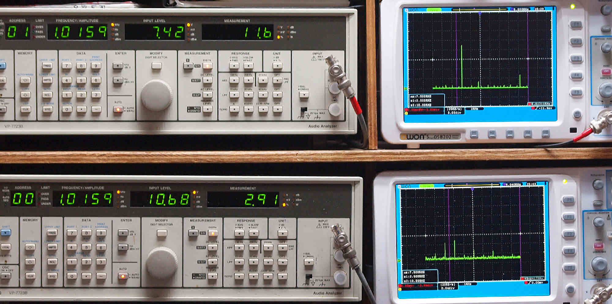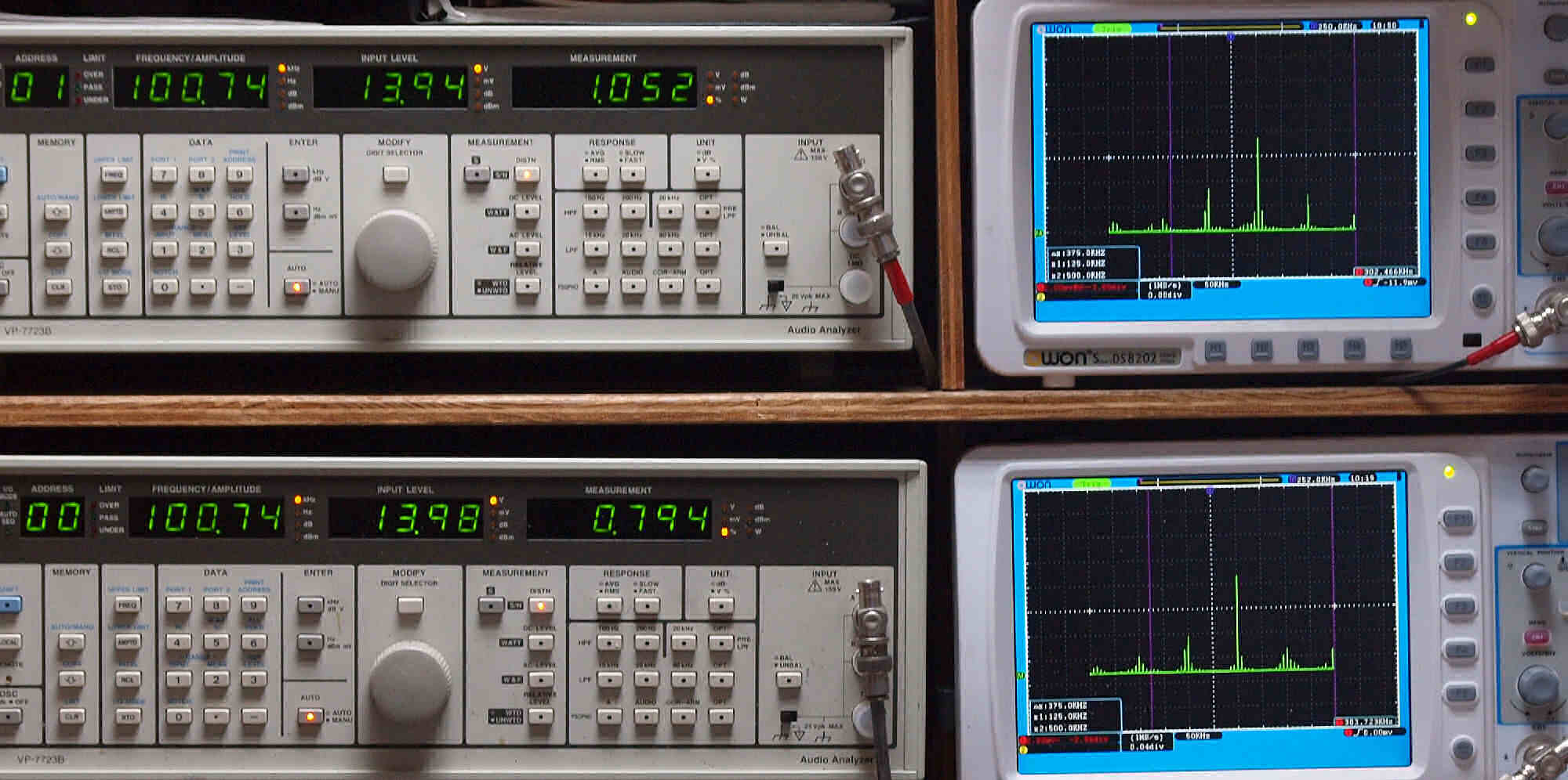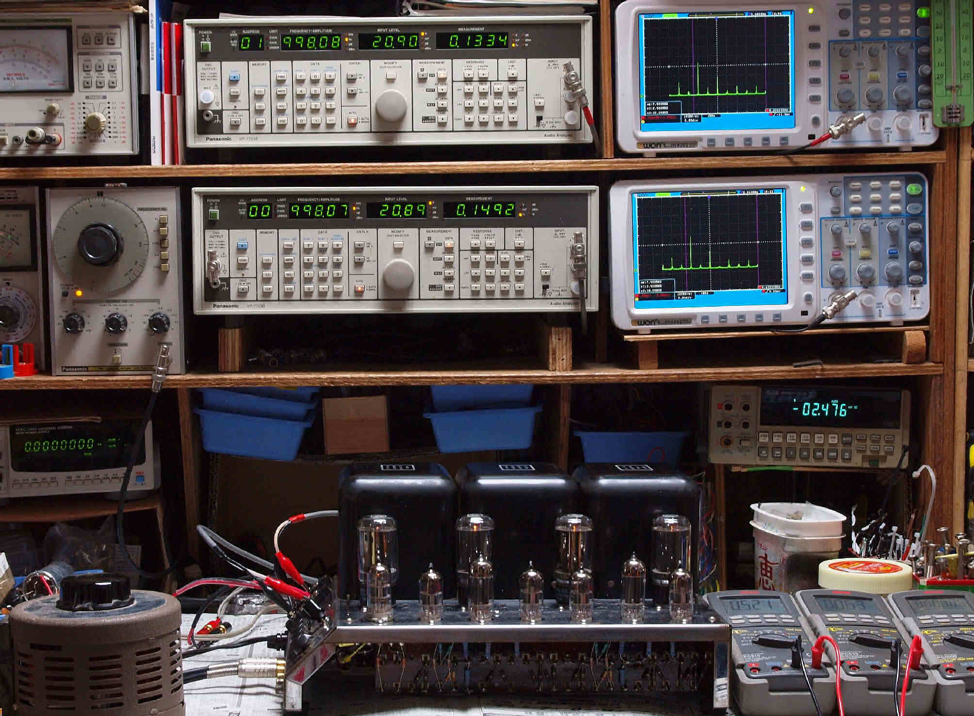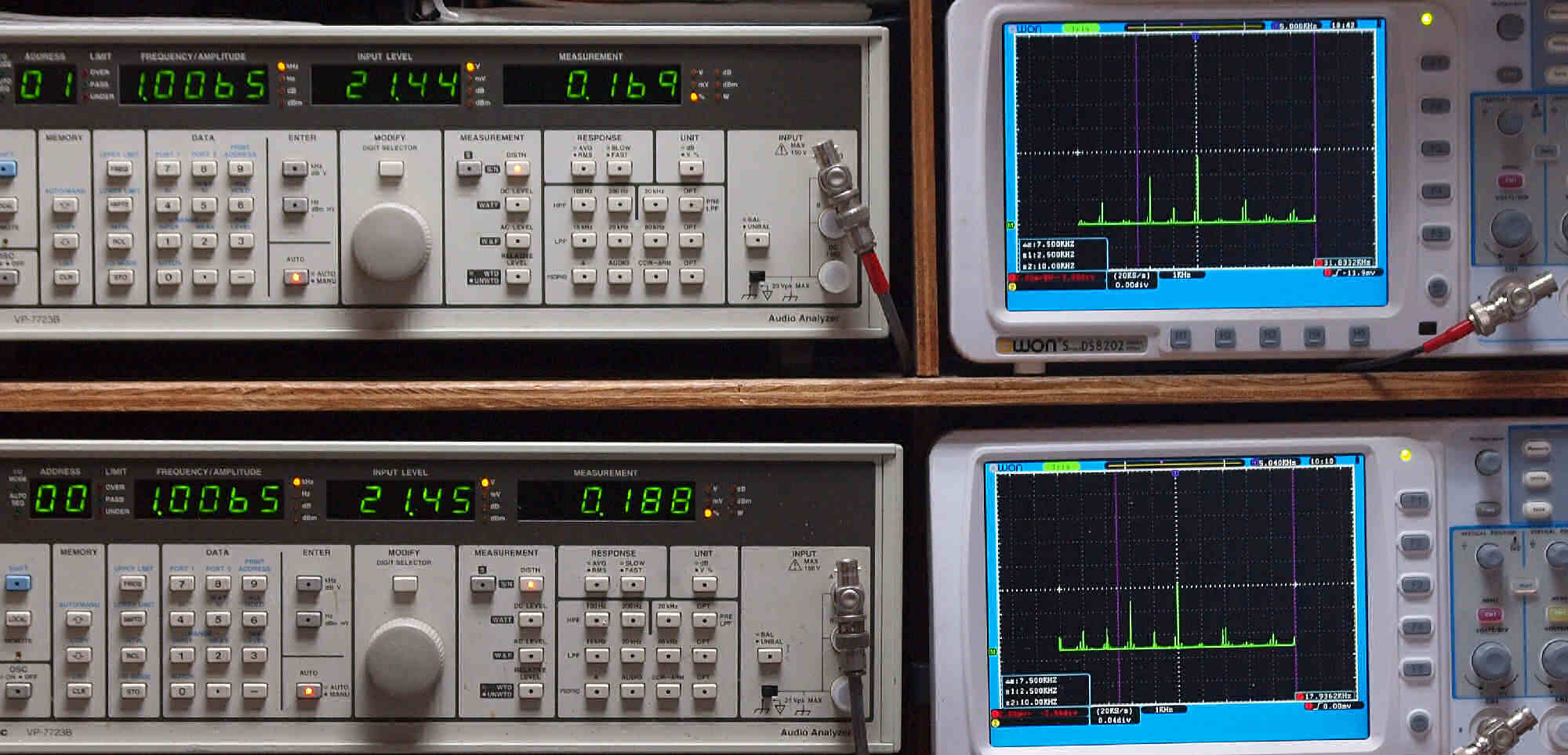 | E. 測定・調整。 画像をクリックすると、大きく(横幅2050ドット)表示されます。 E0. 出力・歪み率測定・調整 「見方」。 上段中 右側SP出力を「Audio Analyzer Panasonic VP−7723B」により測定。 表示LED、 左端=メモリーNo、 中左=周波数測定、 中右=出力電圧測定、 右端=歪み率測定。 上段右端 VP−7723Bの基本波除去出力を「owon SDS8202(200MHZ)」で「FFT分析」表示。 下段中 左側SP出力を「Audio Analyzer Panasonic VP−7723B」により測定。 表示LED、 左端=メモリーNo、 中左=周波数測定、 中右=出力電圧測定、 右端=歪み率測定。 下段右端 VP−7723Bの基本波除去出力を「owon SDS6062(200MHZ)」で「FFT分析」表示。 下段左端 オーディオ発振器 VP−7201A より50Hz〜100kHzの信号を出し(歪み率=約0.003%)、ATT+分配器を通し、AMPに入力。 よって、ダイアル設定出力レベルより低くなります。測定機器の仕様や整備の様子はこちら、「VP−7723B」「VP−7201A」。 FFT画面の見方はこちら。 |