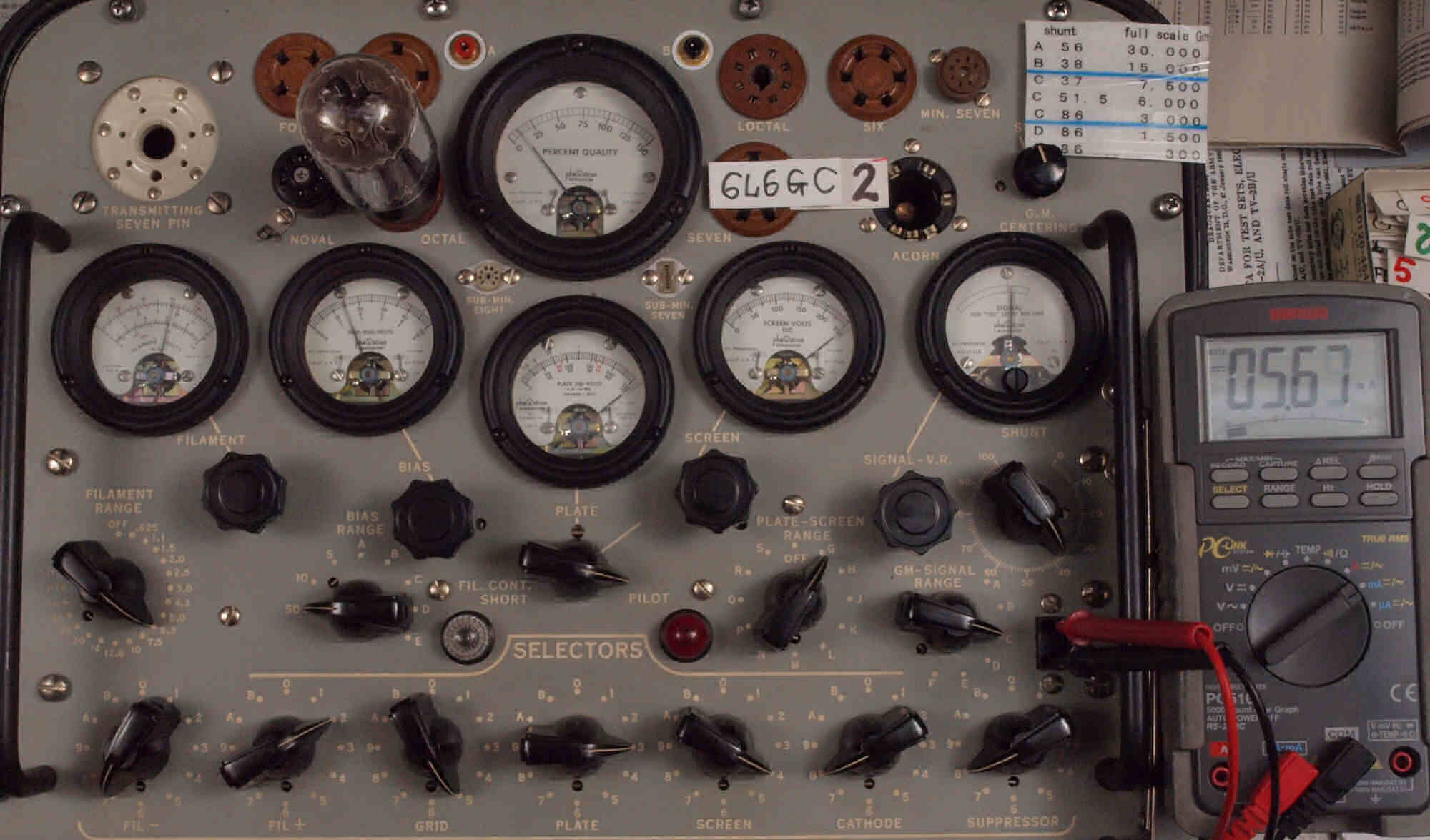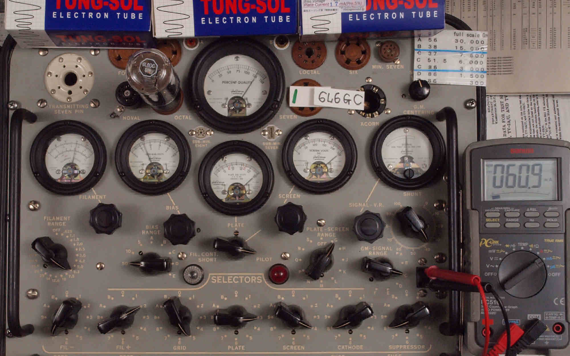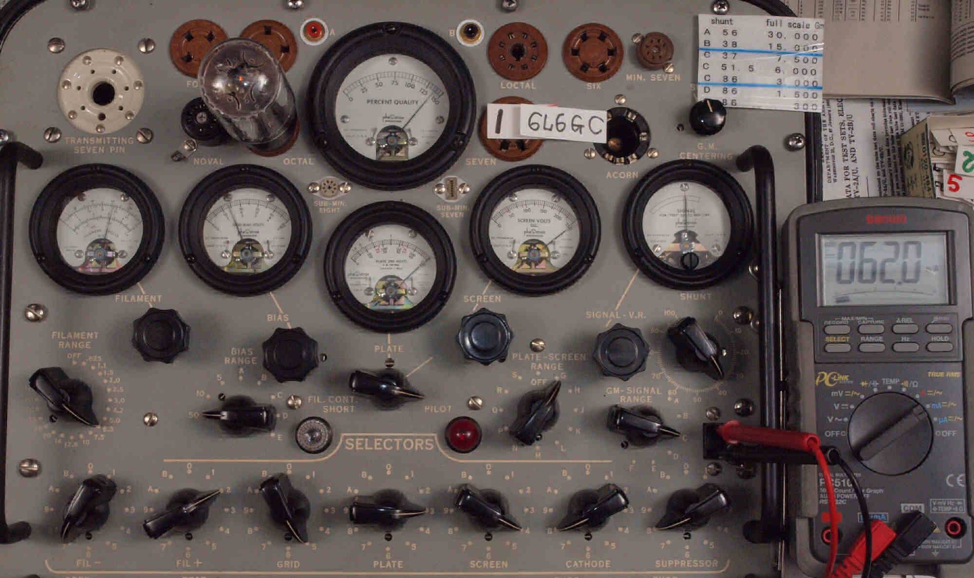 | V81. 購入真空管「6L6GC」1本目測定。 Gm=6250μmho、Ip=60.09mA。 測定条件、「Ep=250V、Esg=250V、Eg1=−14V」、Cレンジ=7500μmhoレンジでの測定。 |