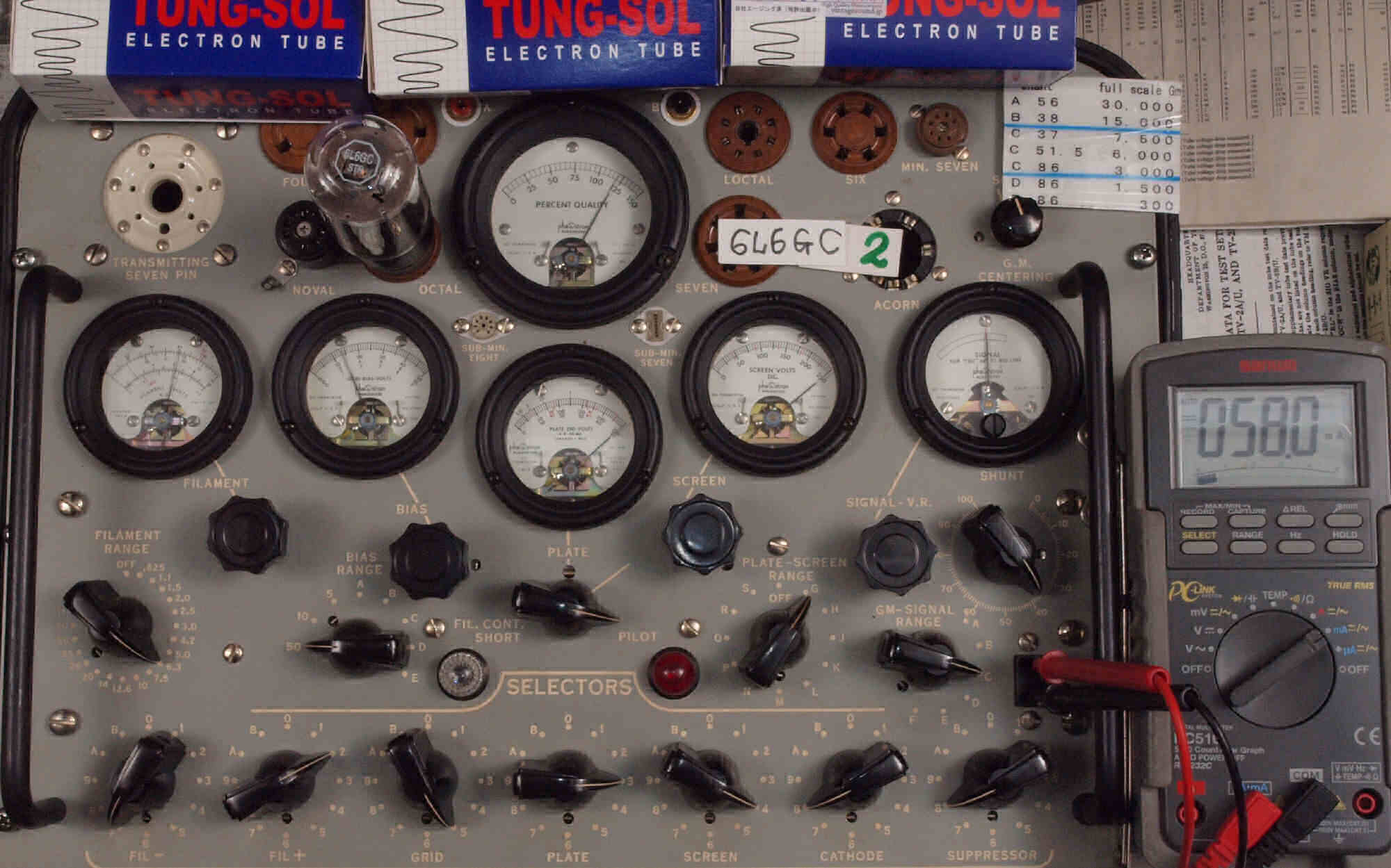 | V82. 購入真空管「6L6GC」2本目測定。 Gm=6000μmho、Ip=58.0mA。 測定条件、「Ep=250V、Esg=250V、Eg1=−14V」、Cレンジ=7500μmhoレンジでの測定。 |