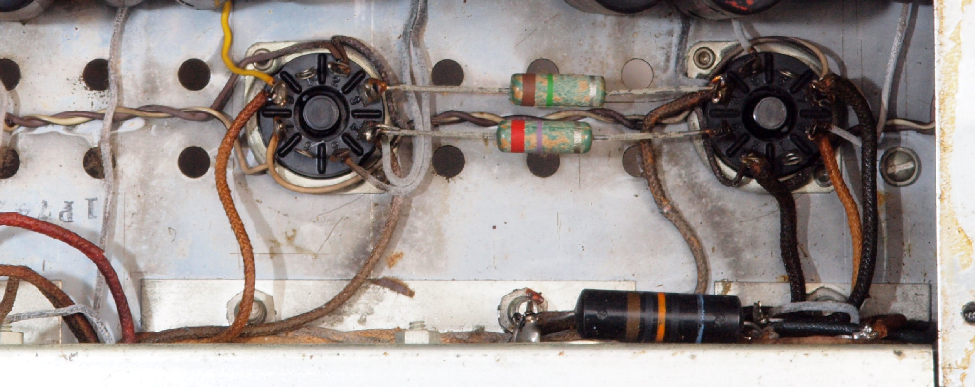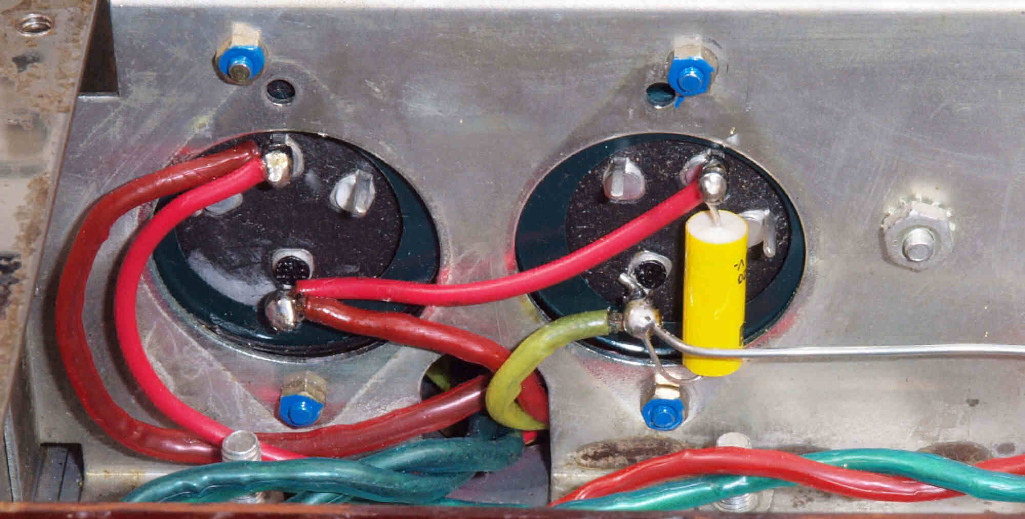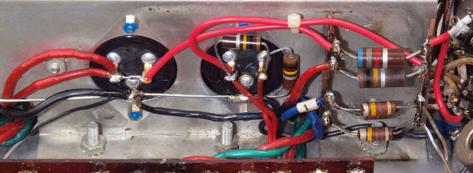 | C32. 修理後 V8−V9(6L6GC)ソケット周り配線、電解コンデンサー2個追加 | ||||||||||||||||||||||||