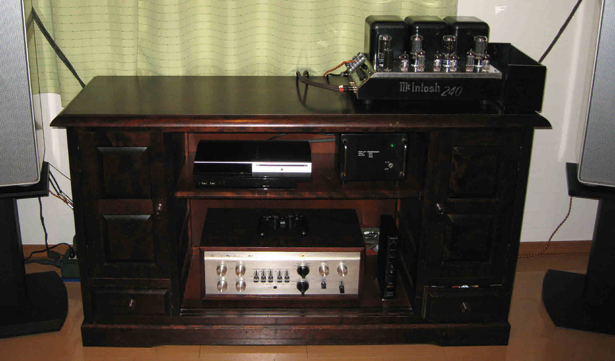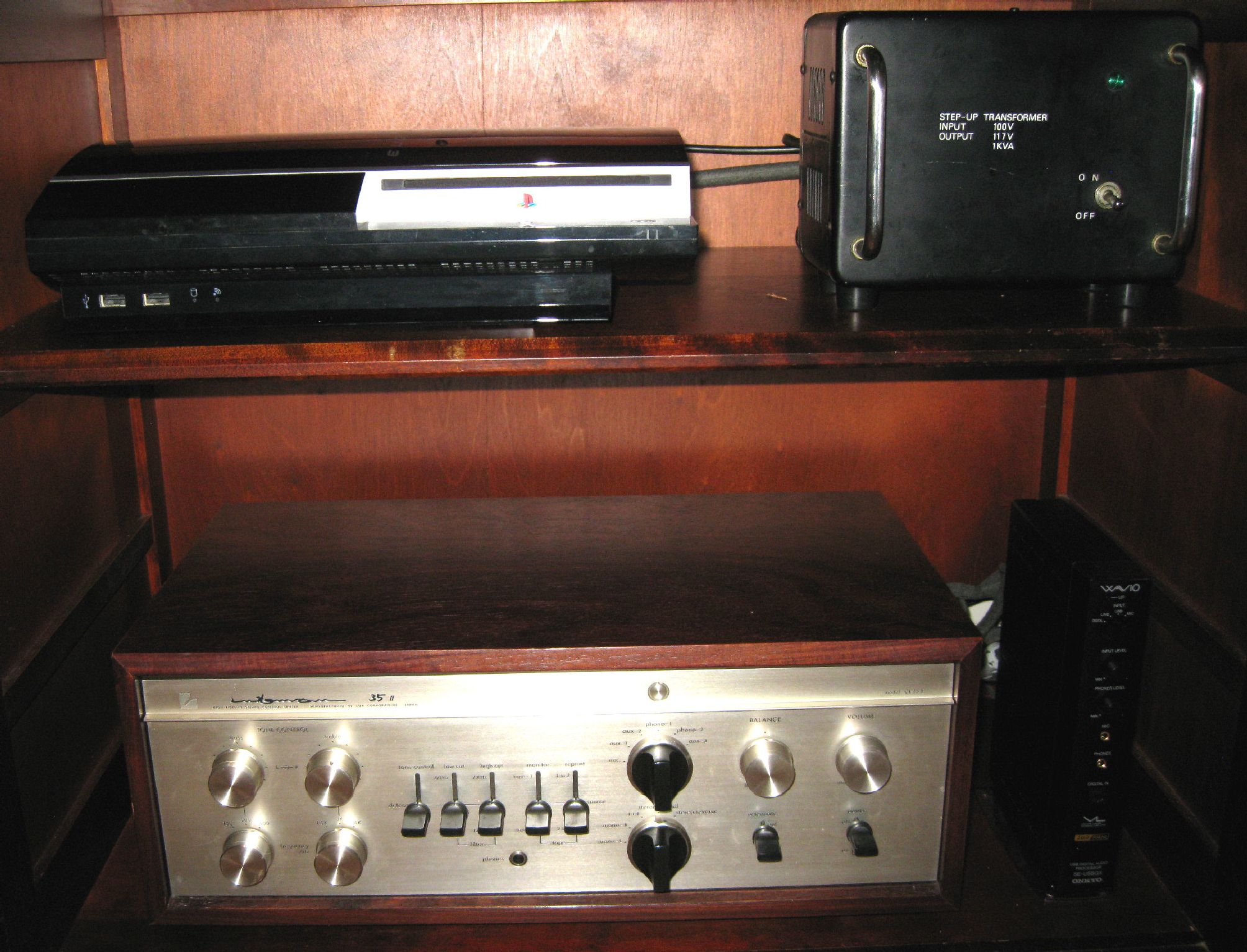 | Y4. 設置状況、プリはLUXMAN CL-35mk、上は117Vへの昇圧電源。 | ||||||||||||||||||||||||
