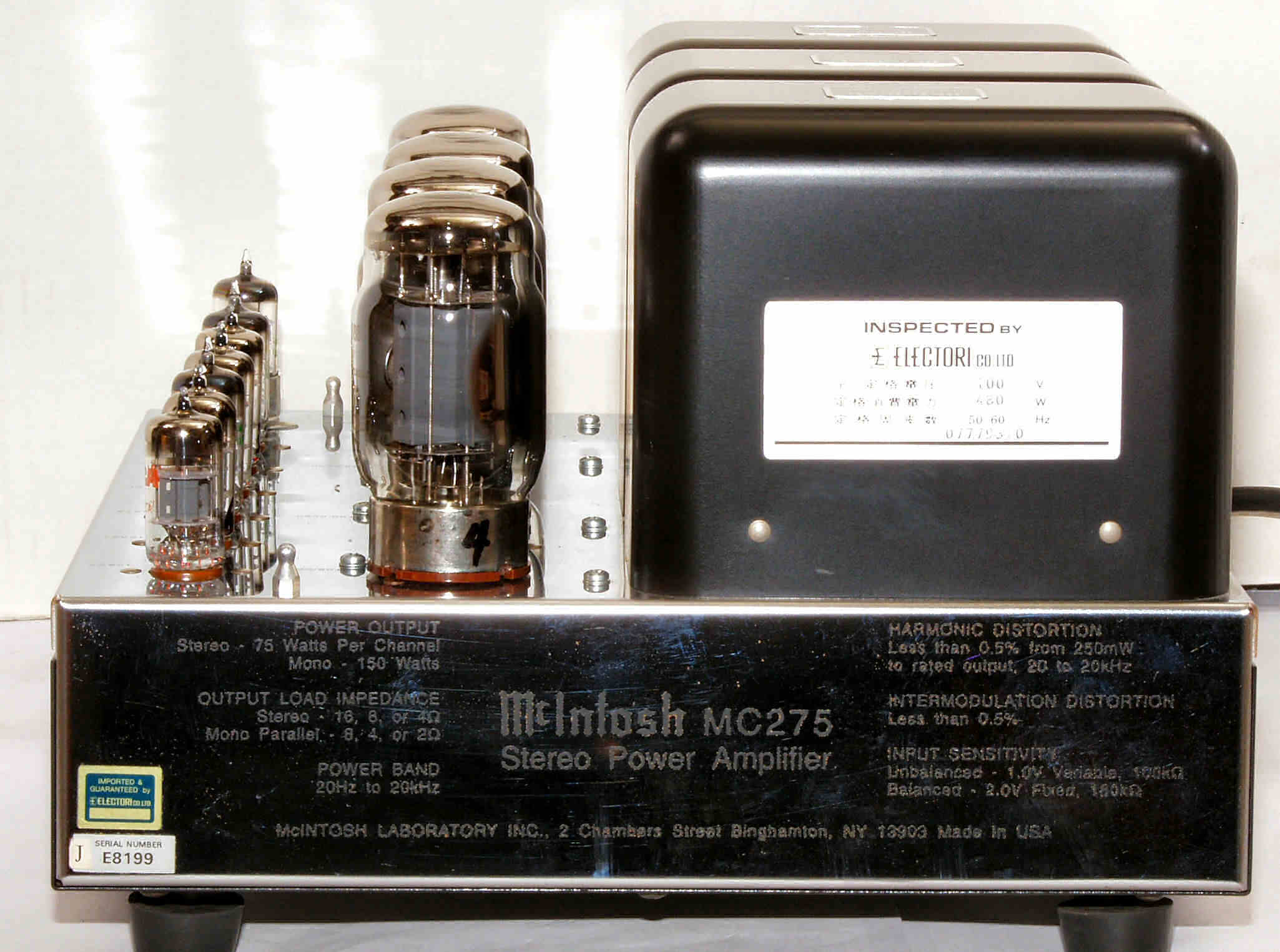 E. 調整・測定 F. 修理費 80,000円 「オーバーホール修理」 「但し、真空管は別途」 S. Mcintosh MC275 の仕様(マニアル・カタログより) このクラスのKT−88は良質な物を選択すること。 又、前段12AZ7/12AT7と直結なので、こちらも同様の配慮が必要。 |