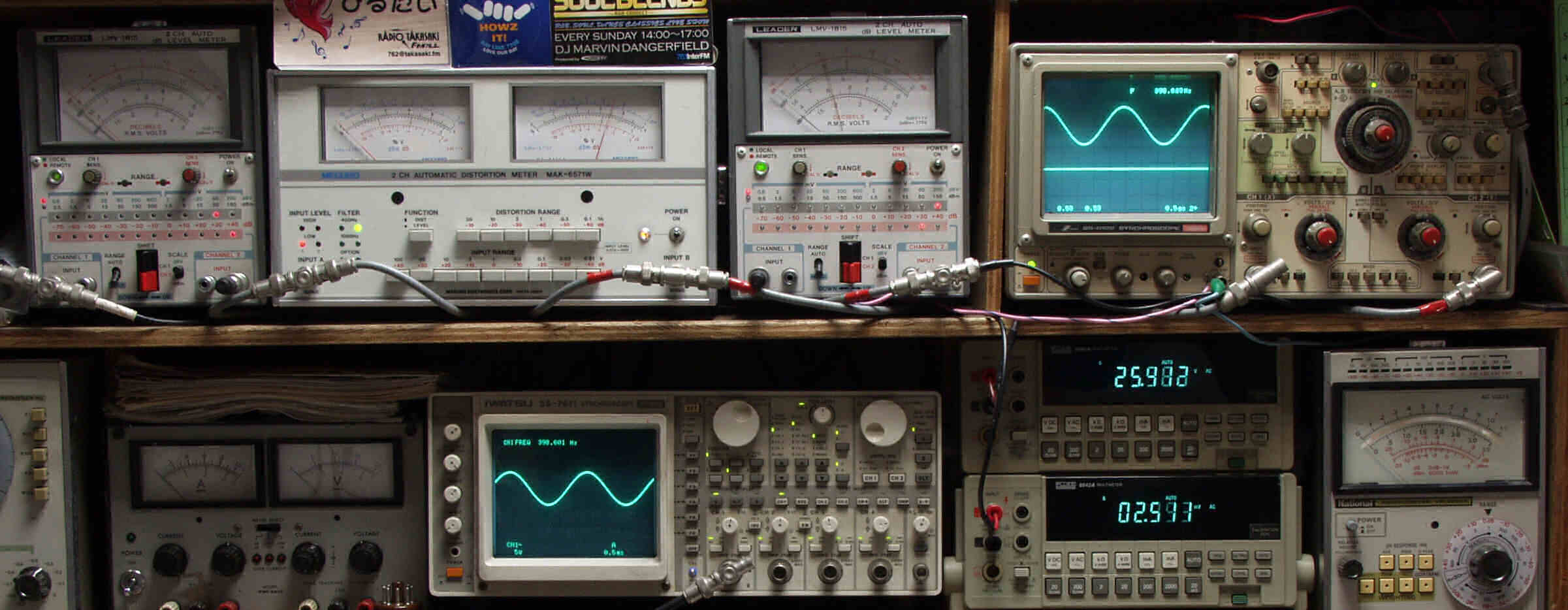 | E. 測定・調整 E1. 出力・歪み率測定・調整 <見方> 下段左端 オーディオ発振器より400HZ・1KHZの信号を出し(歪み率=約0.003%)これをAMPに入力し、SP出力を測定 下段中左 オシロ=入力波形(オーディオ発振器のTTLレベル) 下段中右上=周波数計 上段左端 電圧計=L側SP出力電圧測定、黒針のみ使用 上段中左 歪み率計=SP出力の歪み率測定 左メータ=L出力、右メータ=R出力 上段中右 電圧計=R側SP出力電圧測定、赤針のみ使用 上段右端 オシロ=SP出力波形 上=R出力、下=L出力(実際にはRL電圧計の出力「Max1V」を観測) 下段中右上 デジタル電圧計=SP出力電圧測定RLは切り替えて測定 |
