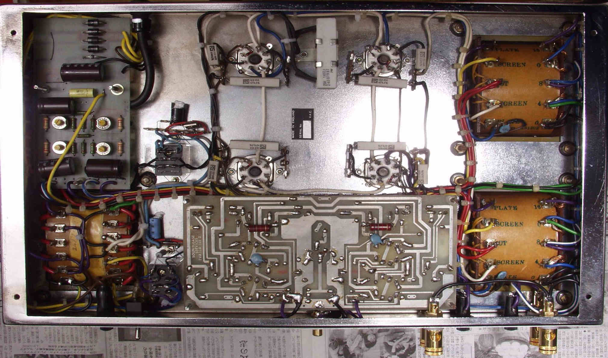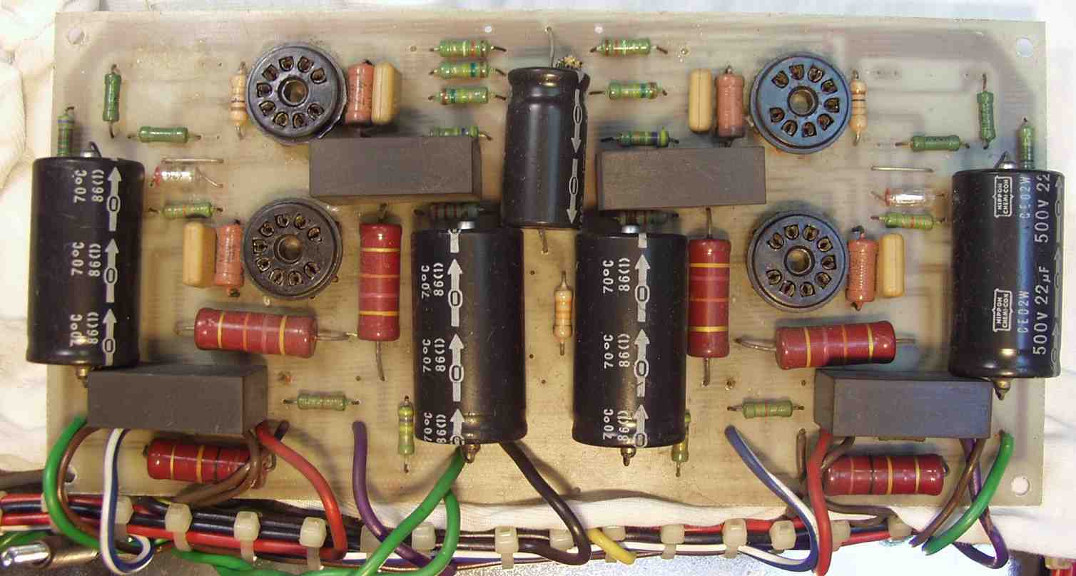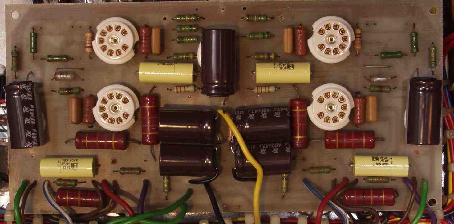 | C1B. 修理後 前段AMP基板 真空管ソケット4個、電解コンデンサー5個、フイルムコンデンサー4個交換 | ||||||||||||||||||||||
