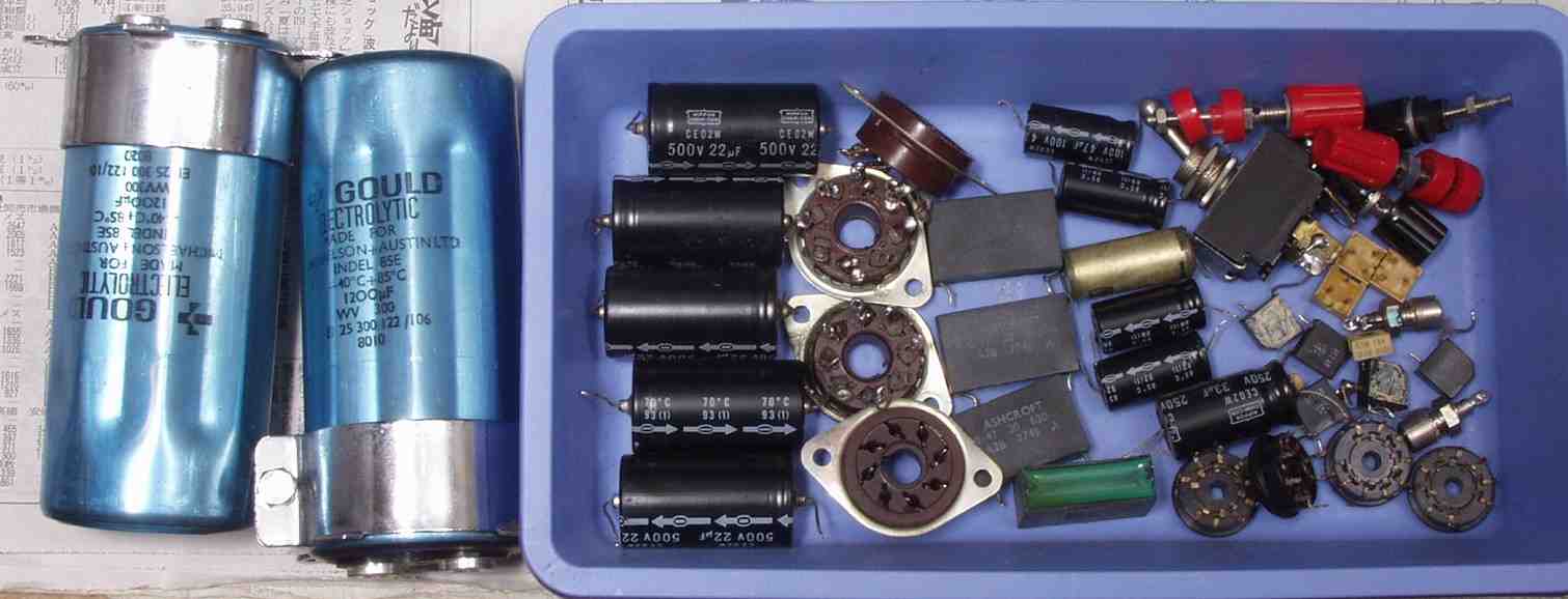 | A4. 修理前の点検、 KT−88のソケット比較 中=交換するステアタイト製、両側=古いモールド製 | ||||||||||||||||||||||