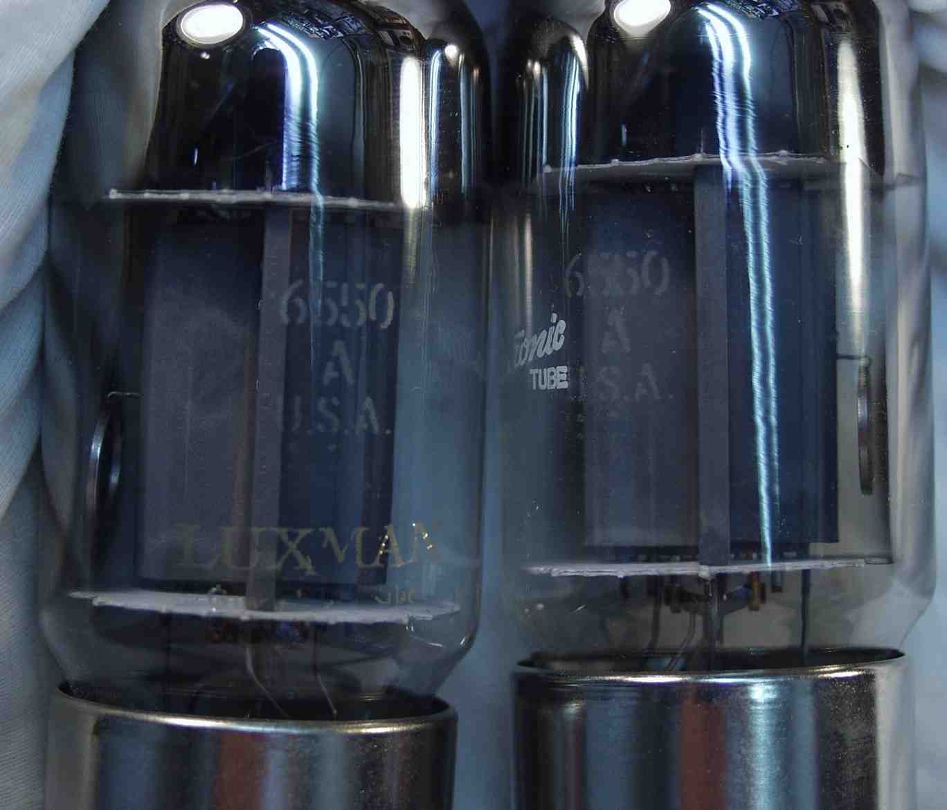 | A6B. 修理前の点検、 使われていた終段6550A L側 プレートの色が異なる。 過大電流で赤熱するとこの様になる | ||||||||||||||||||||||