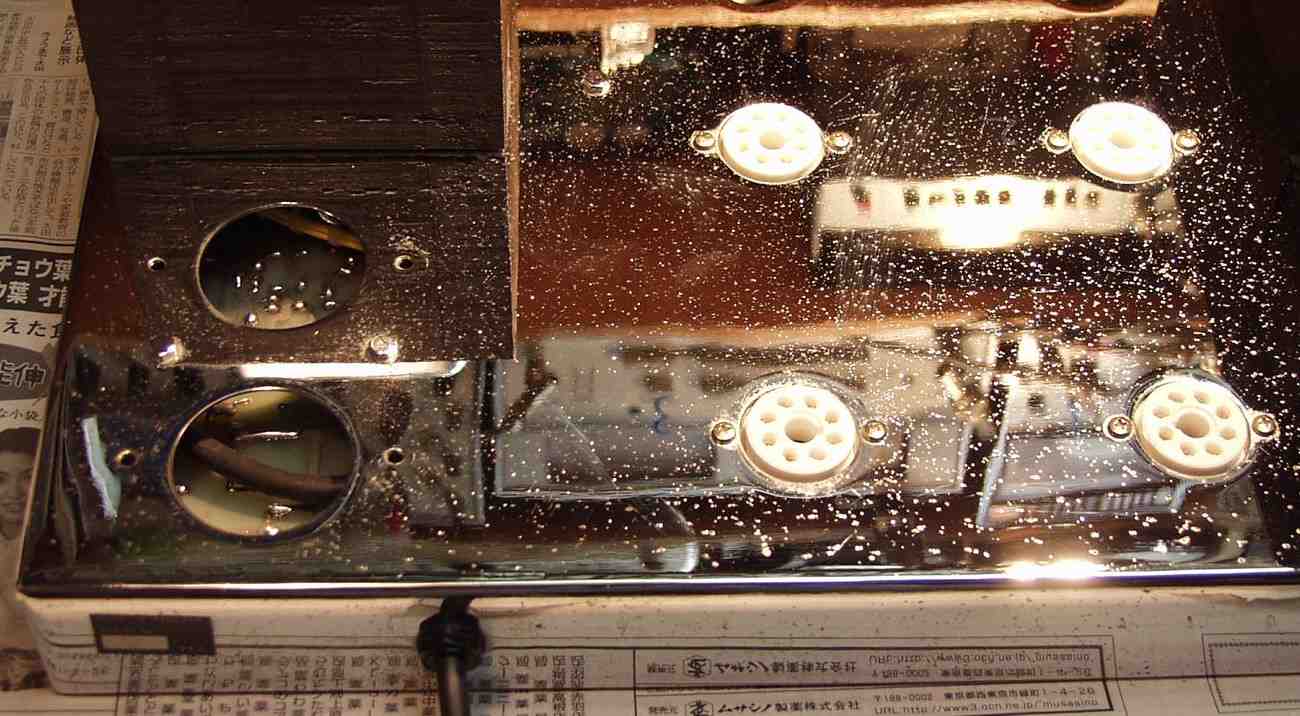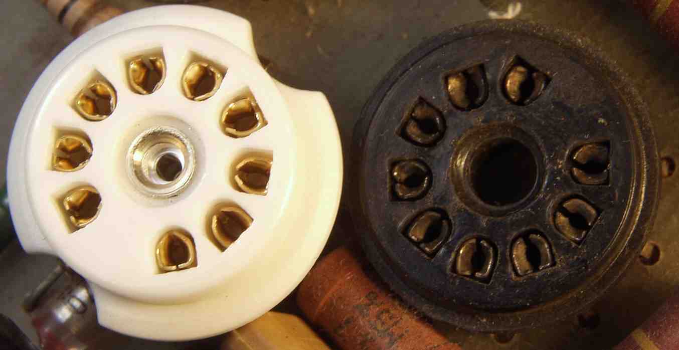 | C1A1. 修理前 前段AMP基板 真空管ソケットの比較 左=交換するステアタイト製、右=古いモールド製 | ||||||||||||||||||||||