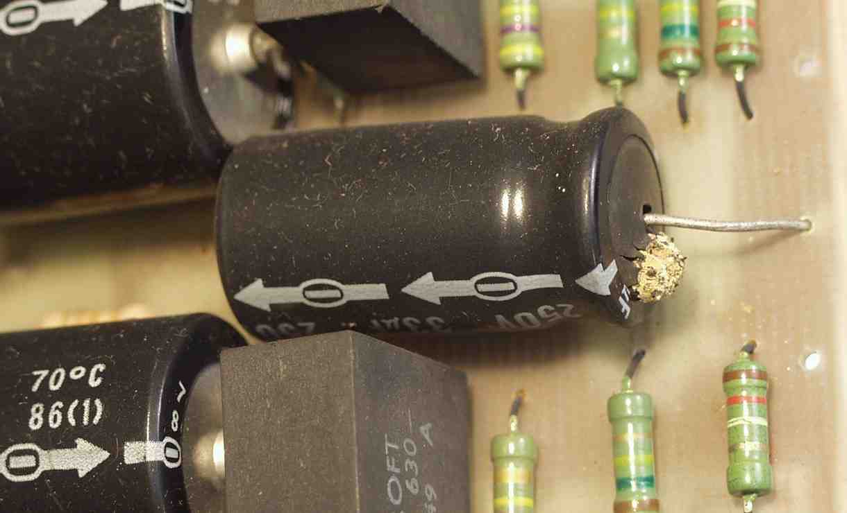 | C1A2. 修理前 前段AMP基板 液漏れした電解コンデンサー | ||||||||||||||||||||||