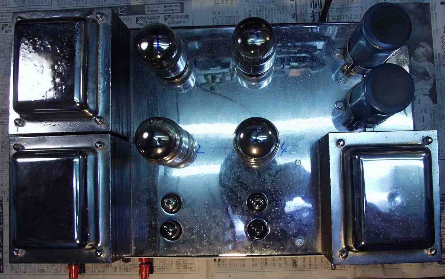 | A6A. 修理前の点検、 使われていた終段6550A R側 プレートの色が異なる。 過大電流で赤熱するとこの様になる | ||||||||||||||||||||||