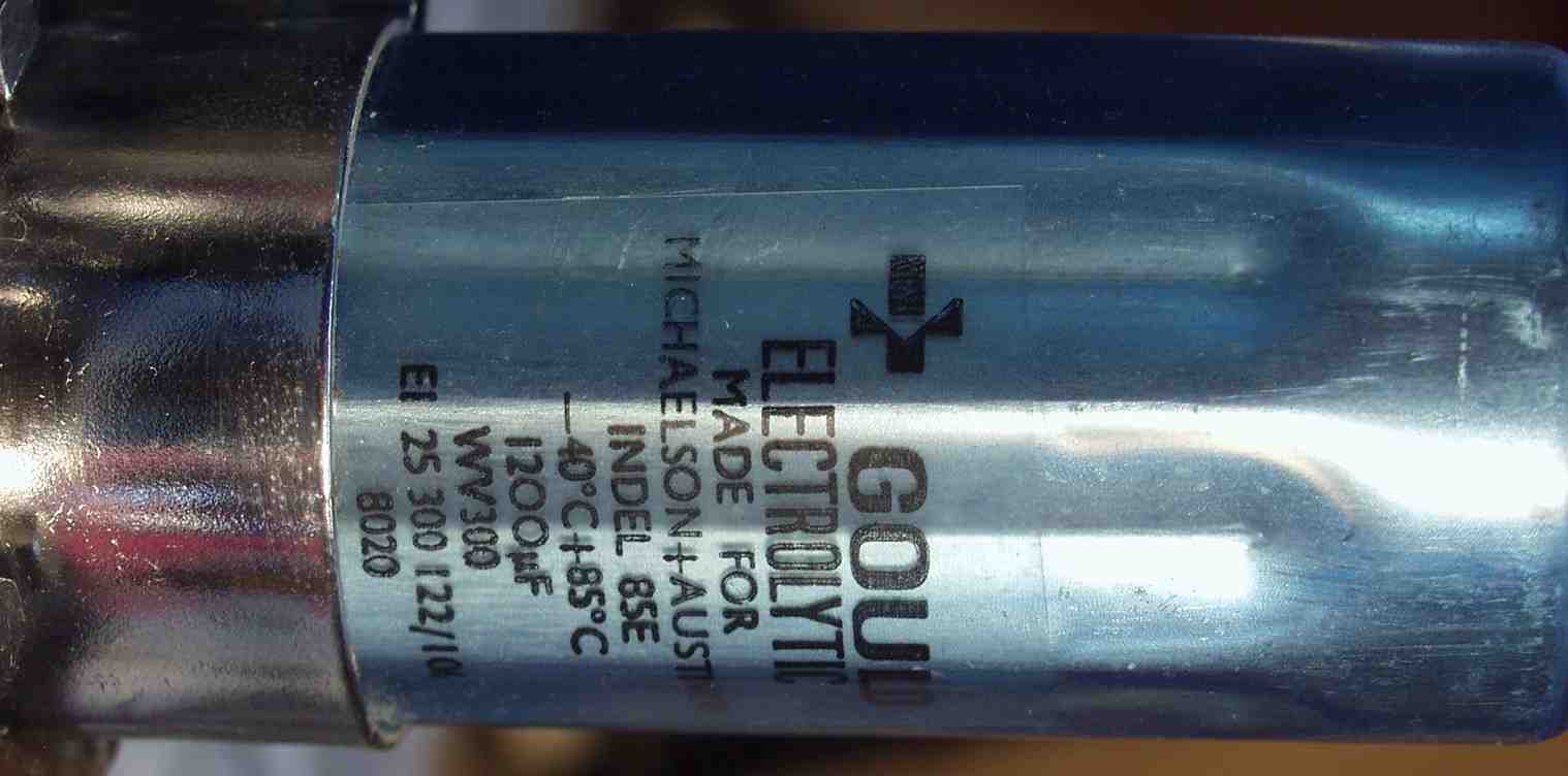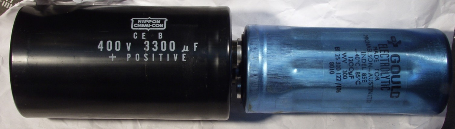 | C5A. 修理中 電解コンデンサーの比較 左=検討中の 3300μ/400WV 右=付いていた物 1200μ/300WV 但し、電源投入時のラッシュ・カーレント保護回路が必要 最終に使用したのは3900μ/400WV |