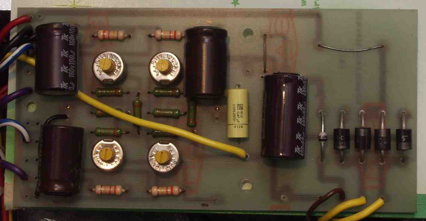 | C2B. 修理後 整流・バイアス基盤 整流ダイオード5個、半固定VR4個、電解コンデンサー5個、フイルムコンデンサー交換 | ||||||||||||||||||||||