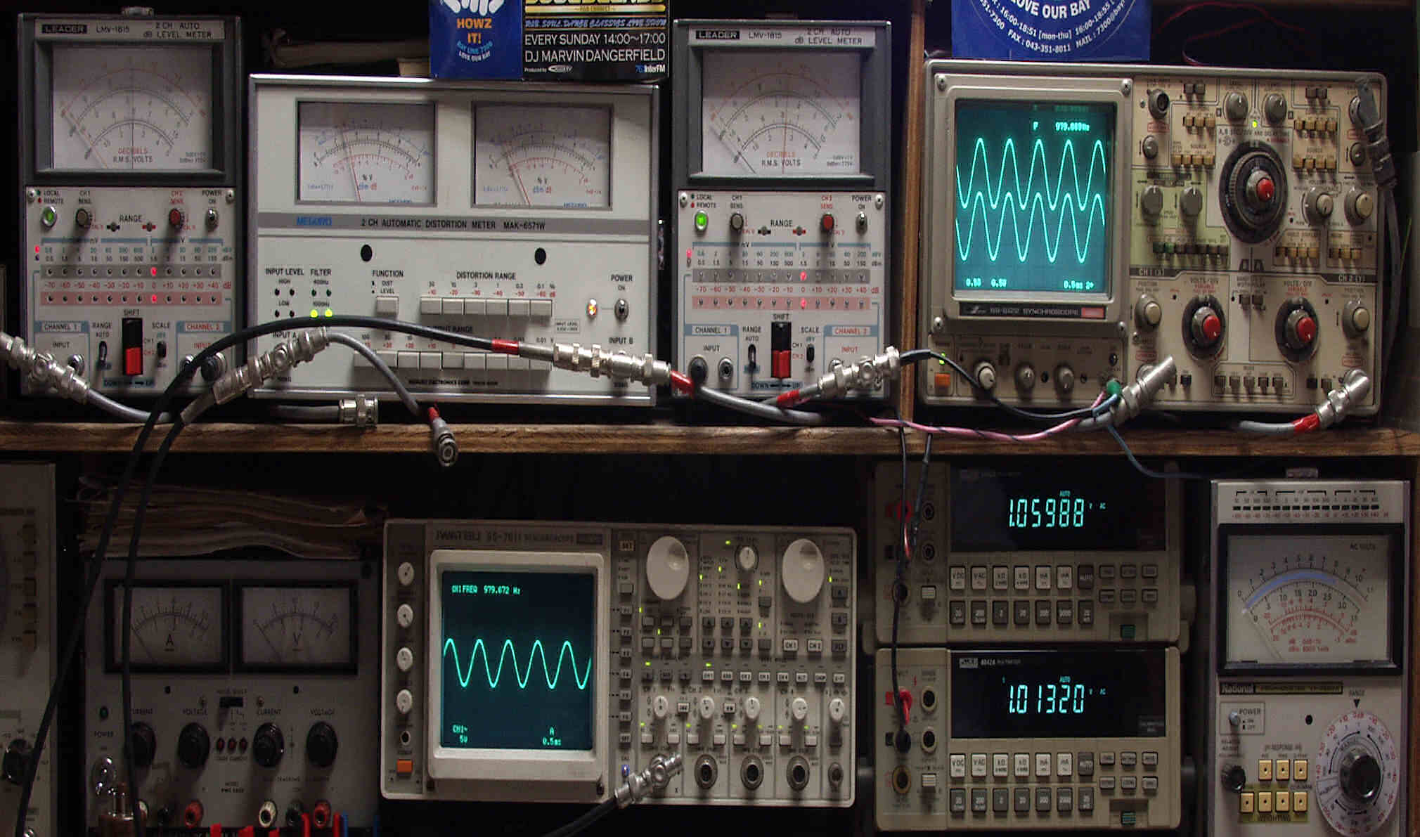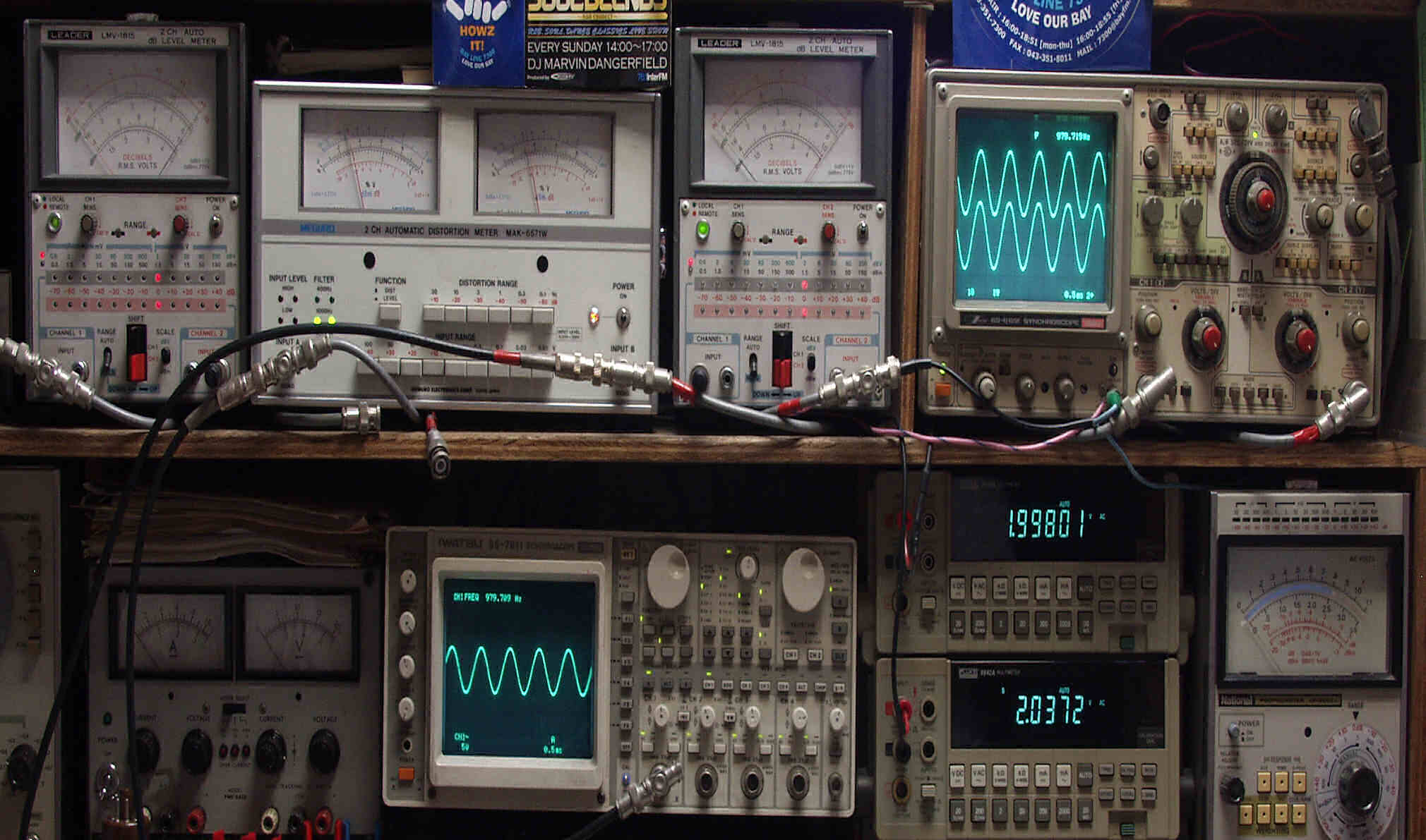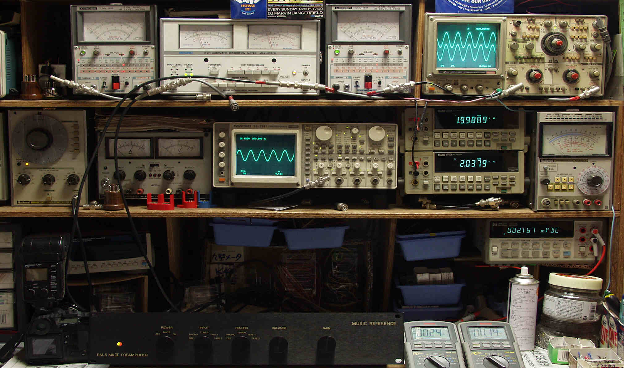 上段中左 歪み率計=出力の歪み率測定 左メータ=L出力、右メータ=R出力