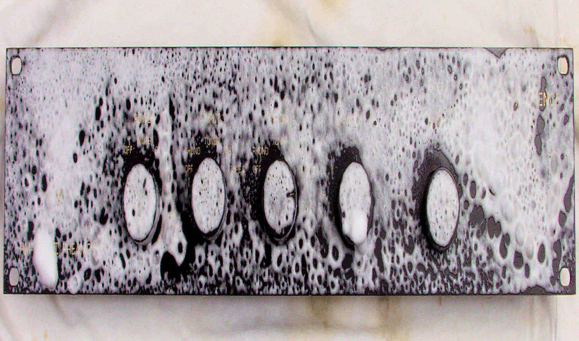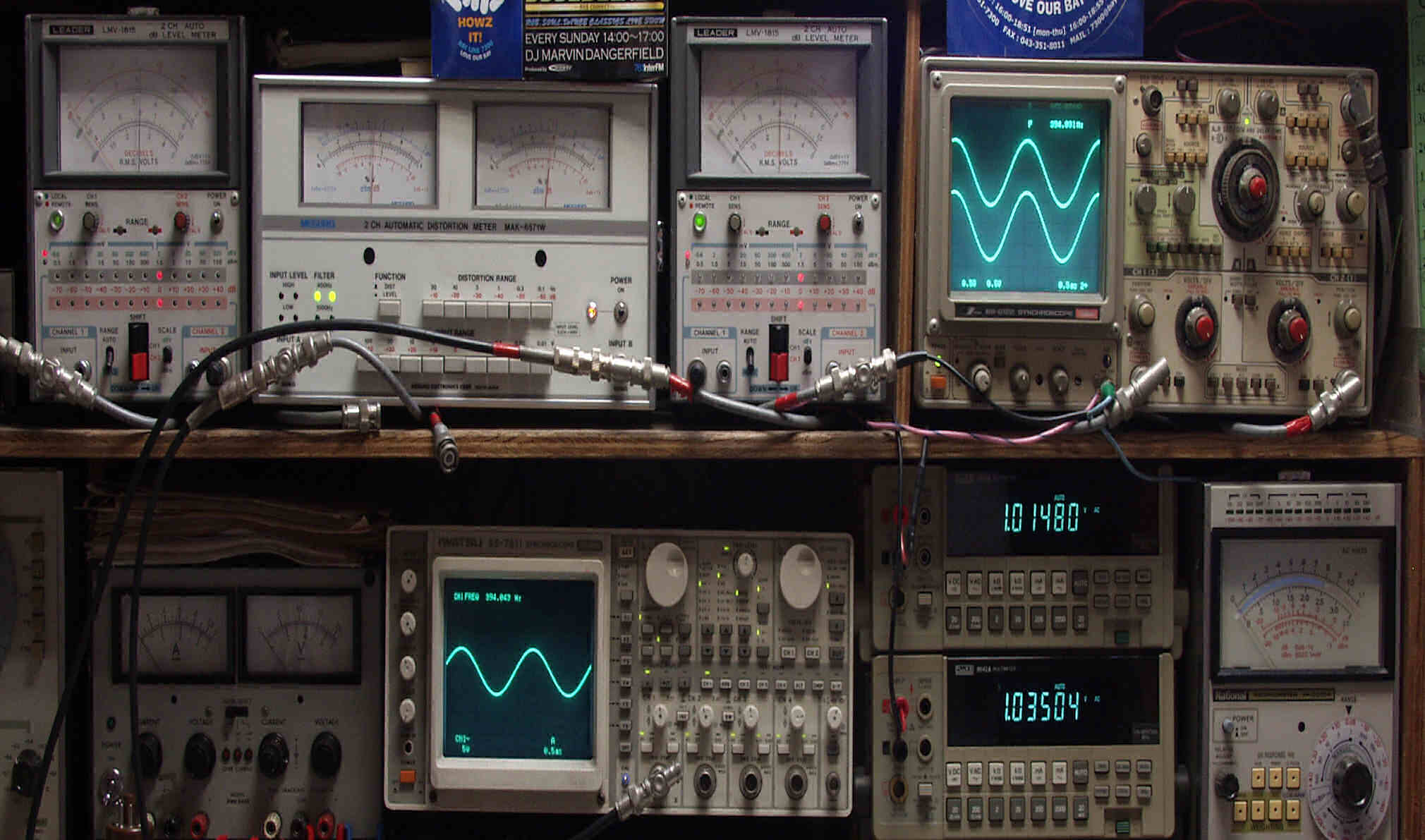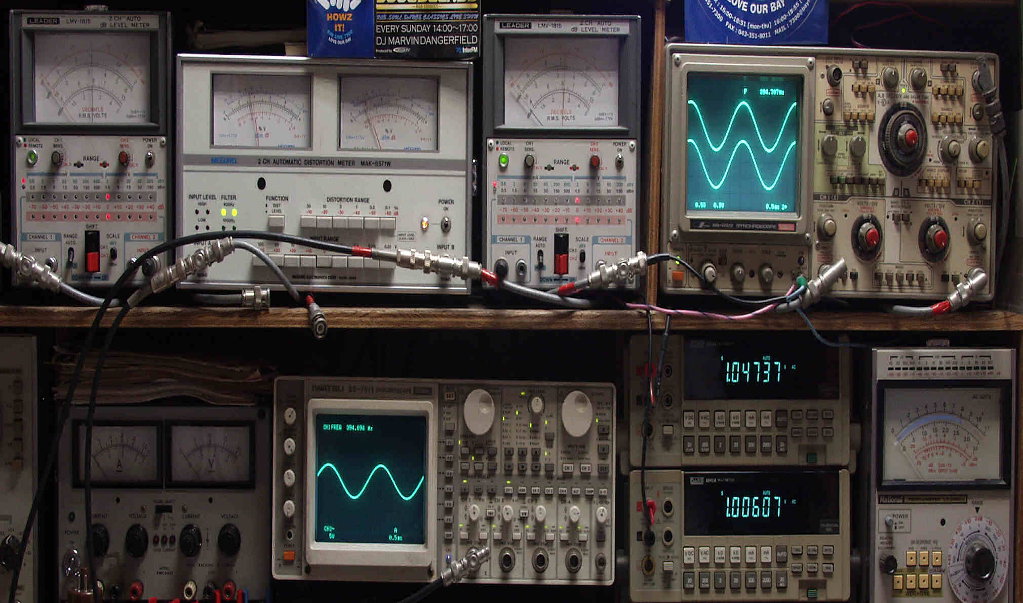 上段中左 歪み率計=出力の歪み率測定 左メータ=L出力、右メータ=R出力