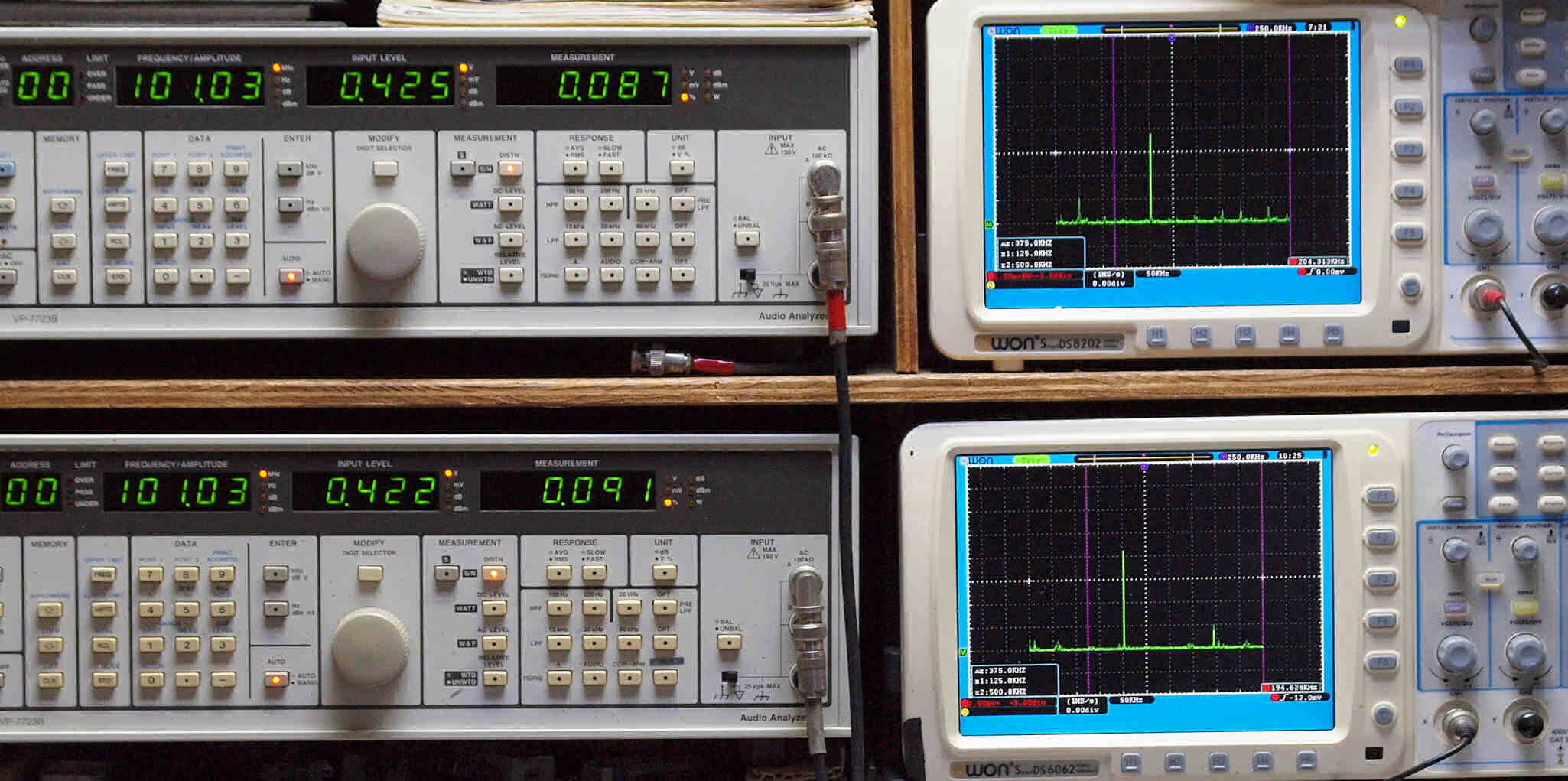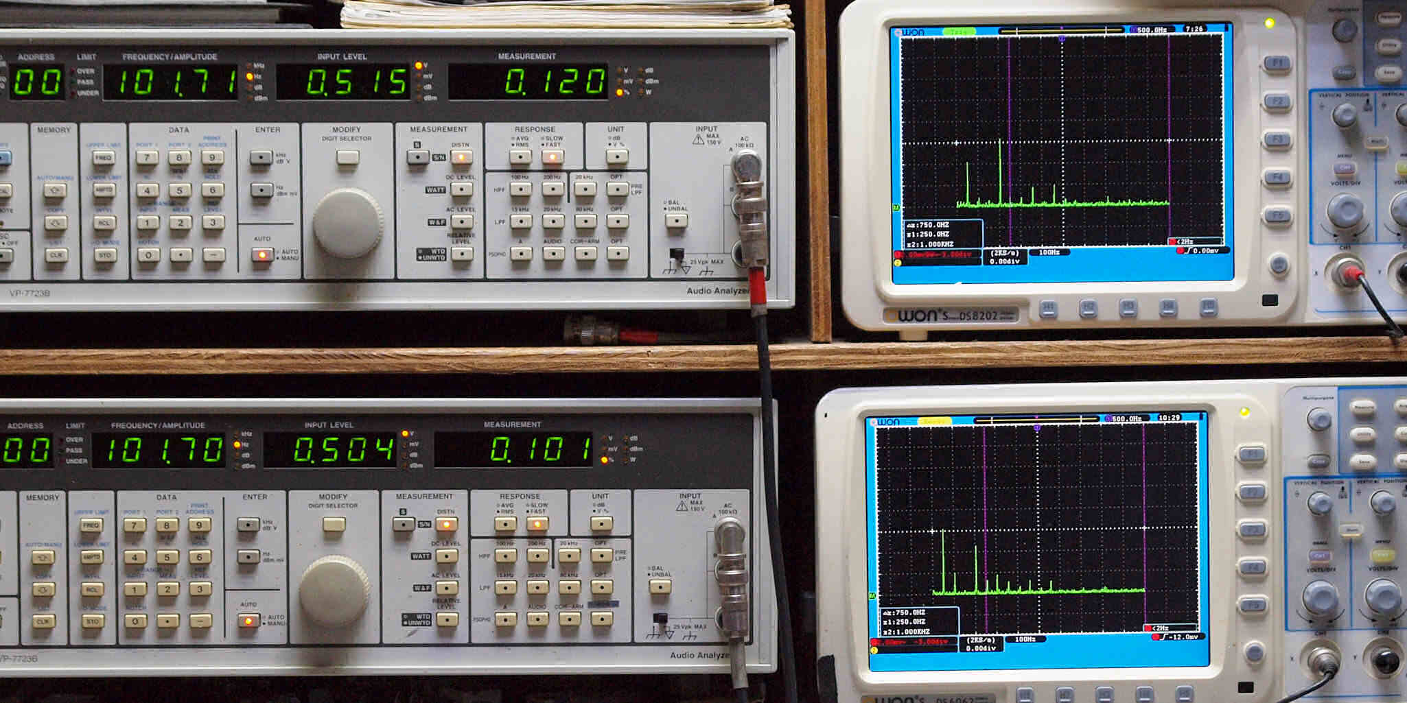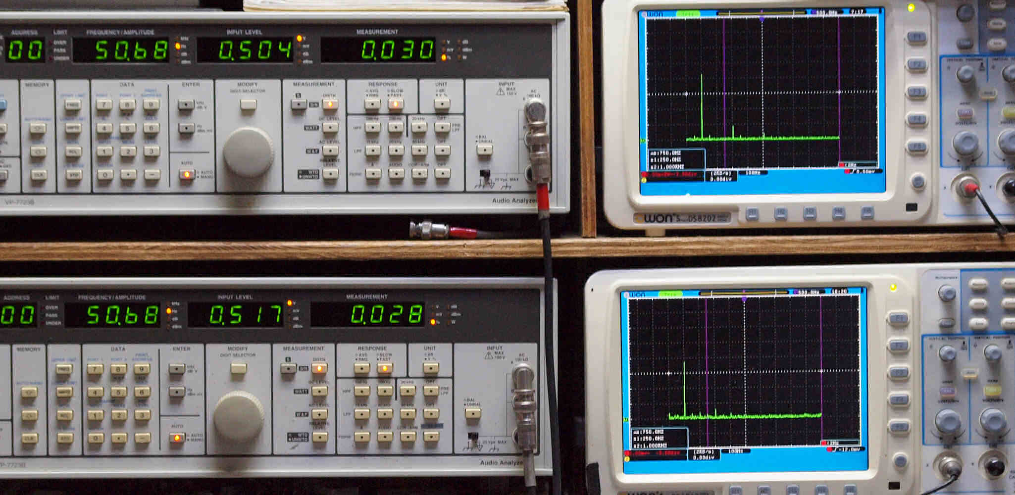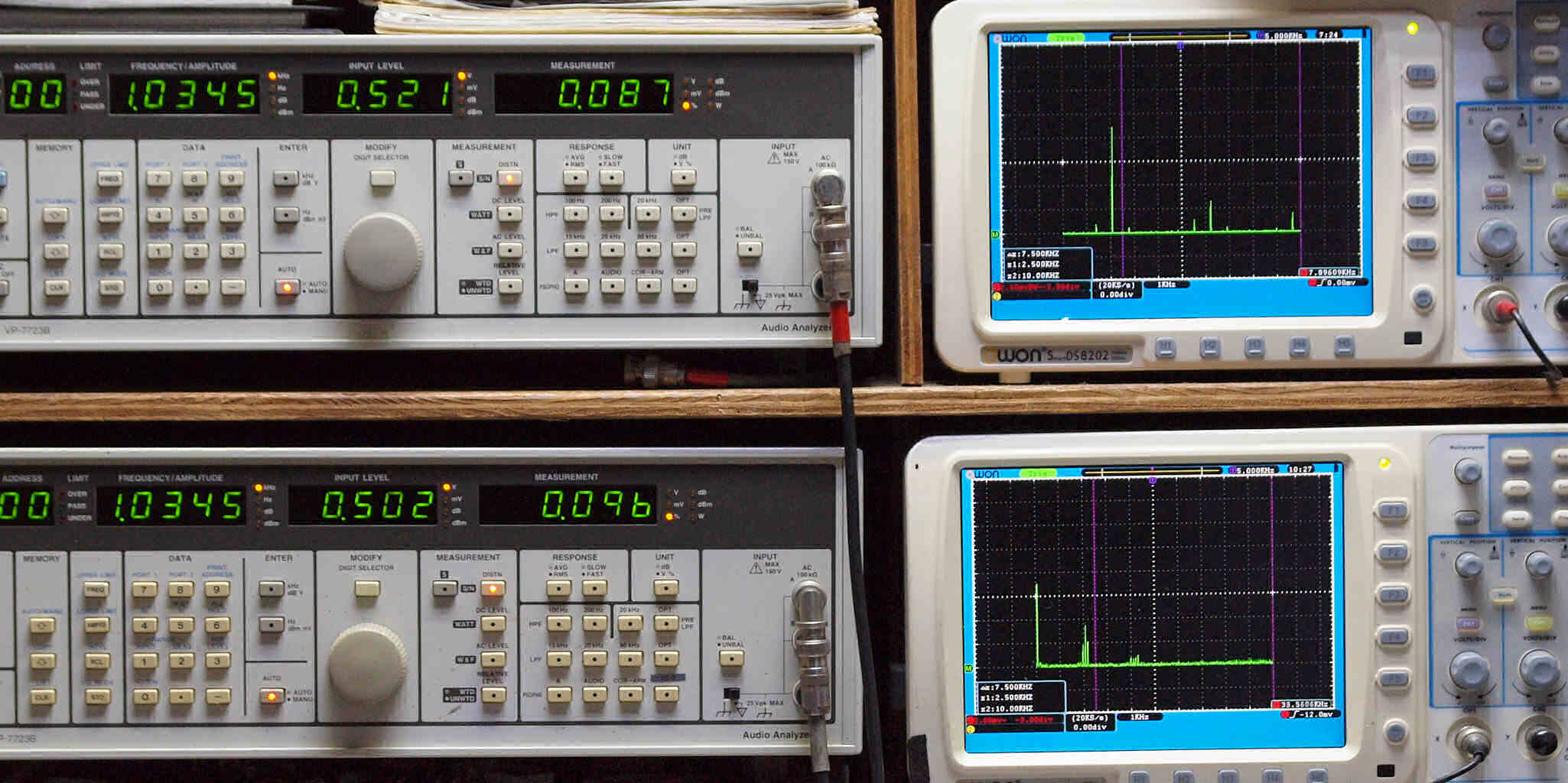| E. 調整・測定。 画像をクリックすると、大きく(横幅2050ドット)表示されます。 E0. 出力、歪み調整・測定、電源電圧は100Vにて測定 「見方」。 上段中 右側5V出力を「Audio Analyzer Panasonic VP−7723B」により測定。 表示LED、 左端=メモリーNo、 中左=周波数測定、 中右=出力電圧測定、 右端=歪み率測定。 上段右端 VP−7723Bの基本波除去出力を「owon SDS8202(200MHZ)」で「FFT分析」表示。 下段中 左側5V出力を「Audio Analyzer Panasonic VP−7723B」により測定。 表示LED、 左端=メモリーNo、 中左=周波数測定、 中右=出力電圧測定、 右端=歪み率測定。 下段右端 VP−7723Bの基本波除去出力を「owon SDS6062(200MHZ)」で「FFT分析」表示。 下段左端 オーディオ発振器 VP−7201A より50Hz〜100kHzの信号を出し(歪み率=約0.003%)、ATT+分配器を通し、AMPに入力。 よって、ダイアル設定出力レベルより低くなります。測定機器の仕様や整備の様子はこちら、「VP−7723B」「VP−7201A」。 FFT画面の見方はこちら。 |