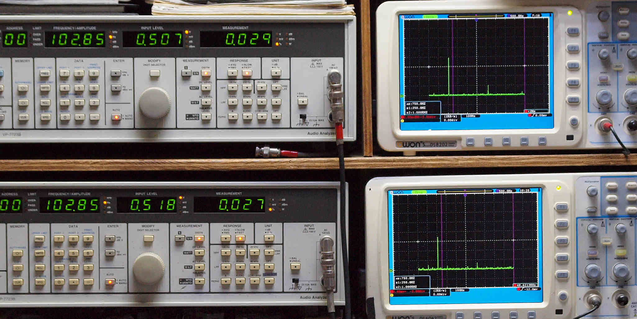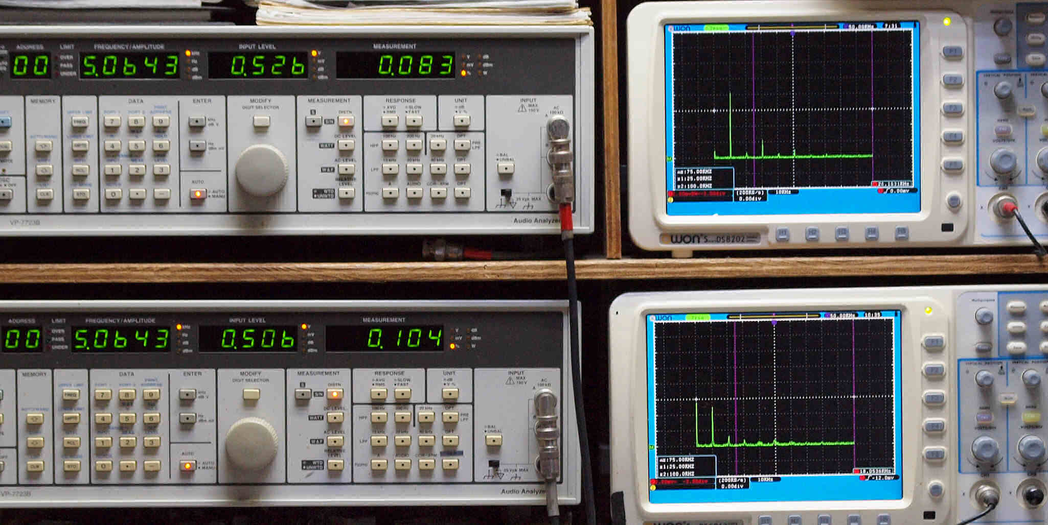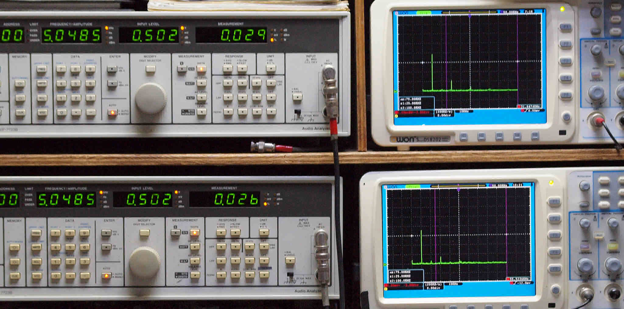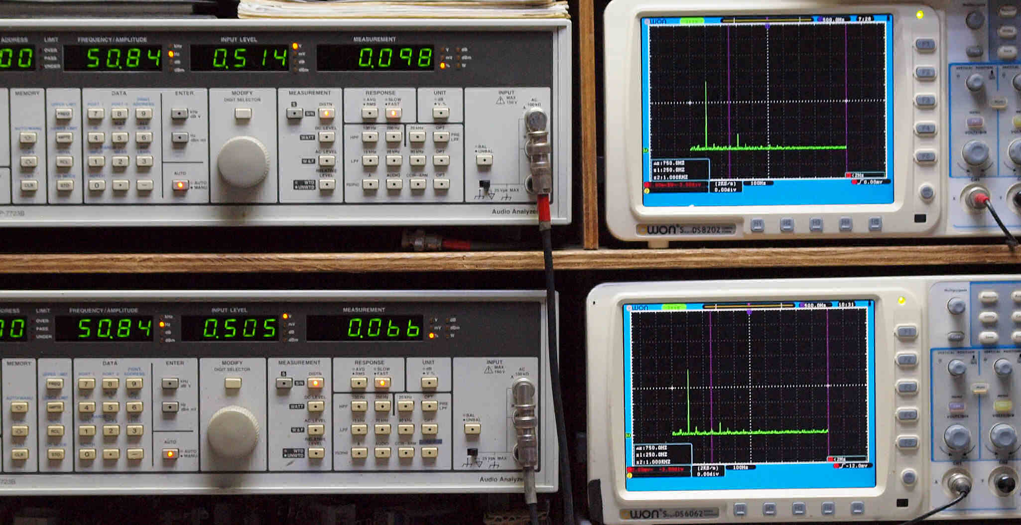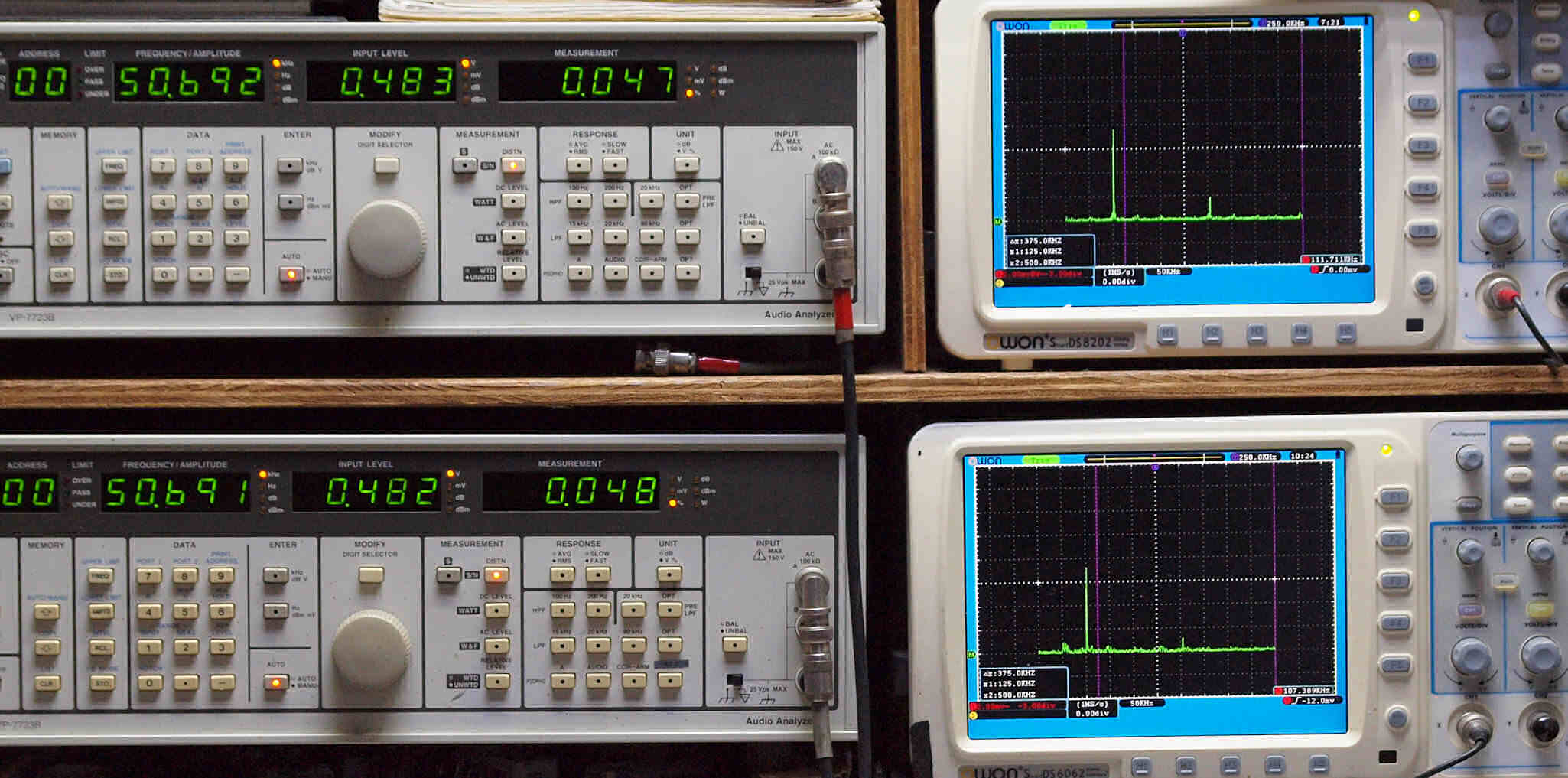 | E. 調整・測定。 画像をクリックすると、大きく(横幅2050ドット)表示されます。 E0. 出力、歪み調整・測定、電源電圧は100Vにて測定 「見方」。 上段中 右側5V出力を「Audio Analyzer Panasonic VP−7723B」により測定。 表示LED、 左端=メモリーNo、 中左=周波数測定、 中右=出力電圧測定、 右端=歪み率測定。 上段右端 VP−7723Bの基本波除去出力を「owon SDS8202(200MHZ)」で「FFT分析」表示。 下段中 左側5V出力を「Audio Analyzer Panasonic VP−7723B」により測定。 表示LED、 左端=メモリーNo、 中左=周波数測定、 中右=出力電圧測定、 右端=歪み率測定。 下段右端 VP−7723Bの基本波除去出力を「owon SDS6062(200MHZ)」で「FFT分析」表示。 下段左端 オーディオ発振器 VP−7201A より50Hz〜100kHzの信号を出し(歪み率=約0.003%)、ATT+分配器を通し、AMPに入力。 よって、ダイアル設定出力レベルより低くなります。測定機器の仕様や整備の様子はこちら、「VP−7723B」「VP−7201A」。 FFT画面の見方はこちら。 |