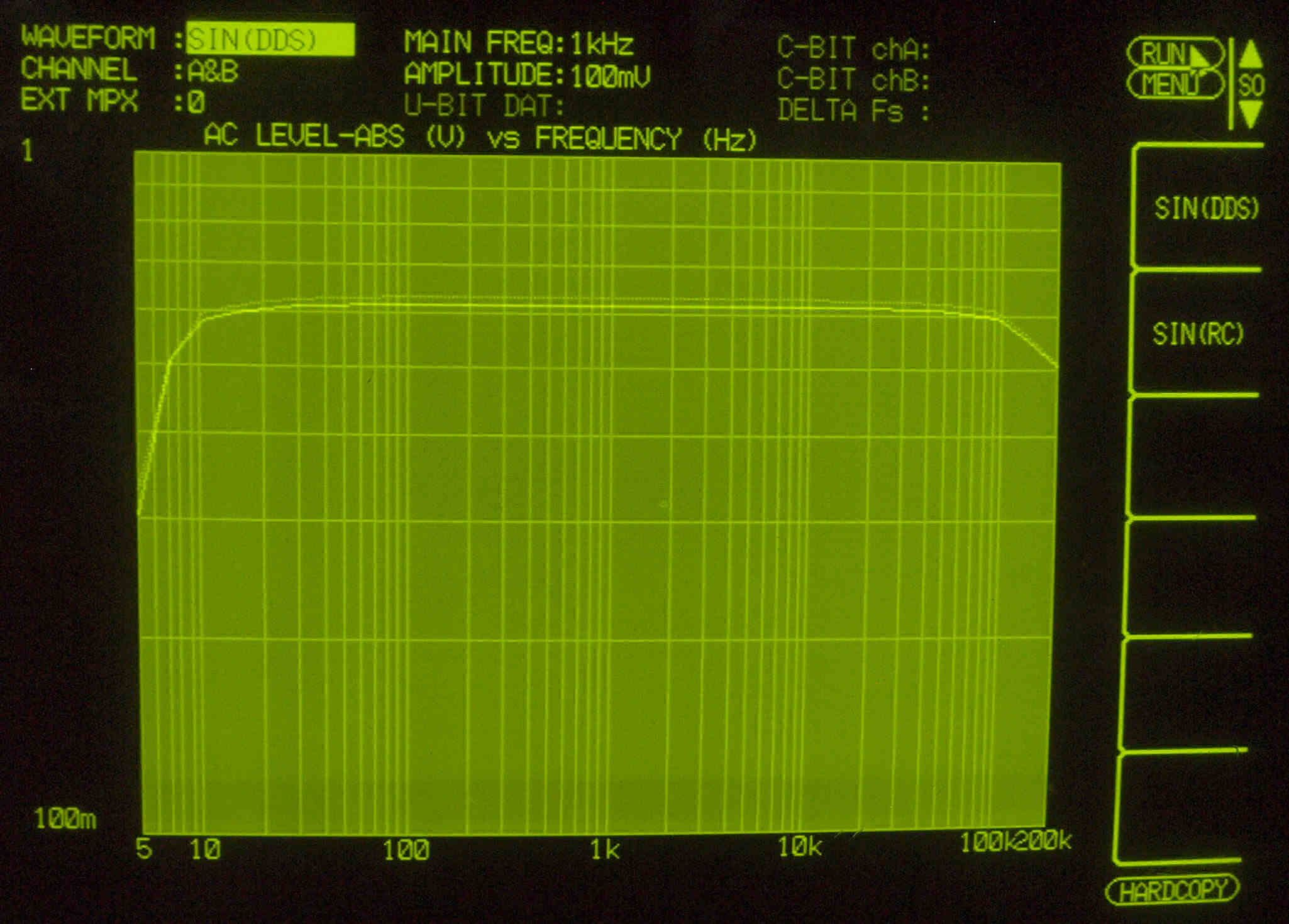 | F. 上位測定機器での調整・測定。 画像をクリックすると、大きく(横幅2050ドット)表示されます。 F0. 下のオーディオアナライザーVP−7732Aで自動測定。 |