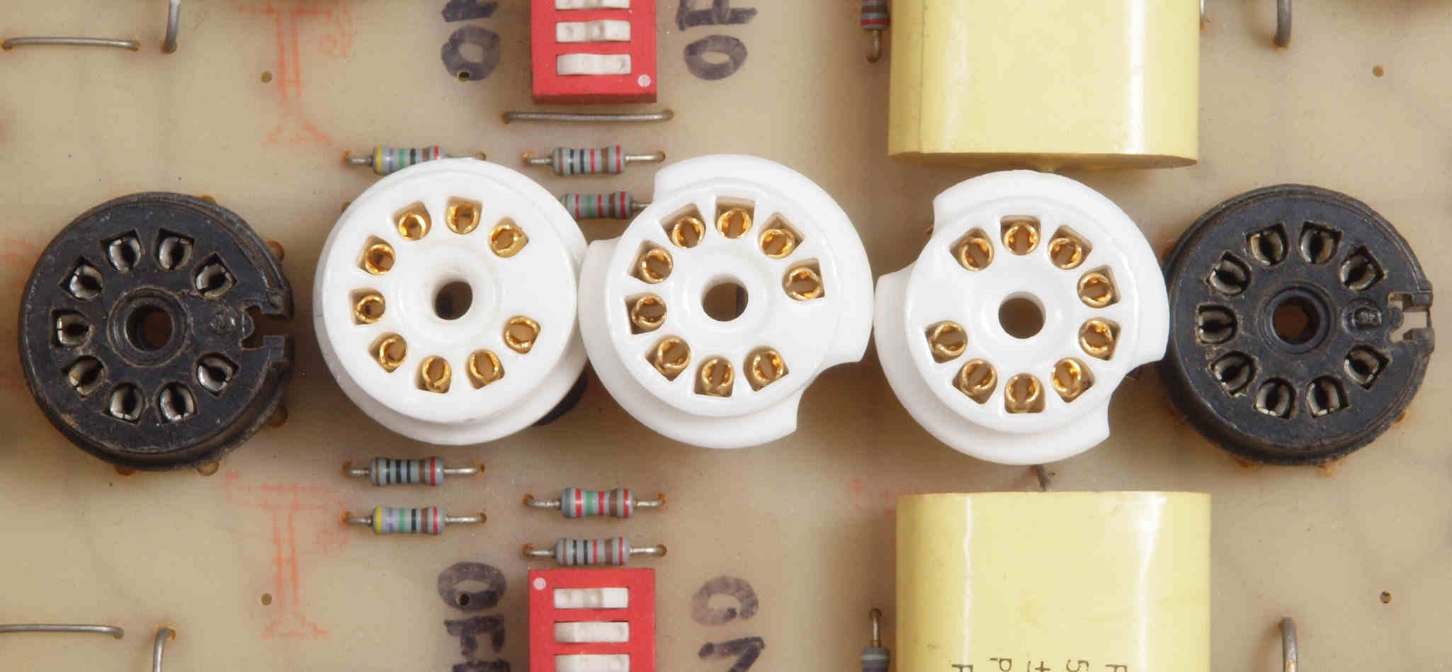 | A51. 点検中 MT−9ピンソケットの比較。中3個=ステアタイト製、両サイド=ベーク製 | ||||||||||||||||||||||||||||||||||||