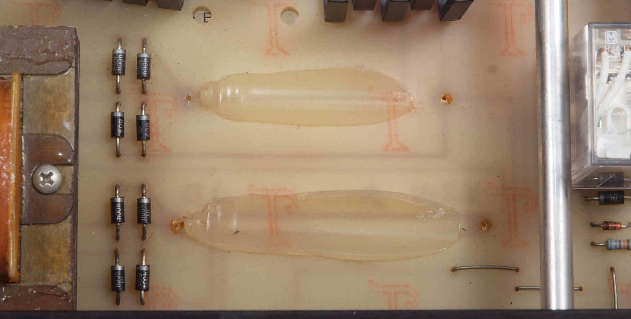 | C115. 修理中 基板。 電解コンデンサー固定接着剤2を取り去り、コートを塗布後。 | ||||||||||||||||||||||||||||||||||||