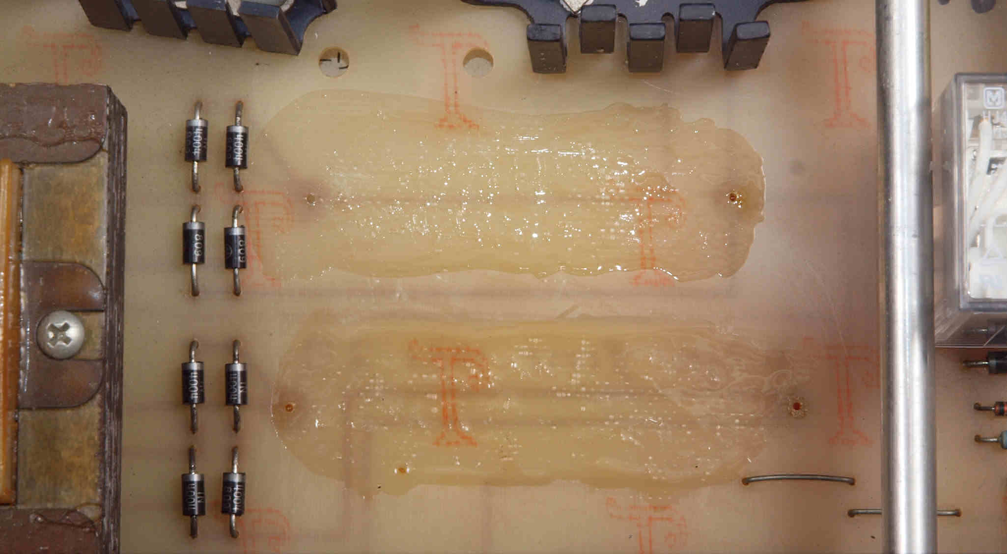 | C113. 修理中 基板。 電解コンデンサー固定接着剤を取り去り、コートを塗布後。 | ||||||||||||||||||||||||||||||||||||
