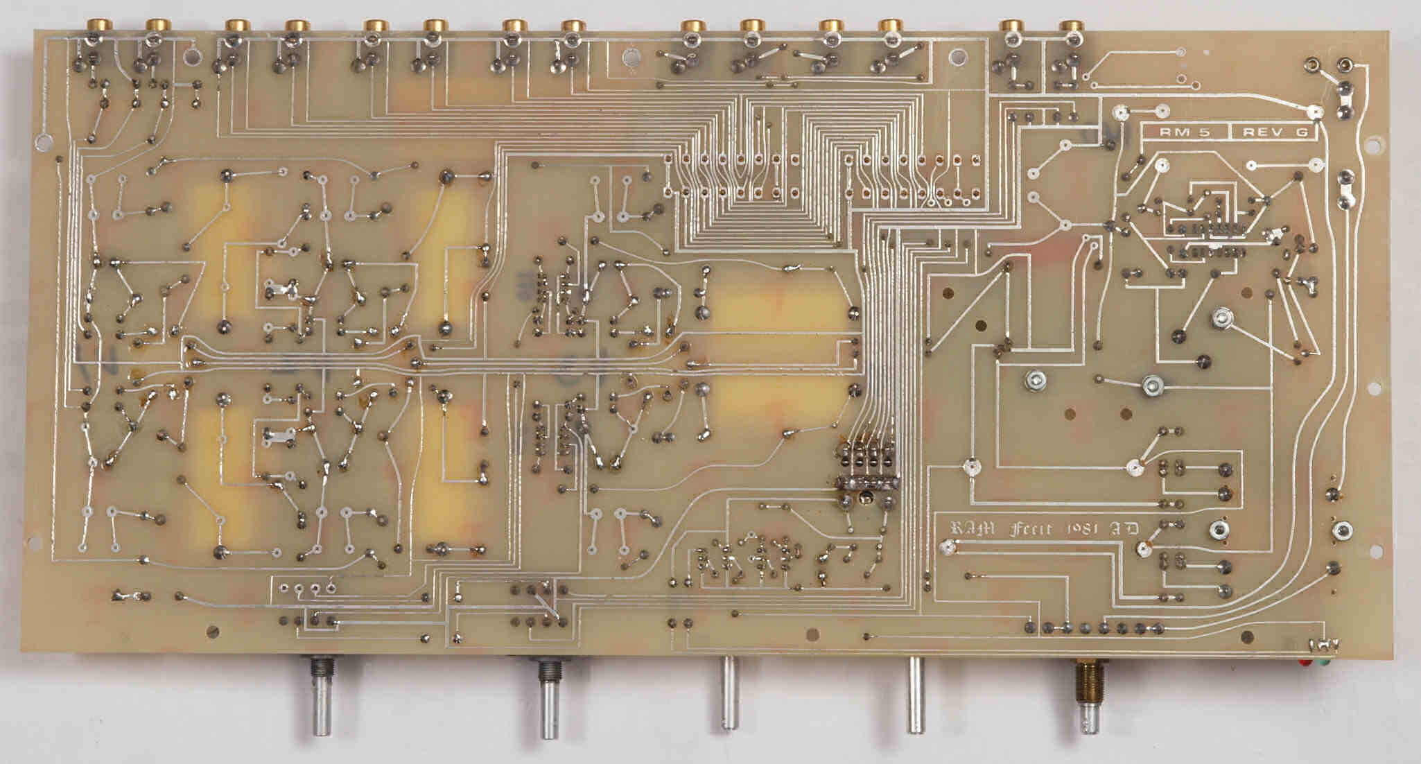| C12. 修理後 基板。リレー1個、電解コンデンサー12個交換。 電解コンデンサー3個、フイルムコンデンサー13個追加。 |