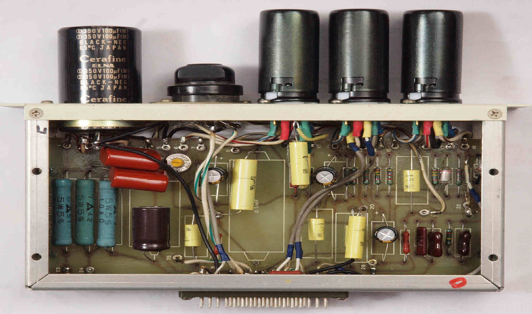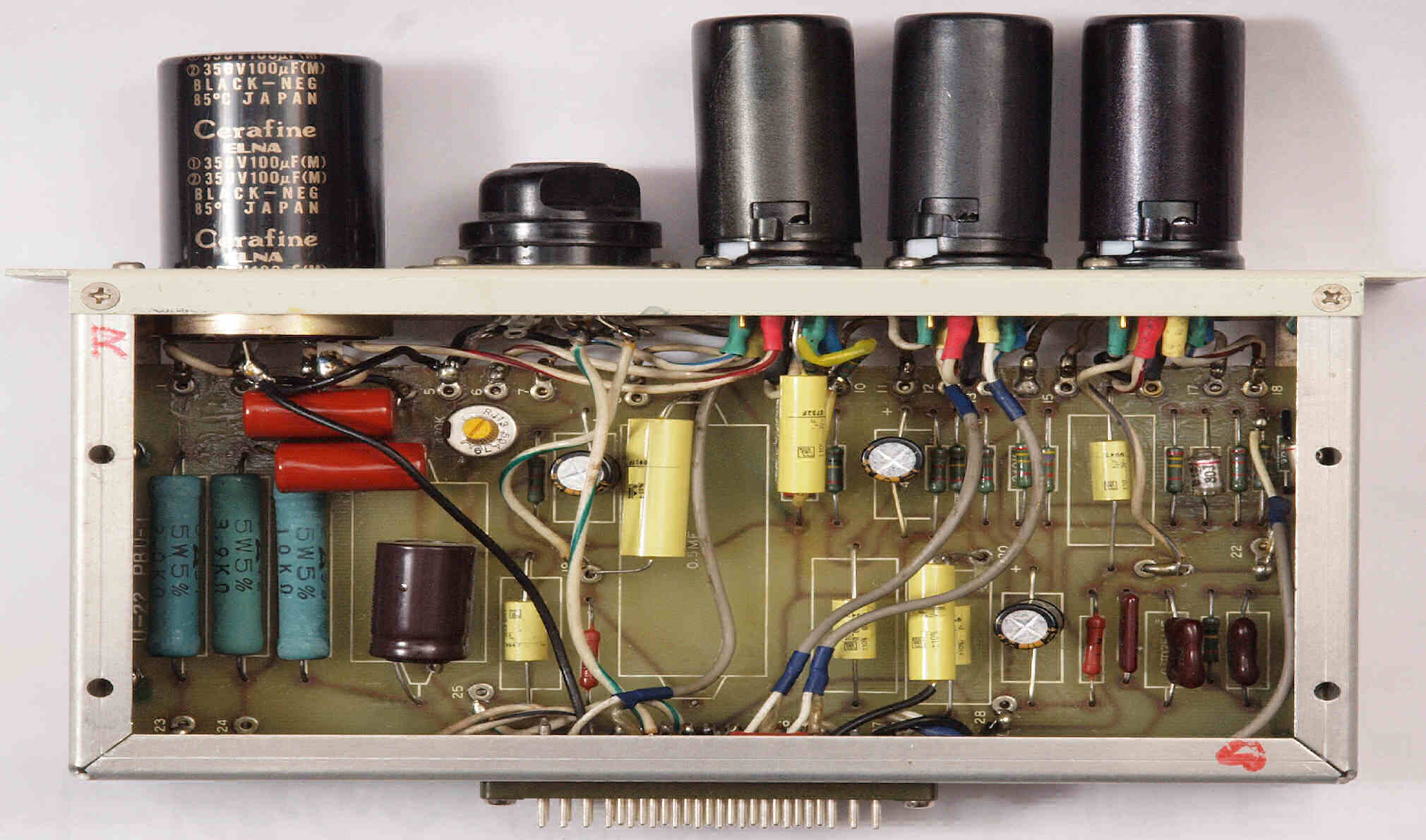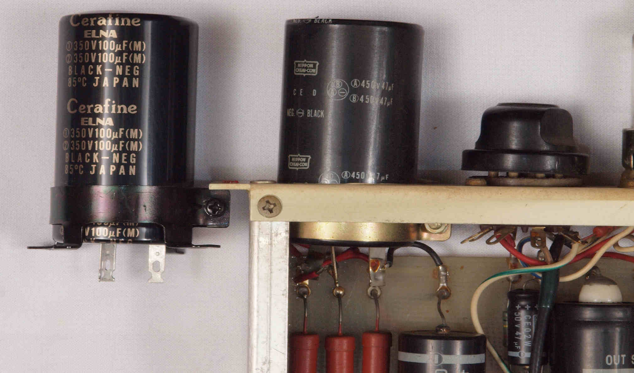 左の「ELNA Cerafin=100μ+100μ/350WV」に交換。付いている右=47μ+47μ/450WV。