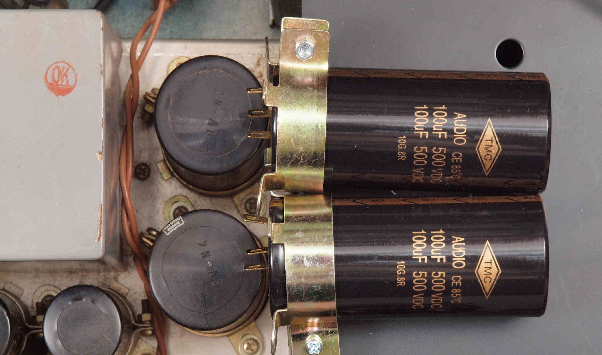 付いている左=47μ×2/450WV、 右=交換する「TMC」100μ×2/500WV。