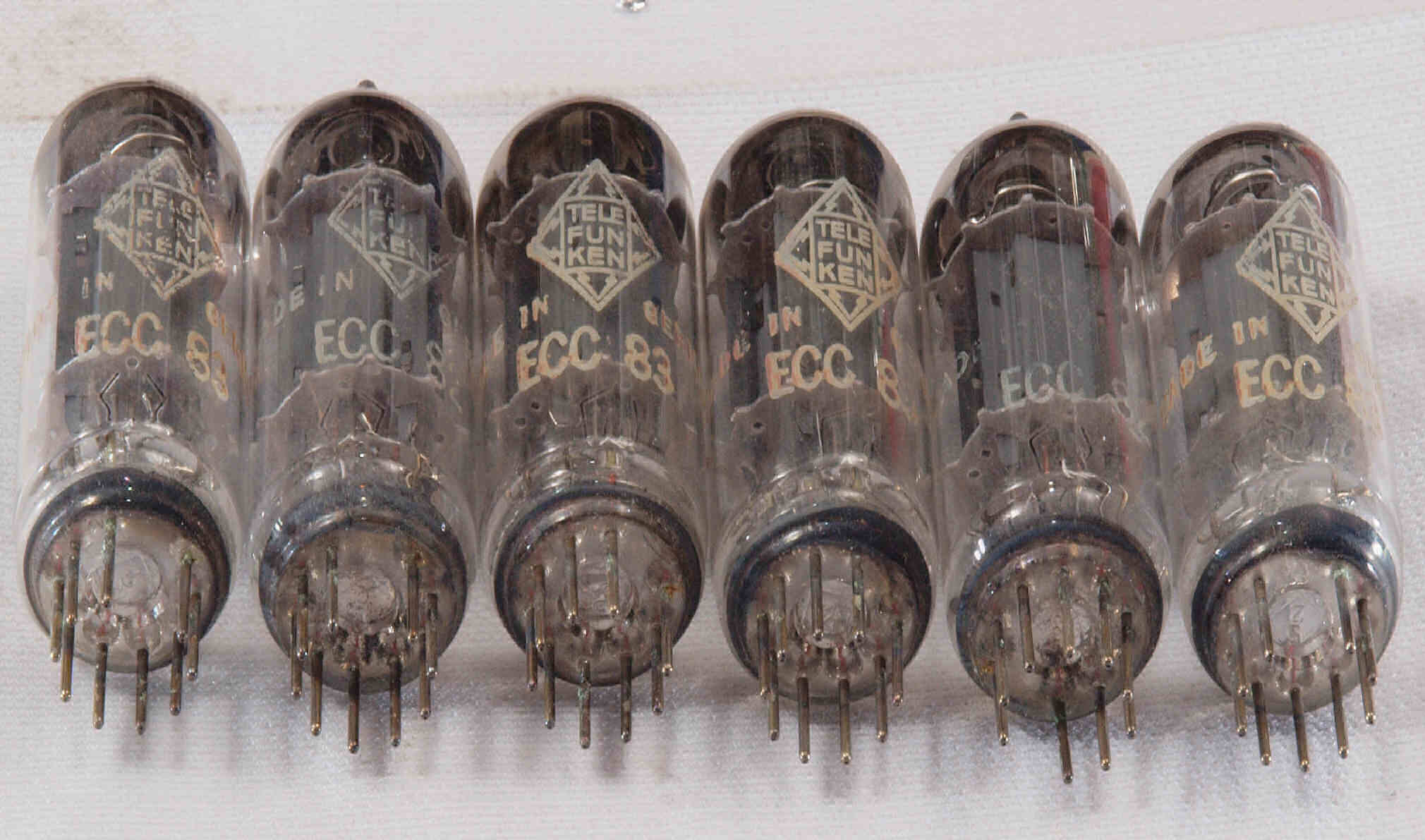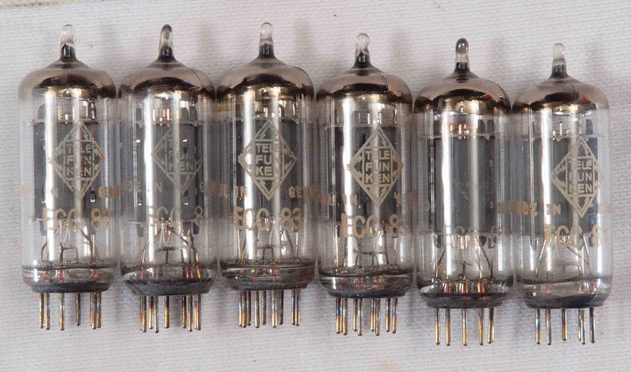 左3本=L側用、右3本=R側用。 左から1本目ECC83、ECC82、2本目ECC83。