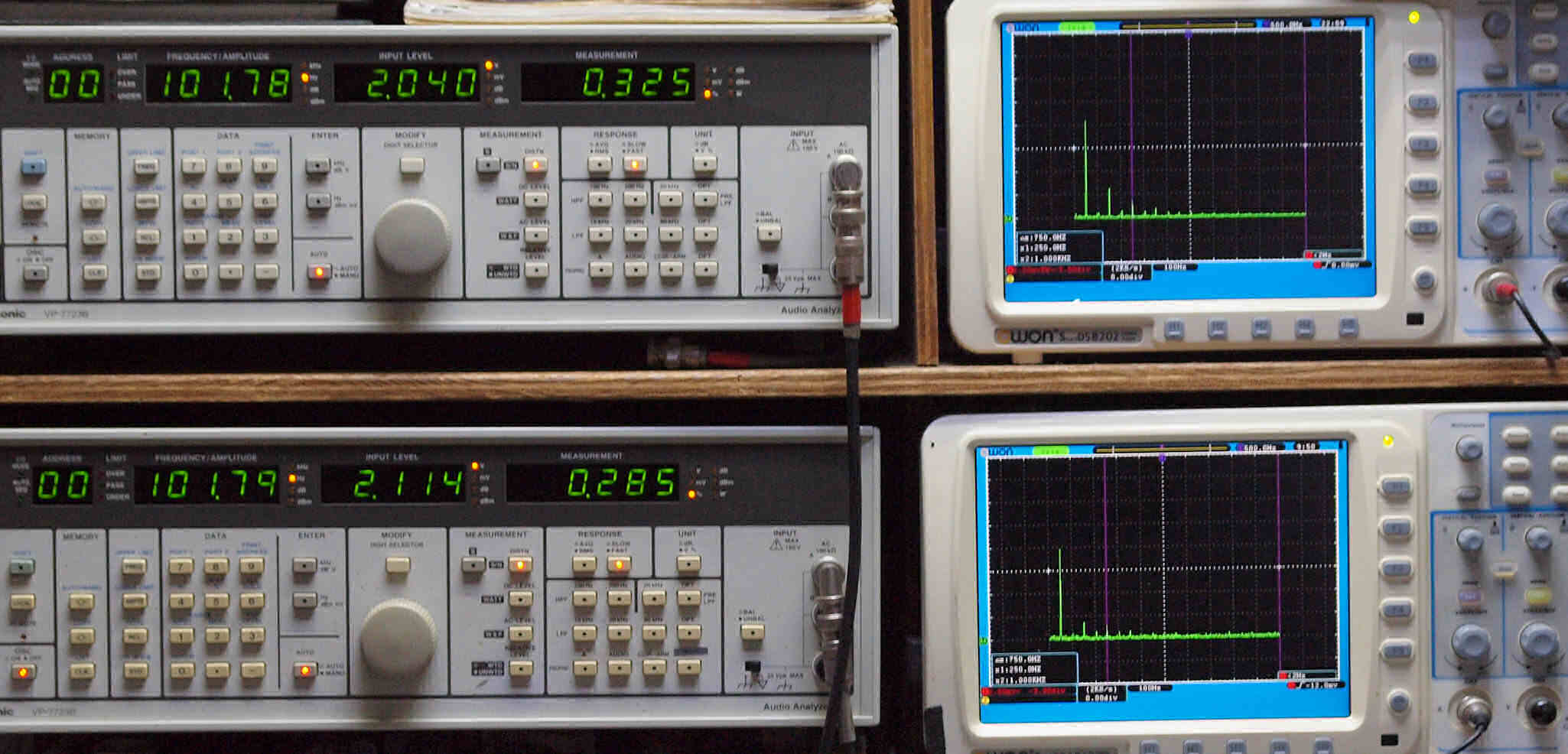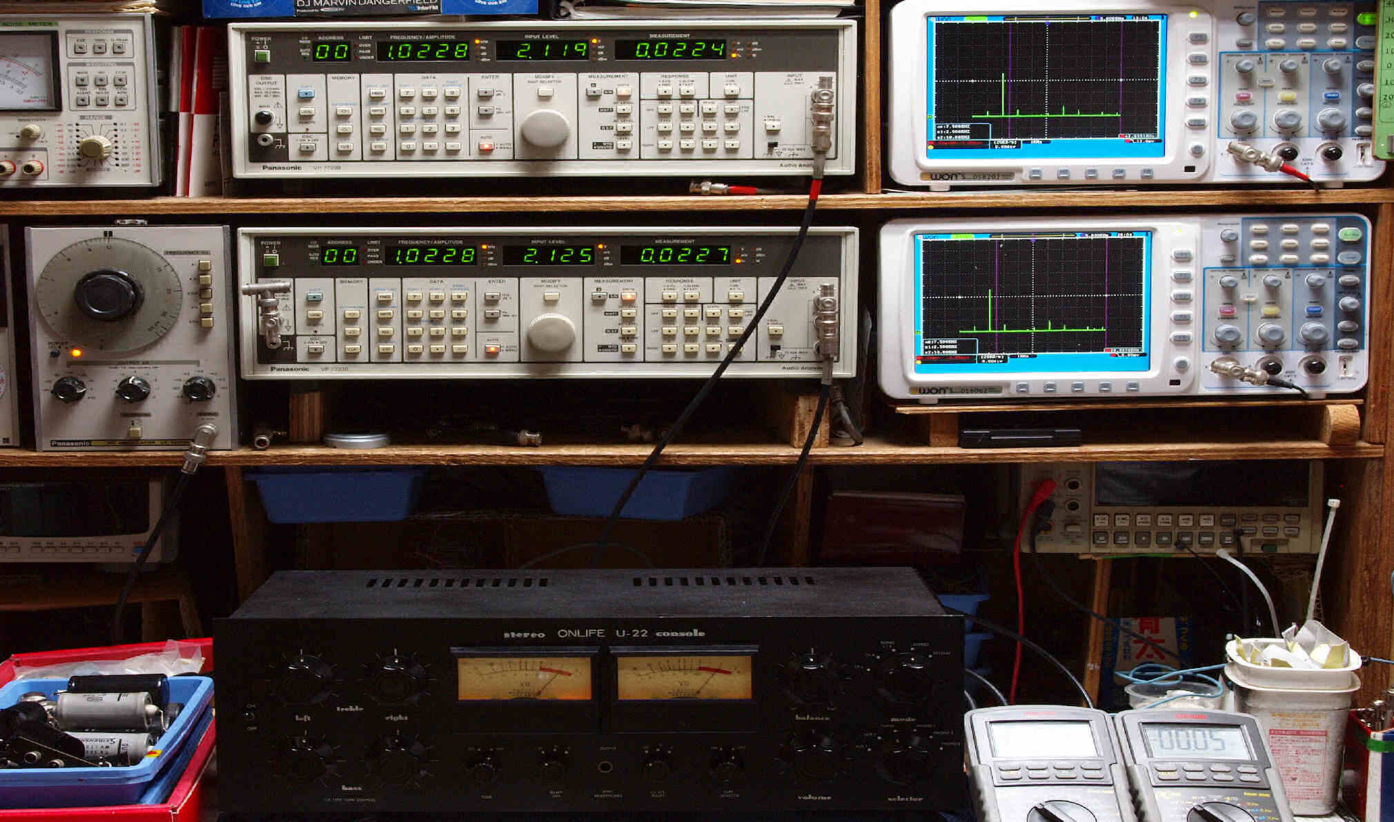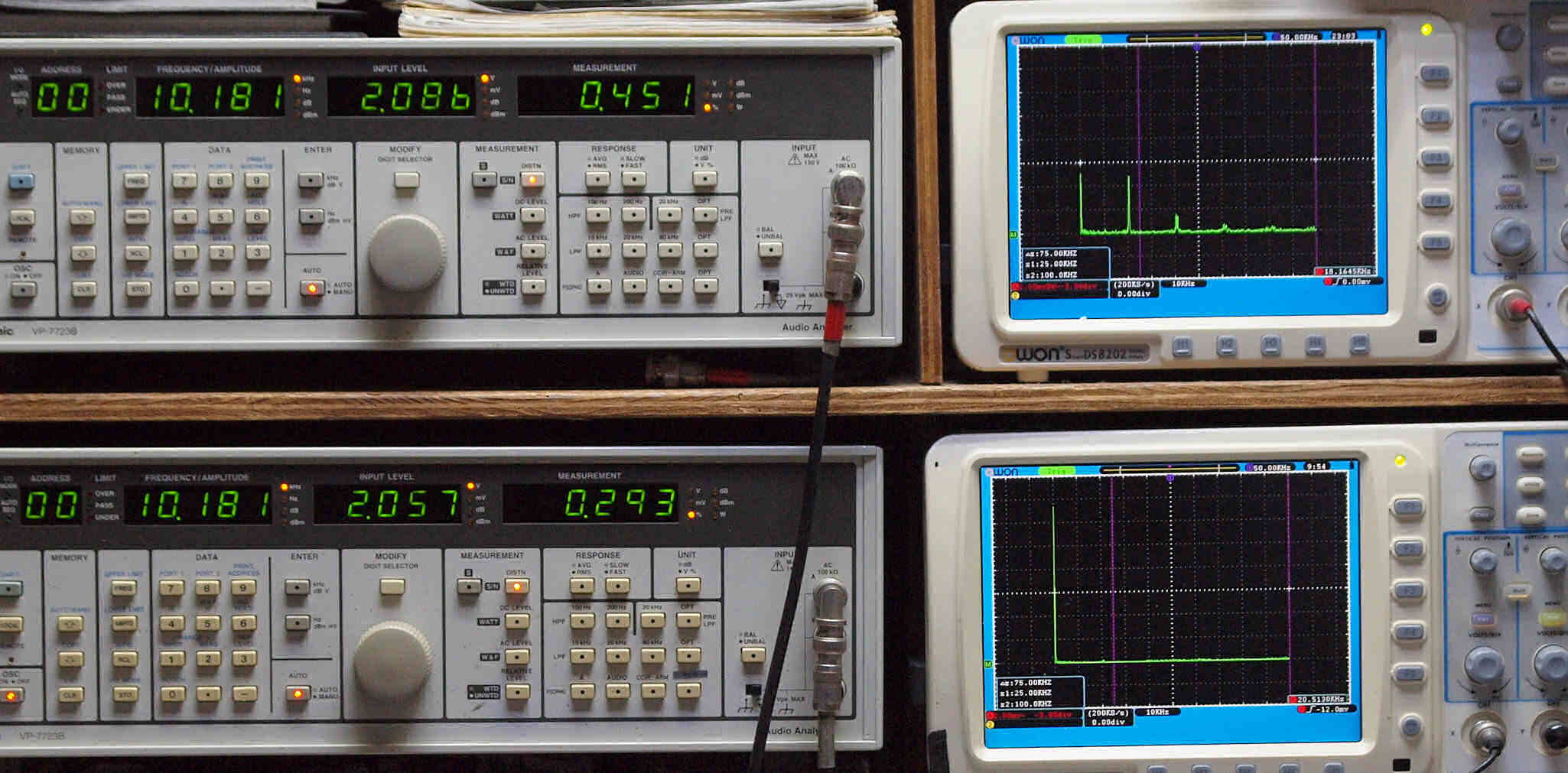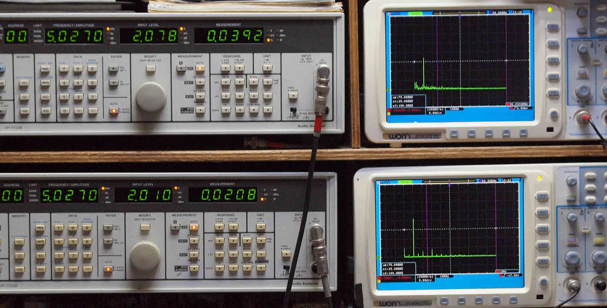 | E. 調整・測定。 画像をクリックすると、大きく(横幅2050ドット)表示されます。 E1. 出力・歪み率測定・調整。 「見方」。 上段中 右側出力を「Audio Analyzer Panasonic VP−7723B」により測定。 表示LED、 左端=メモリーNo、 中左=周波数測定、 中右=出力電圧測定、 右端=歪み率測定。 上段右端 VP−7723Bの基本波除去出力を「owon SDS8202(200MHZ)」で「FFT分析」表示。 下段中 左側出力を「Audio Analyzer Panasonic VP−7723B」により測定。 表示LED、 左端=メモリーNo、 中左=周波数測定、 中右=出力電圧測定、 右端=歪み率測定。 下段右端 VP−7723Bの基本波除去出力を「owon SDS6062(200MHZ)」で「FFT分析」表示。 下段左端 オーディオ発振器 VP−7201A より50Hz〜100kHzの信号を出し(歪み率=約0.003%)、ATT+分配器を通し、AMPに入力。 よって、ダイアル設定出力レベルより低くなります。測定機器の仕様や整備の様子はこちら、「VP−7723B」「VP−7201A」。 FFT画面の見方はこちら。 電源のブロック電解コンデンサーを大容量に交換下ので、ハム(50,100HZ)が激減している。 写真紛失のため3台目より。 |