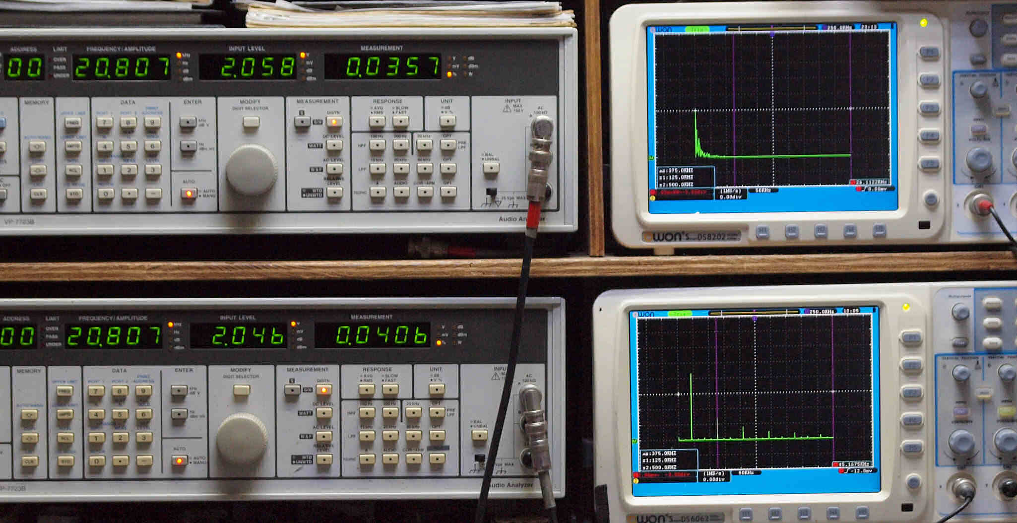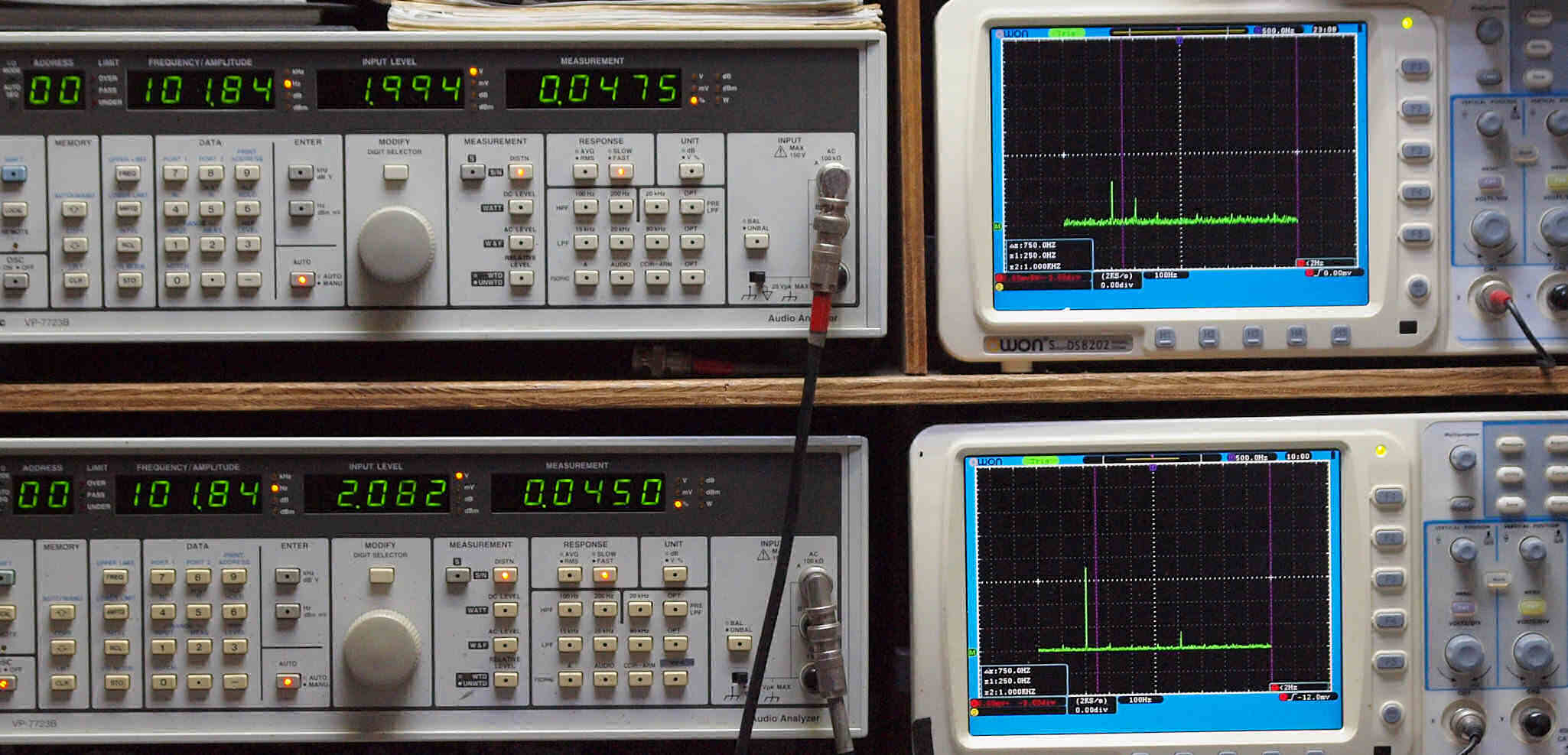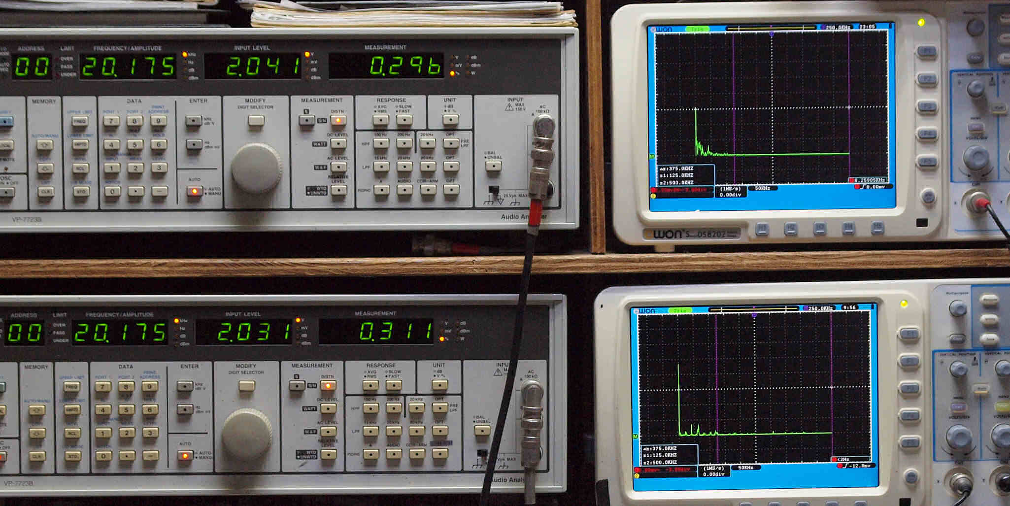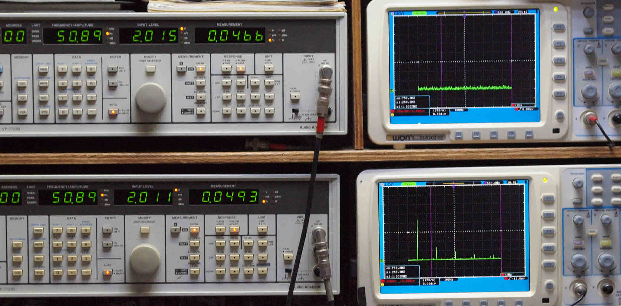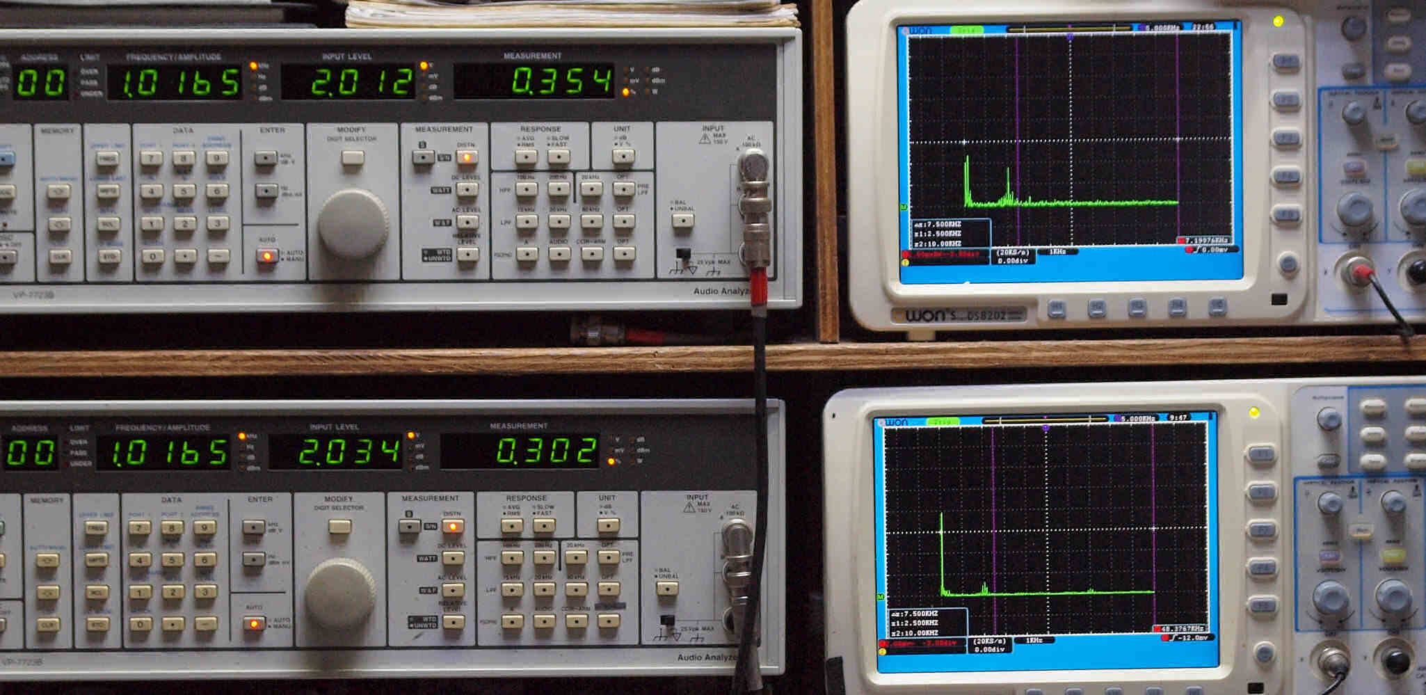 | E. 調整・測定。 画像をクリックすると、大きく(横幅2050ドット)表示されます。 E1. 出力・歪み率測定・調整。 「見方」。 上段中 右側出力を「Audio Analyzer Panasonic VP−7723B」により測定。 表示LED、 左端=メモリーNo、 中左=周波数測定、 中右=出力電圧測定、 右端=歪み率測定。 上段右端 VP−7723Bの基本波除去出力を「owon SDS8202(200MHZ)」で「FFT分析」表示。 下段中 左側出力を「Audio Analyzer Panasonic VP−7723B」により測定。 表示LED、 左端=メモリーNo、 中左=周波数測定、 中右=出力電圧測定、 右端=歪み率測定。 下段右端 VP−7723Bの基本波除去出力を「owon SDS6062(200MHZ)」で「FFT分析」表示。 下段左端 オーディオ発振器 VP−7201A より50Hz〜100kHzの信号を出し(歪み率=約0.003%)、ATT+分配器を通し、AMPに入力。 よって、ダイアル設定出力レベルより低くなります。測定機器の仕様や整備の様子はこちら、「VP−7723B」「VP−7201A」。 FFT画面の見方はこちら。 電源のブロック電解コンデンサーを大容量に交換下ので、ハム(50,100HZ)が激減している。 写真紛失のため3台目より。 |
