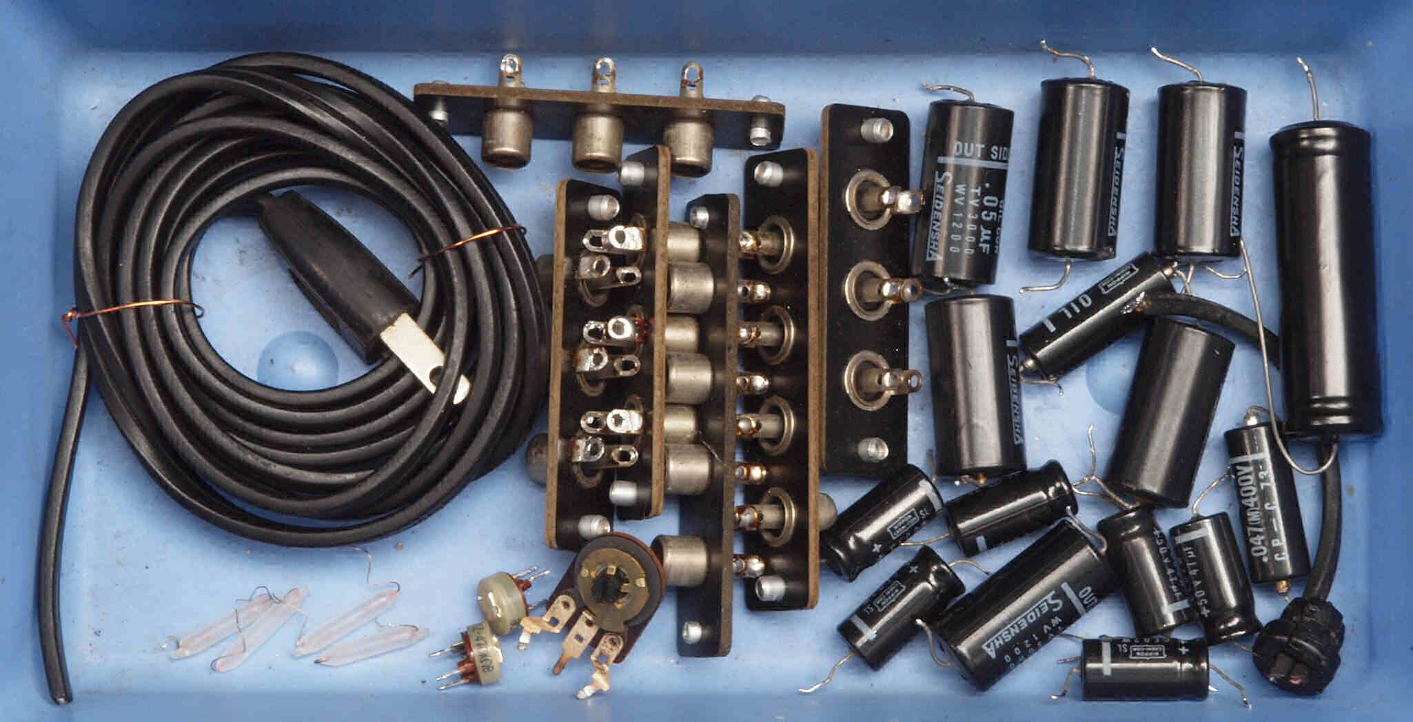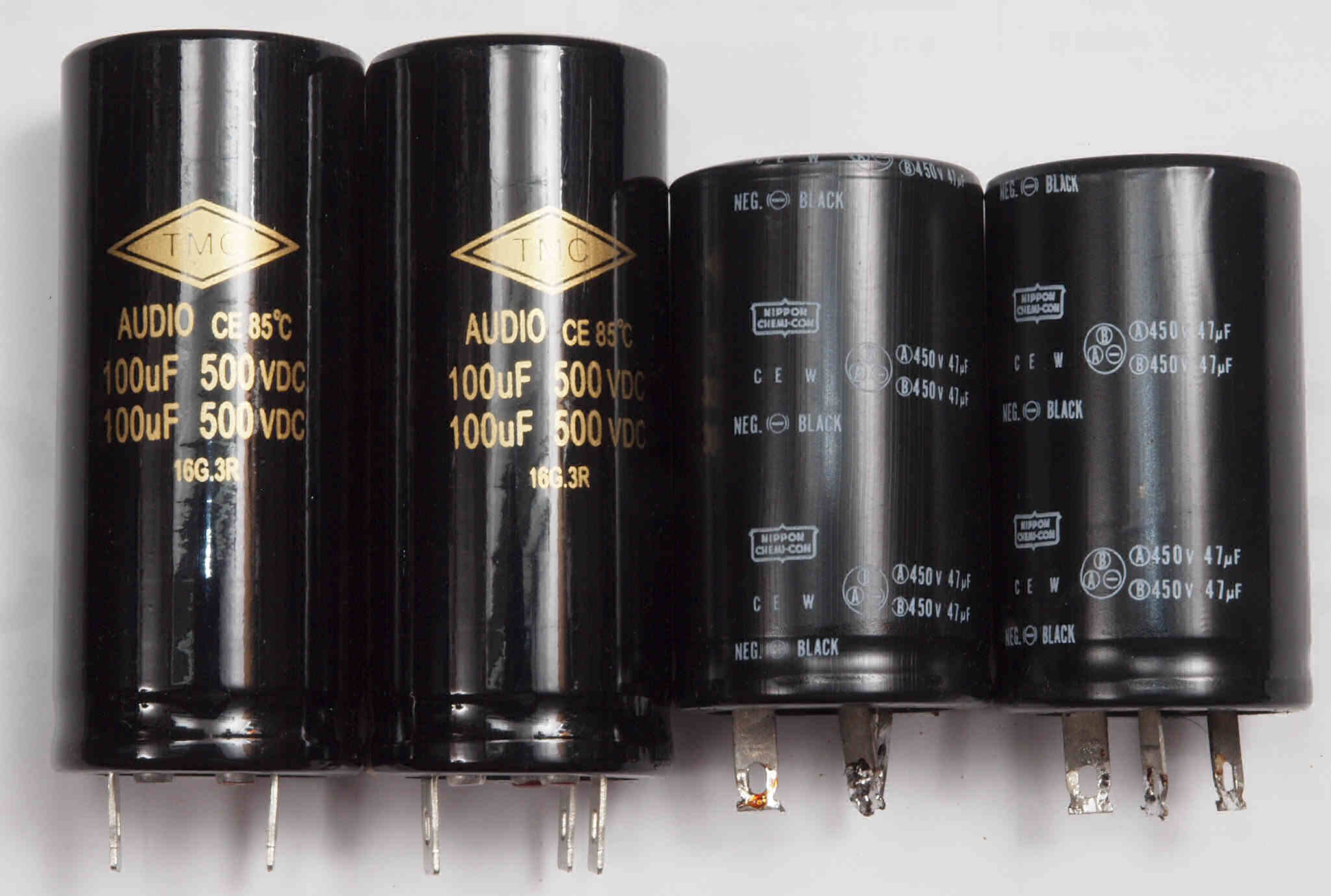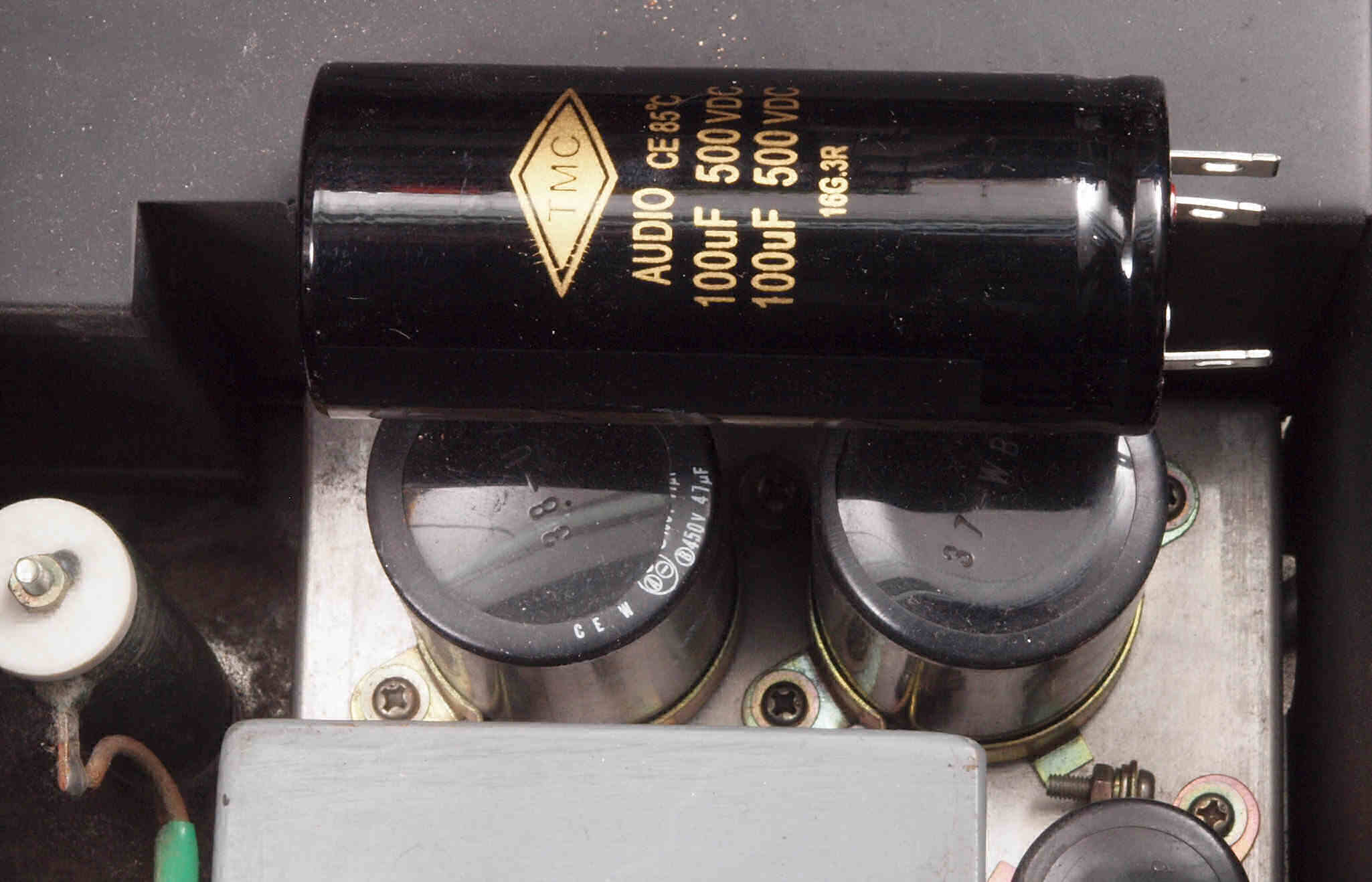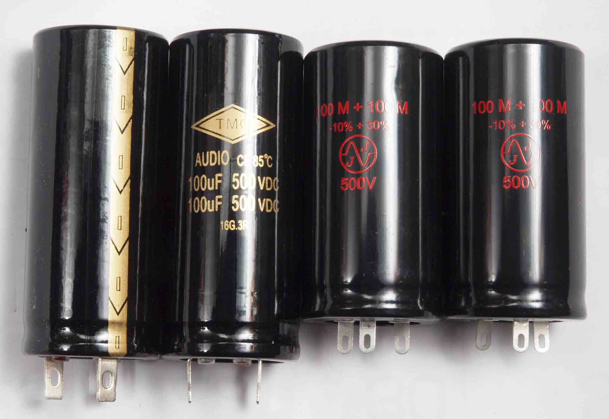 | AC3. 点検中 電源ブロック電解コンデンサー比較、下記から選択可能。 左=「TMC」100μ×2/500WV、右=「JJ」100μ×2/500WV。 |