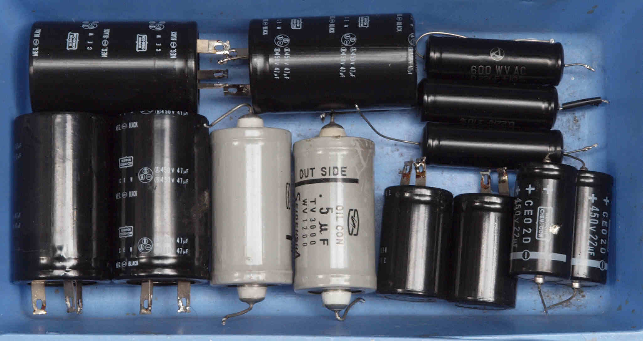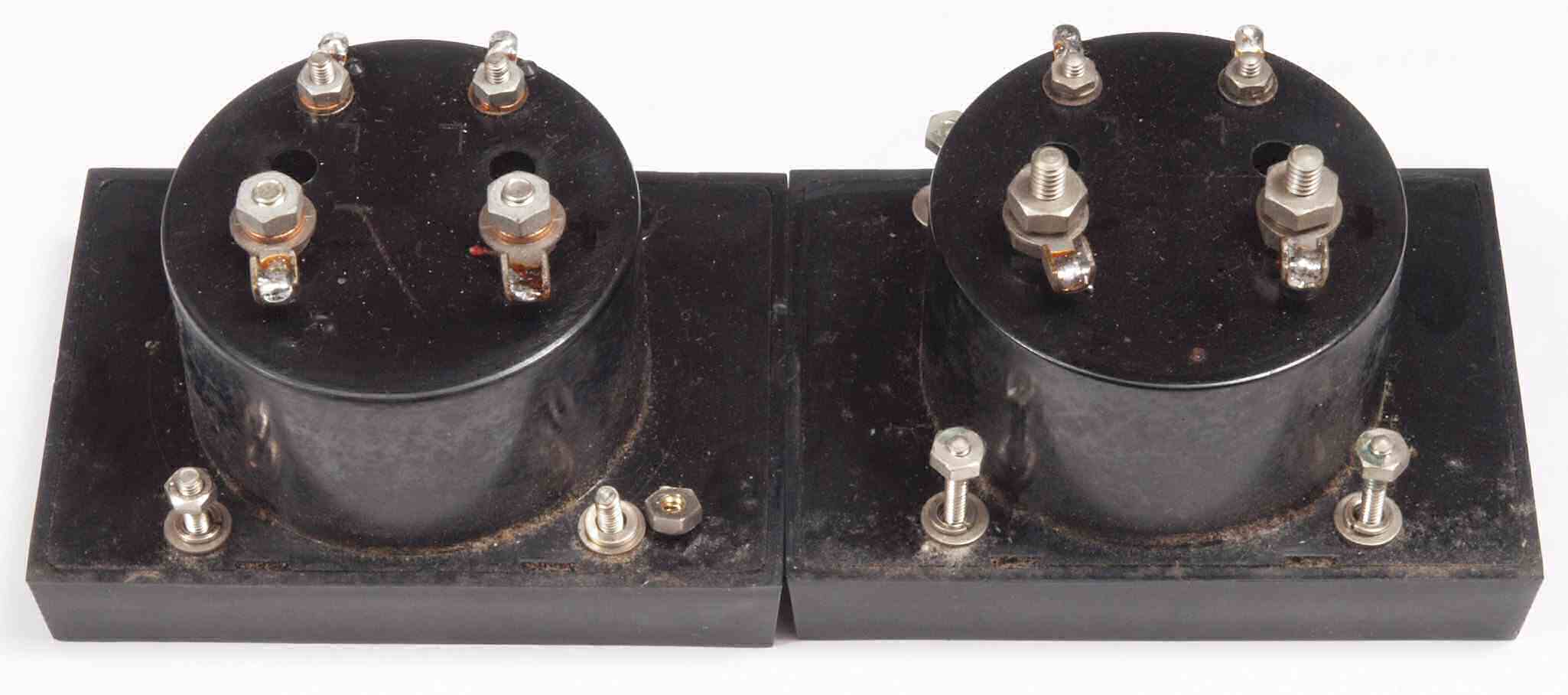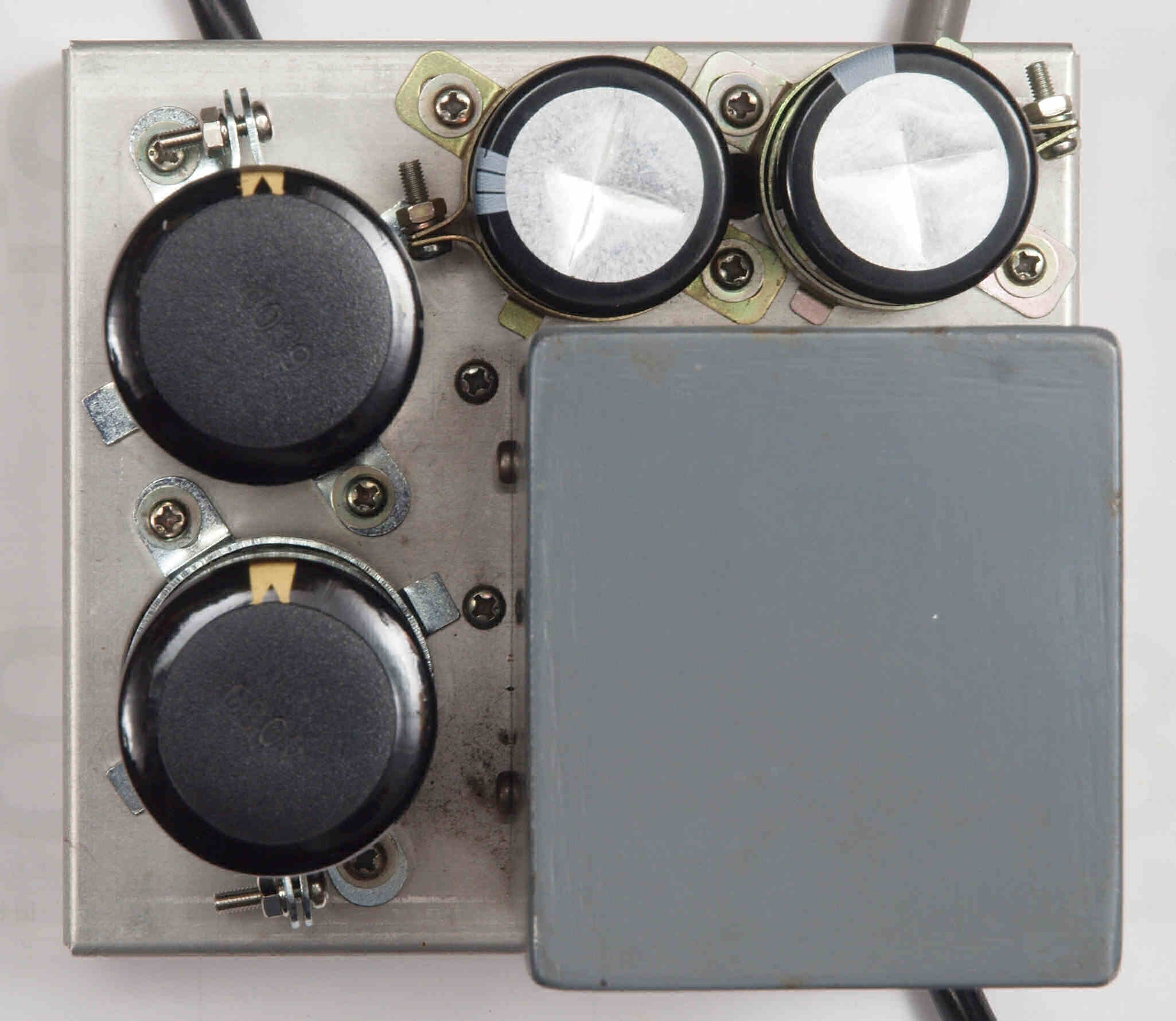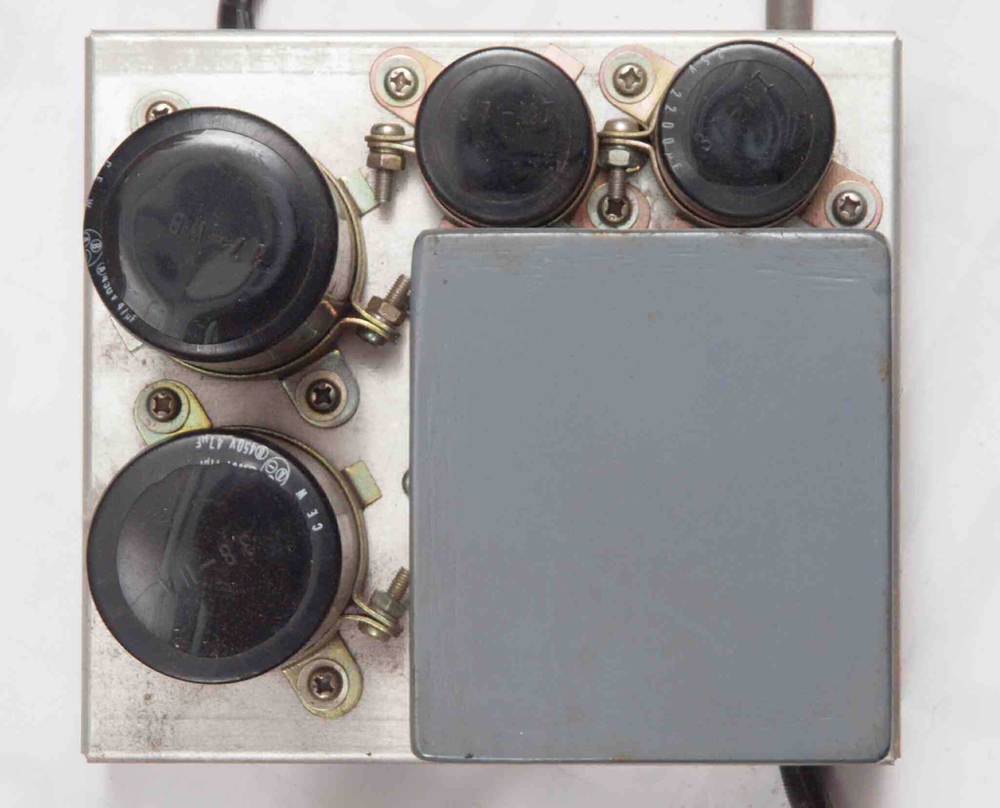 | AC2. 点検中 電源ブロック電解コンデンサー比較。 付いている左=47μ×2/450WV、 右=交換する「TMC」100μ×2/500WV。 |