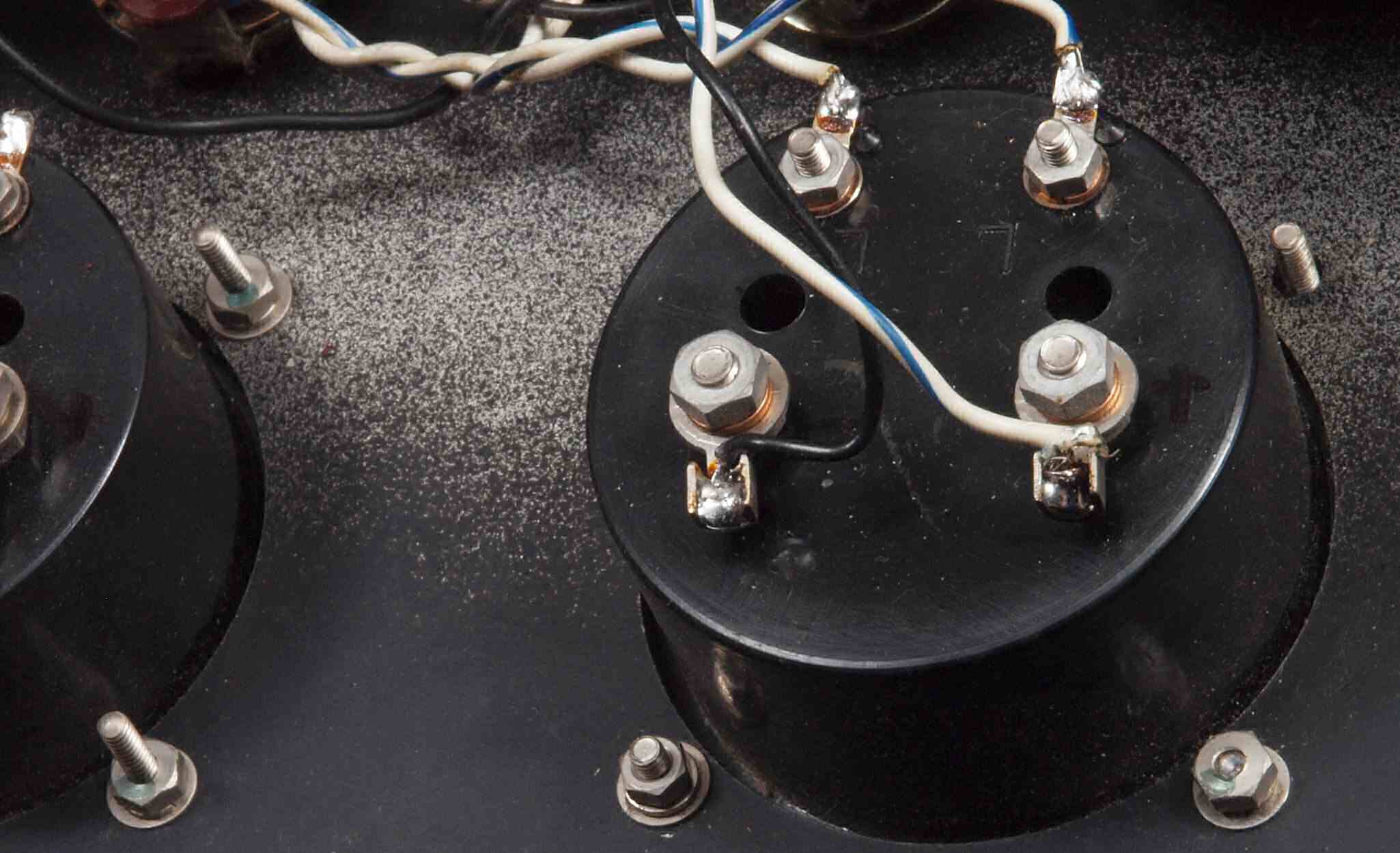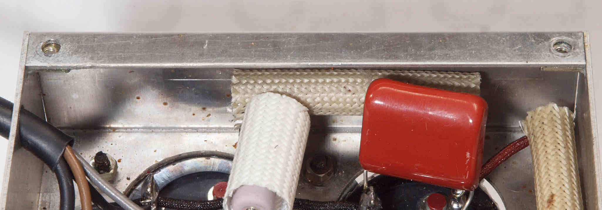 | C2A. 修理(交換)後 真空管ソケット、ブロック電解コンデンサー、シャシー裏側。 写真紛失の為L側写真。 | ||||||||||||||||||||||||||||||