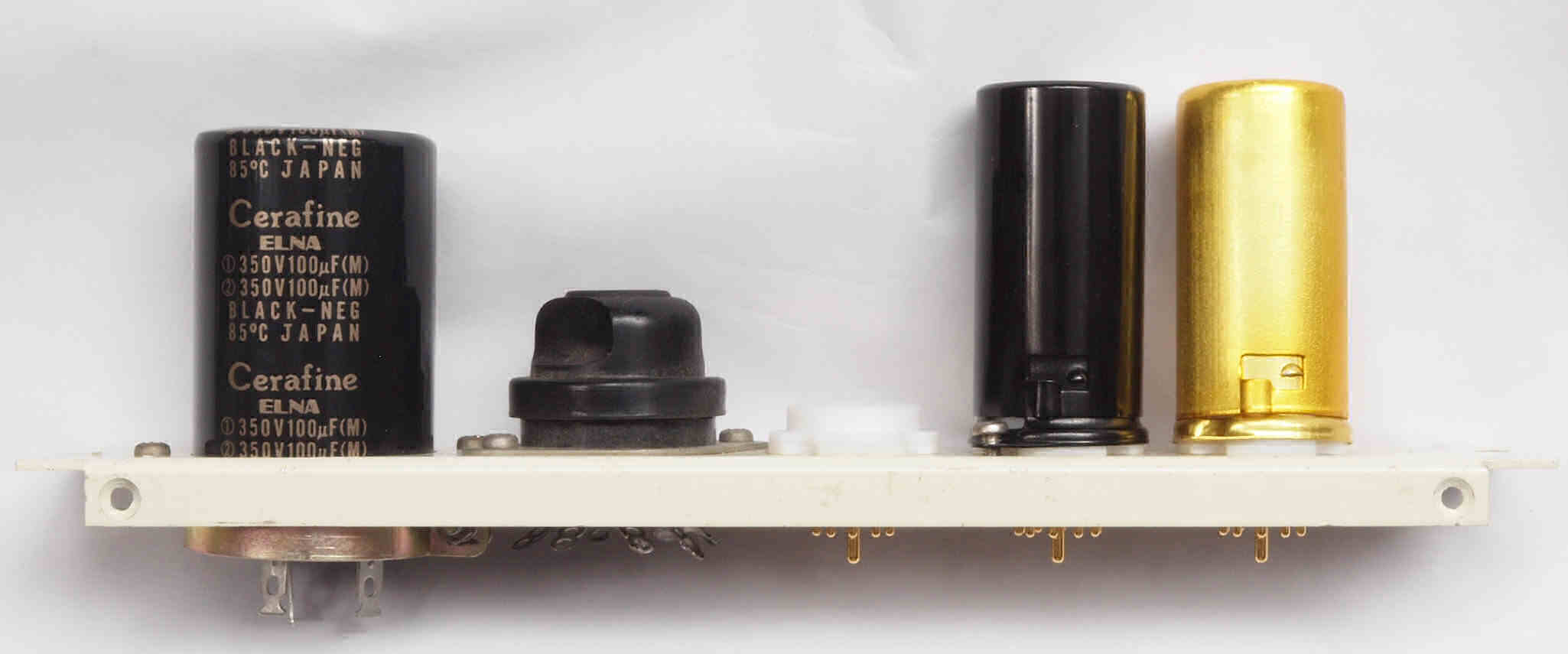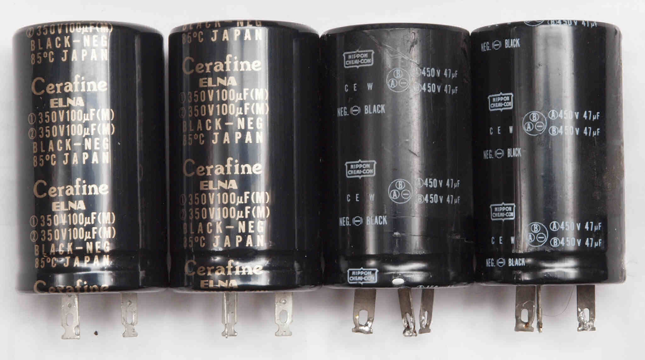 | AC1. 点検中 電源ブロック電解コンデンサー比較。 左の「ELNA Cerafin=100μ+100μ/350WV」に交換。付いている右=47μ+47μ/450WV。 |