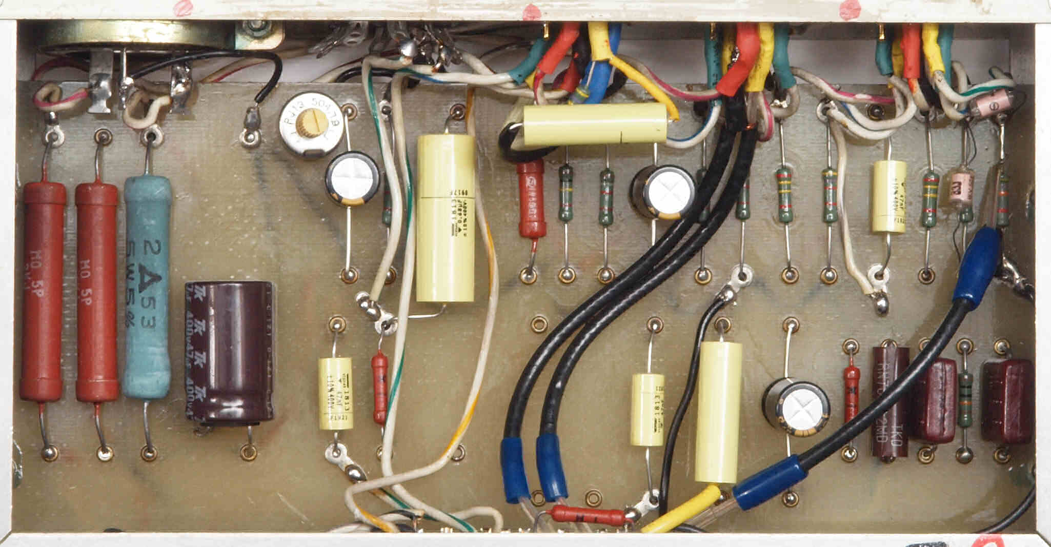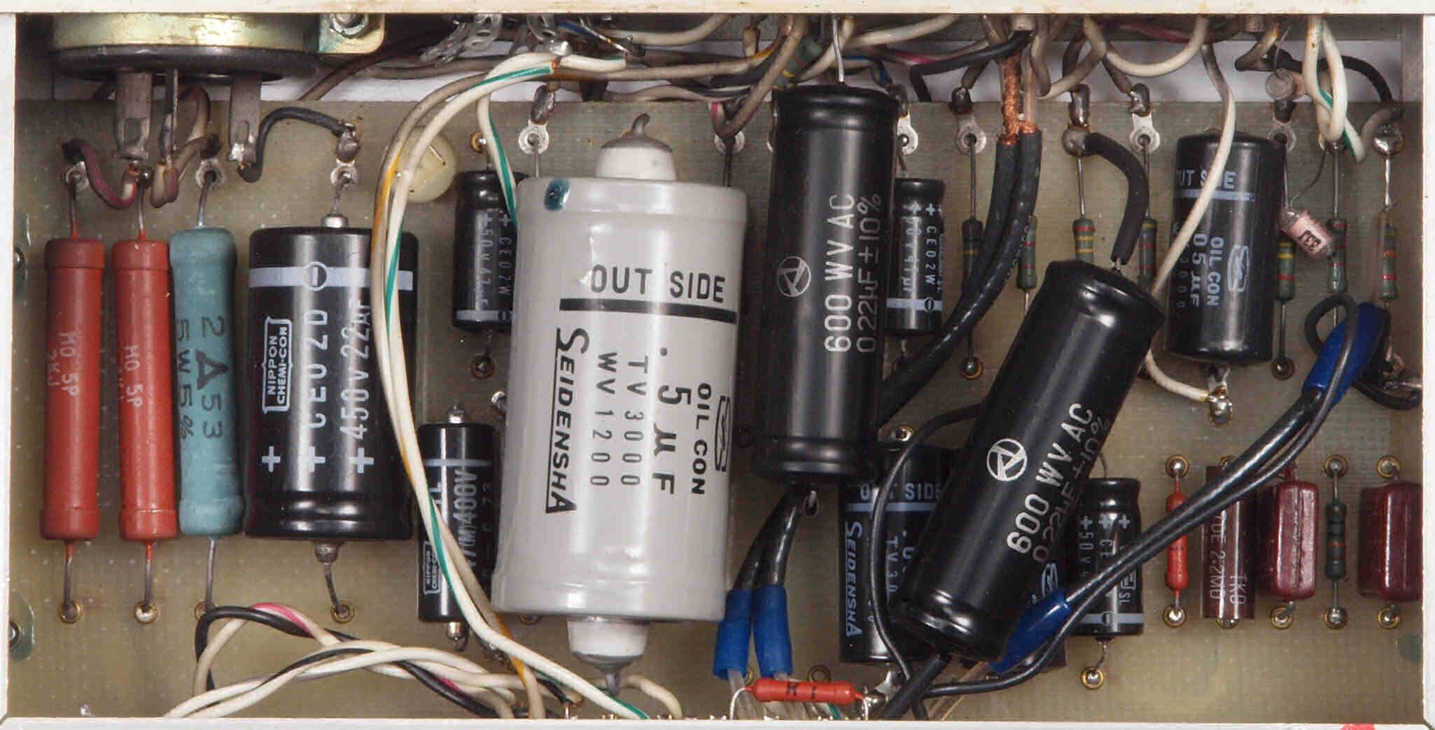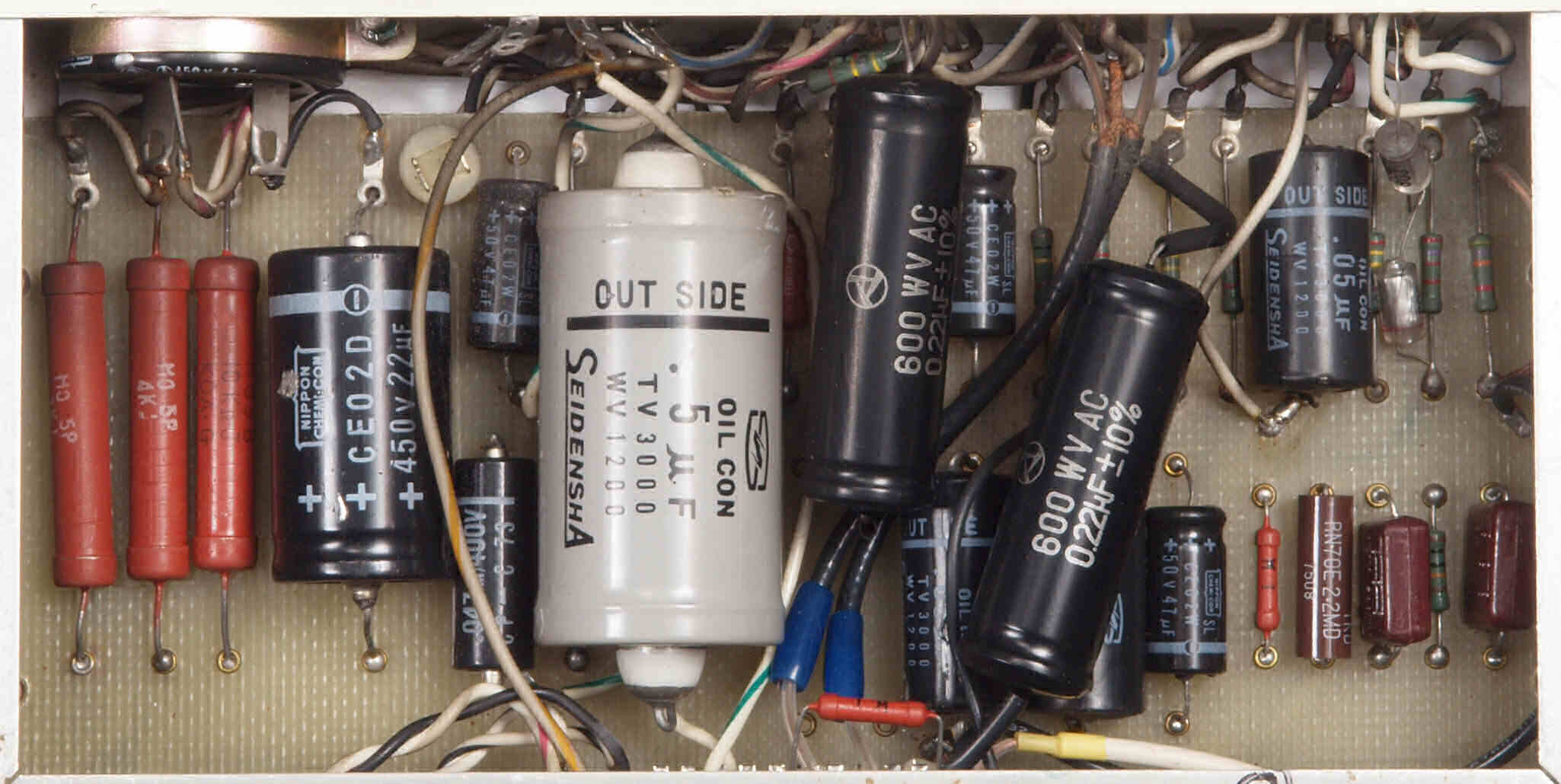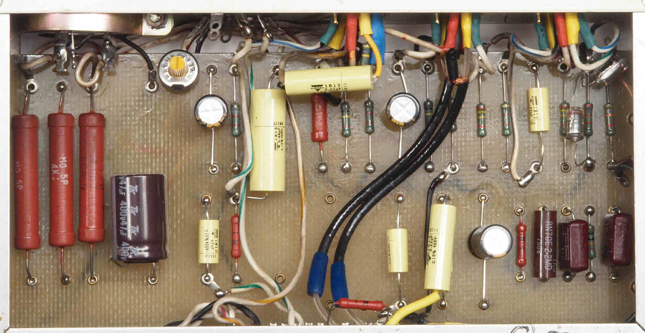 | CE4. 修理後 電源部裏。フイルムコンデンサー1個、抵抗1個追加。 | ||||||||||||||||||||||||||||||