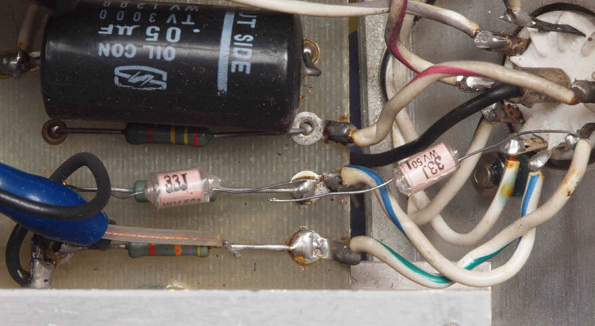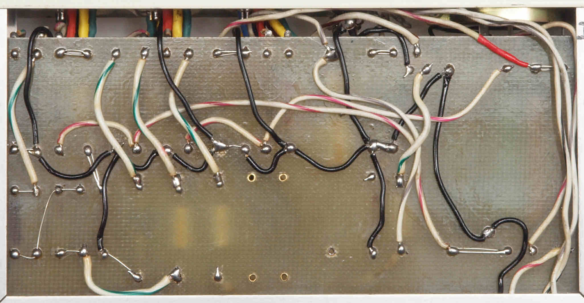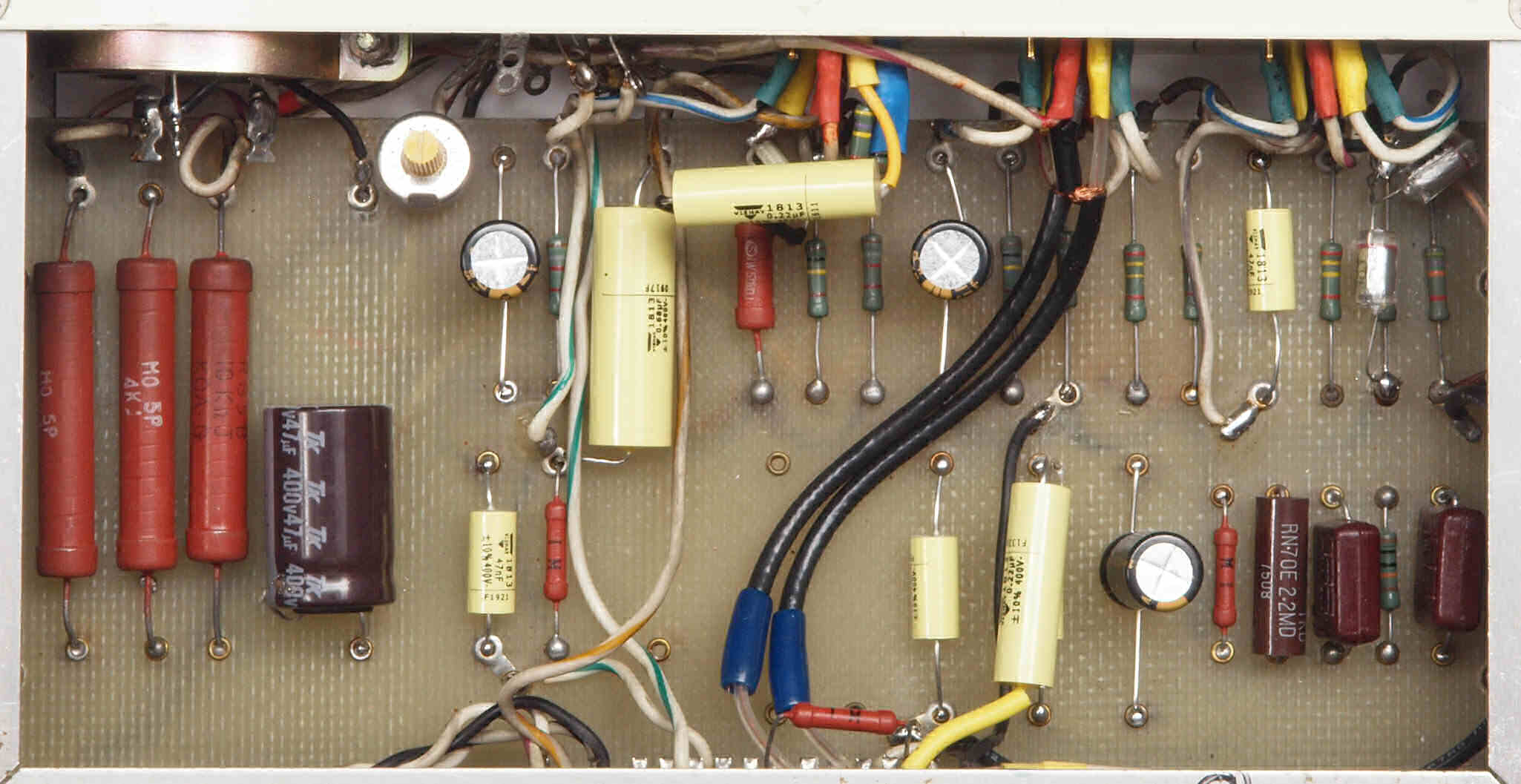 | CE4. 修理後 電源部裏。フイルムコンデンサー1個、抵抗1個追加。 | ||||||||||||||||||||||||||||||