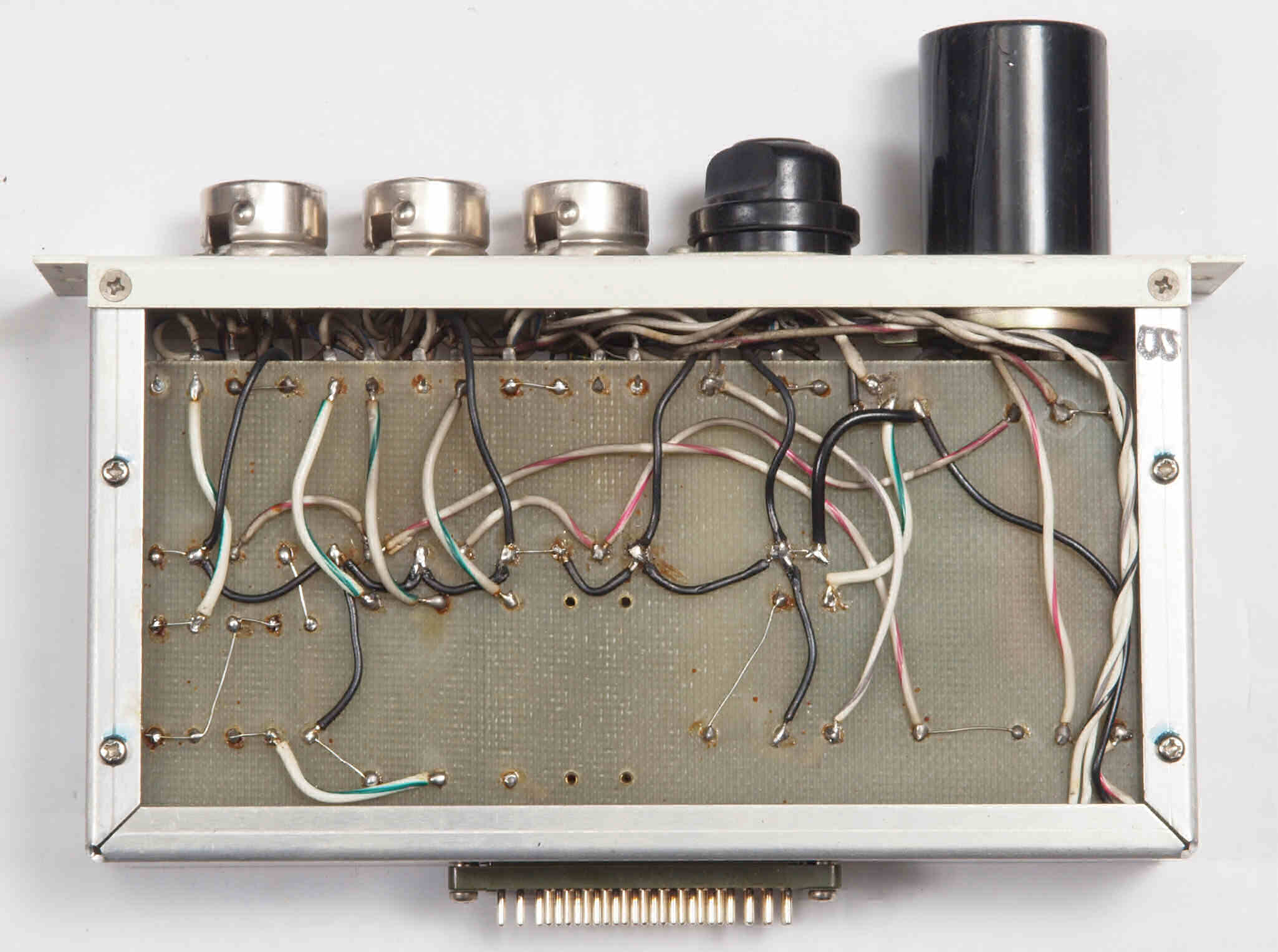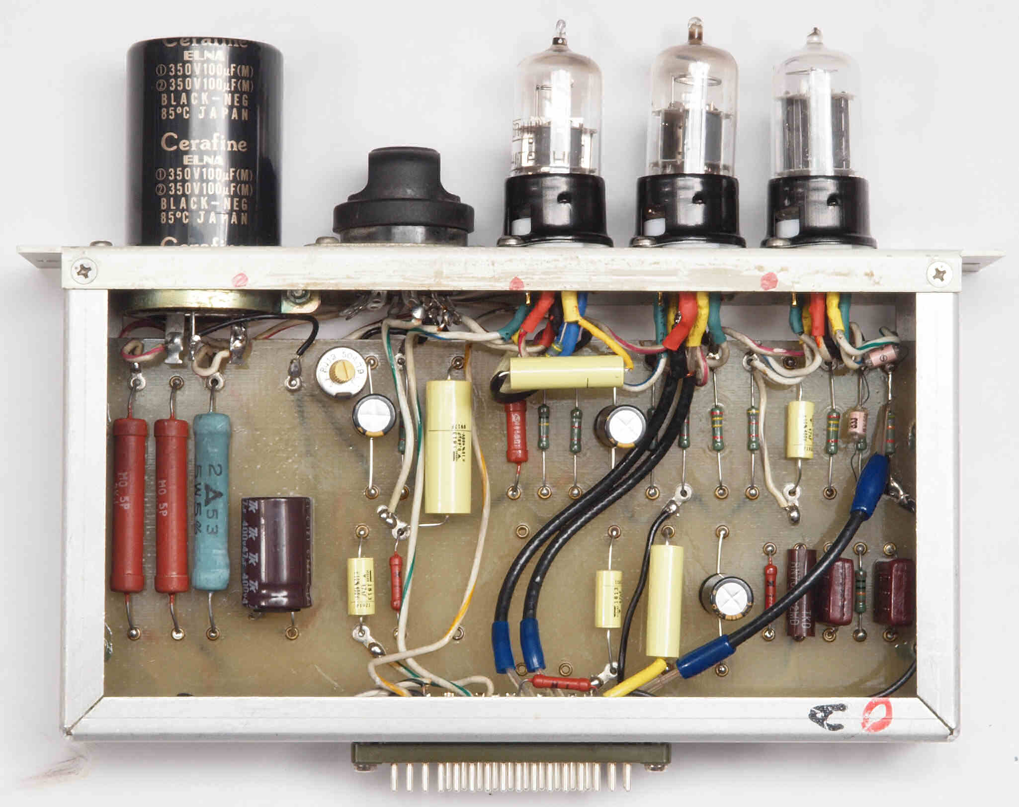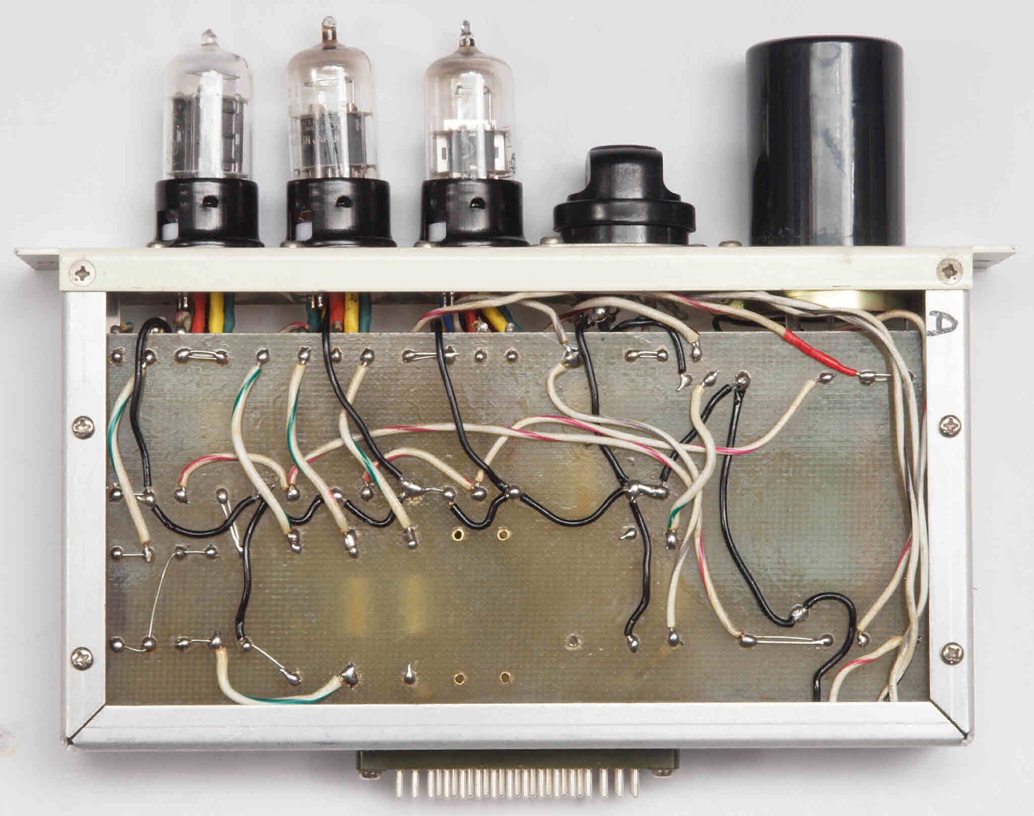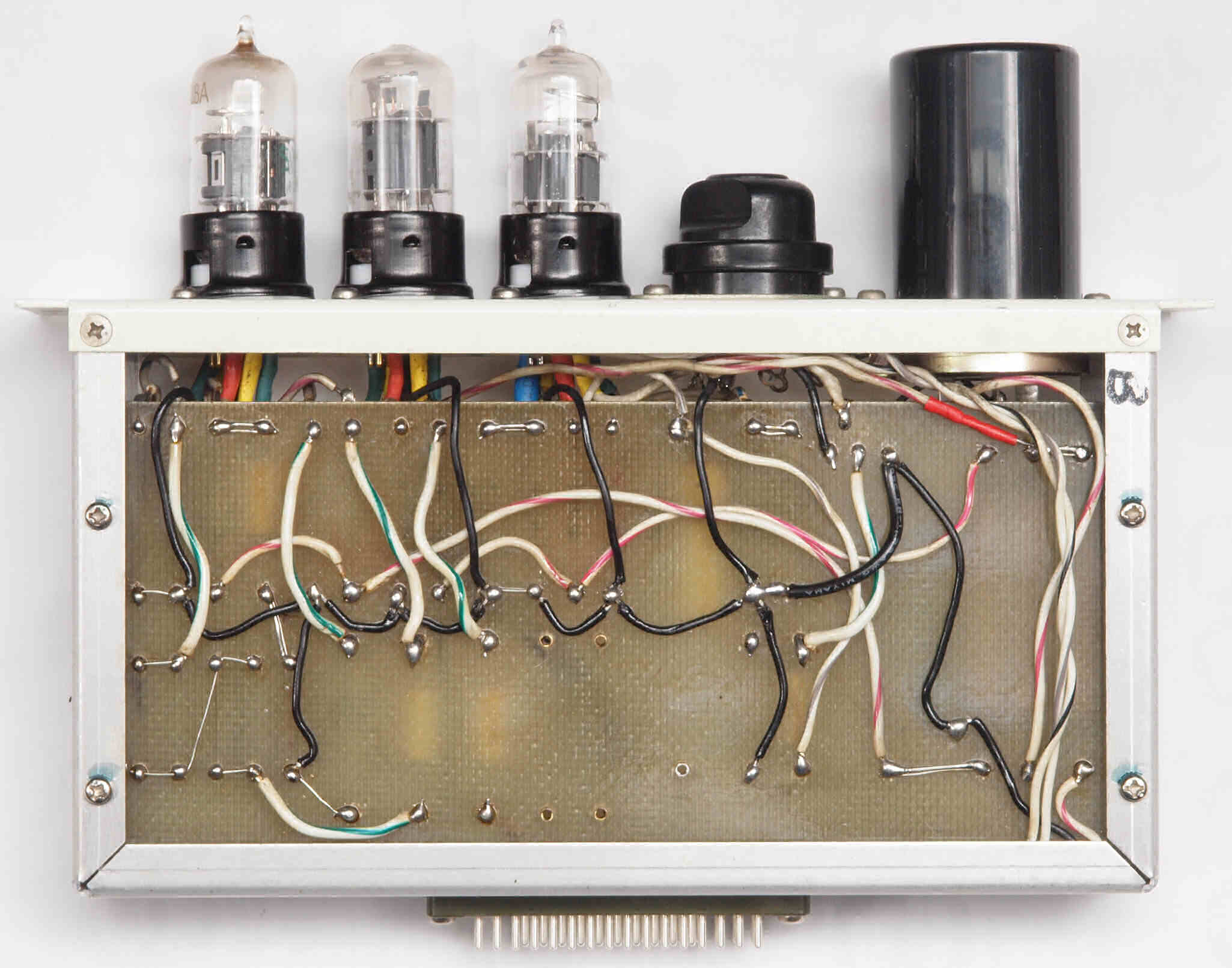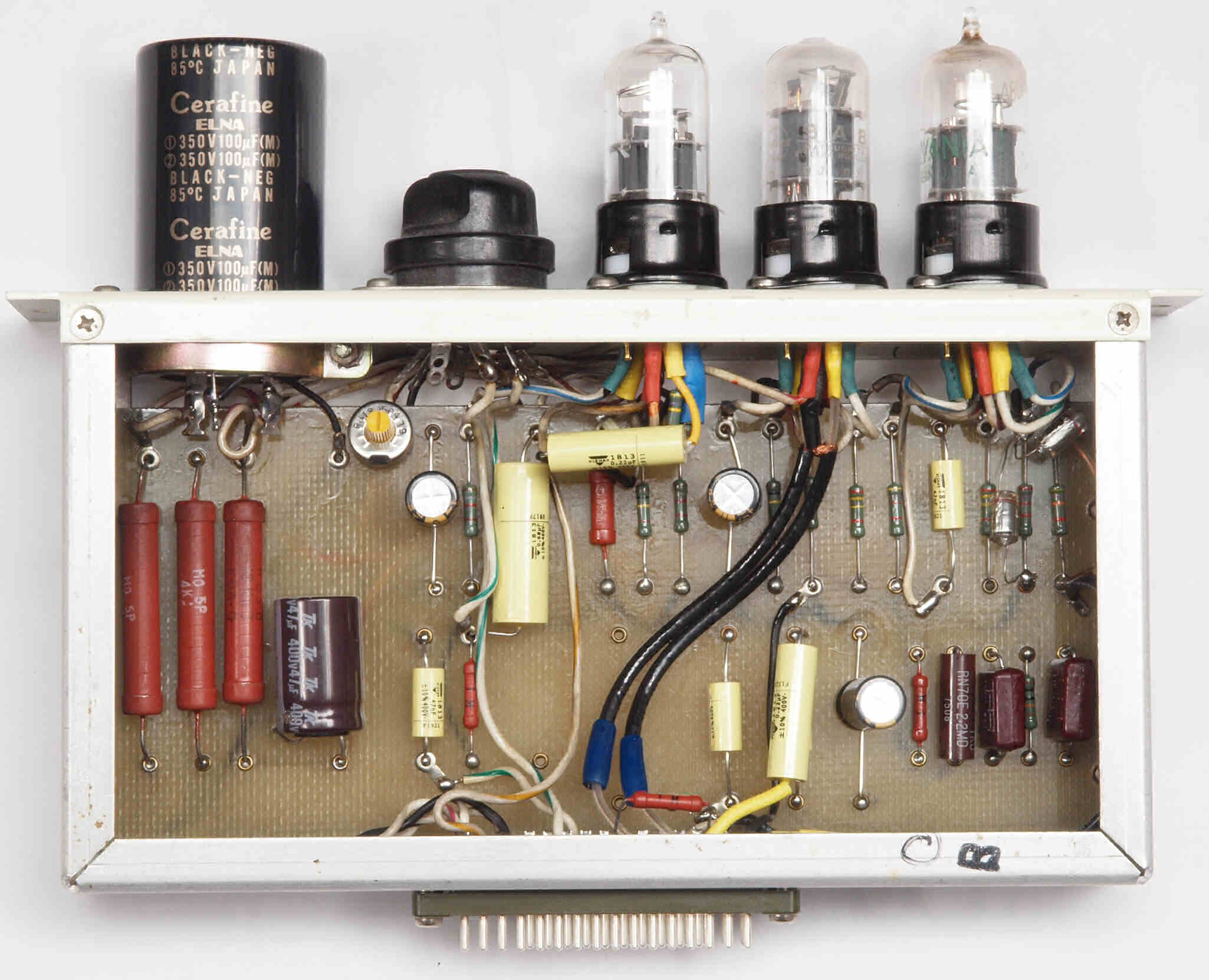 | C34. 修理後 AMPユニット−L側裏。真空管ソケットの配線は、ジャンク真空管(空気管等)を挿入し、ピンを固定して行う。 | ||||||||||||||||||||||||||||||