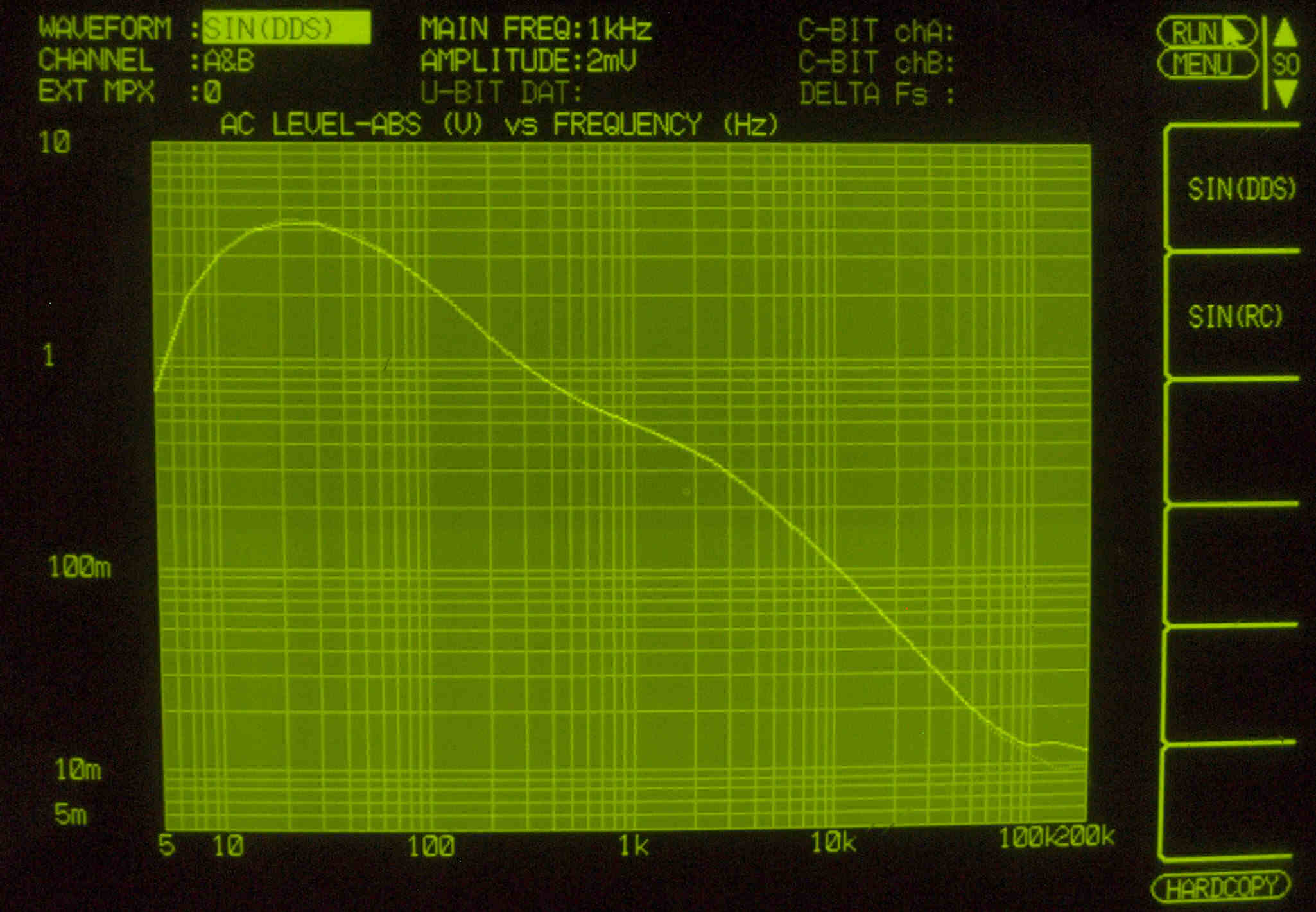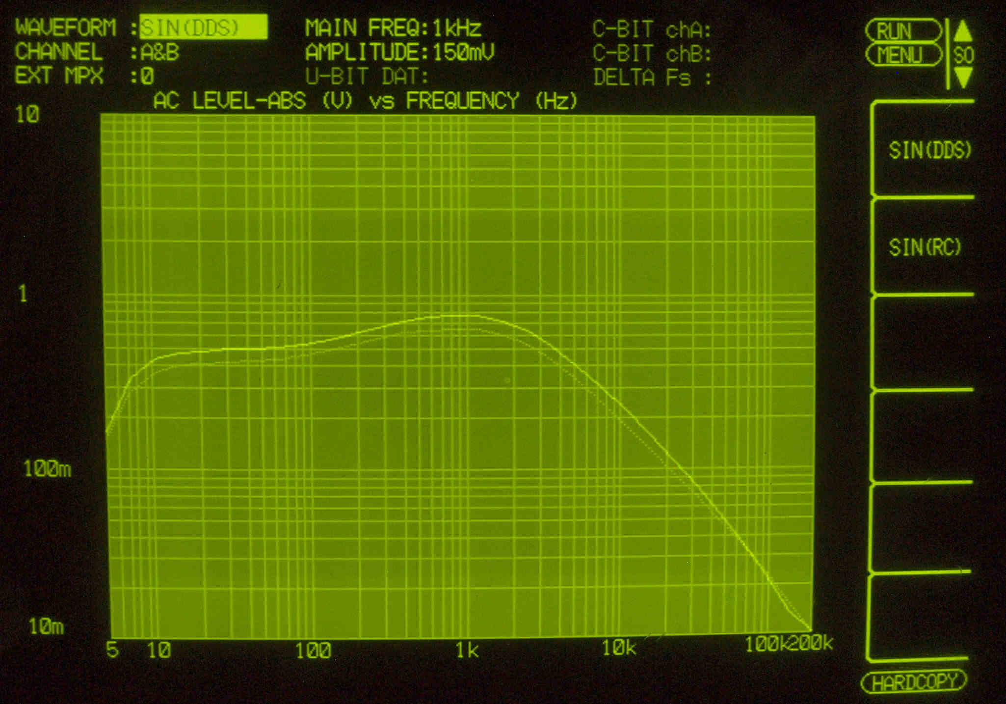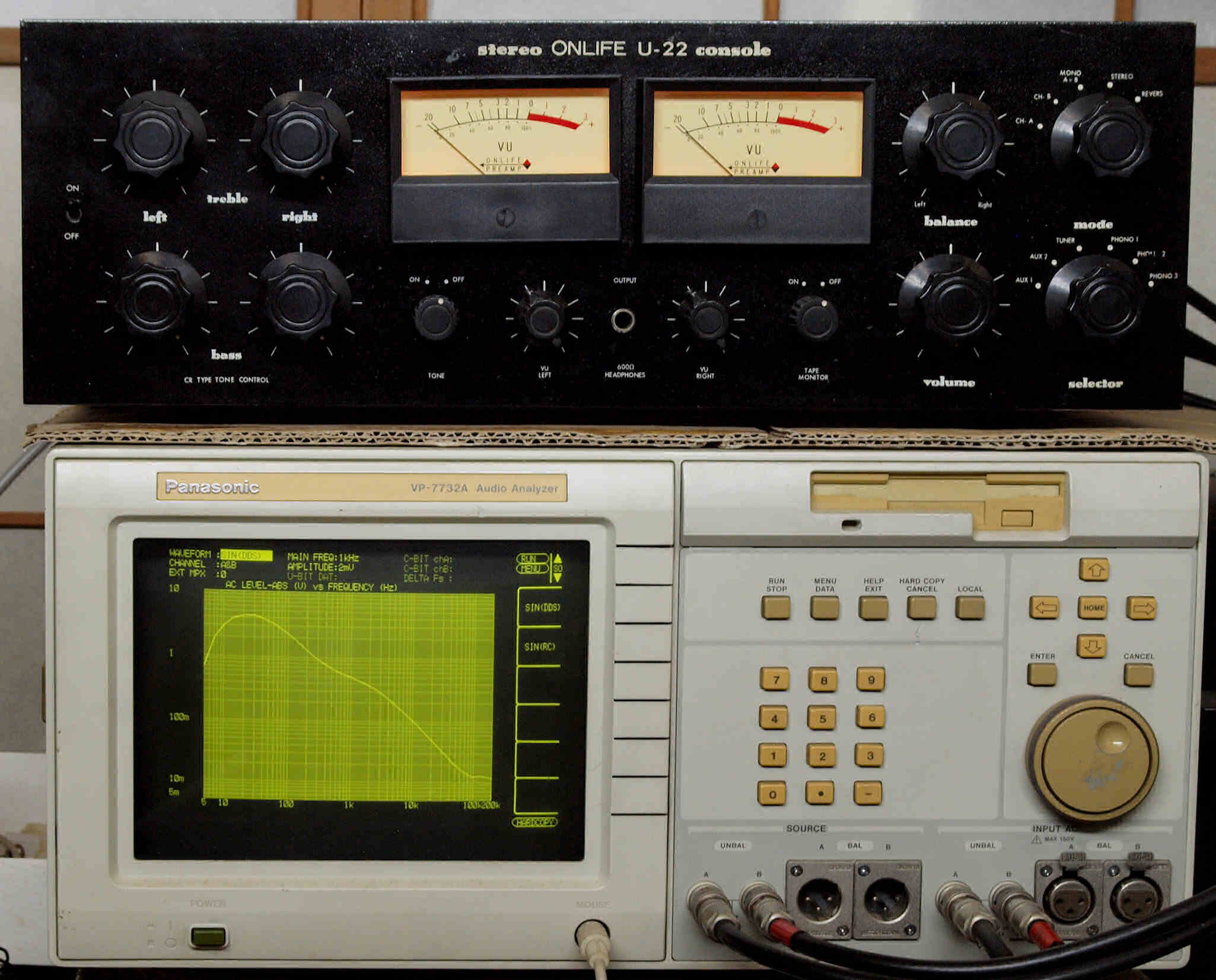 | F. 上位測定器による 調整・測定。 画像をクリックすると、大きく(横幅2050ドット)表示されます。 F0. 下のオーディオアナライザーVP−7732Aで自動測定。 |