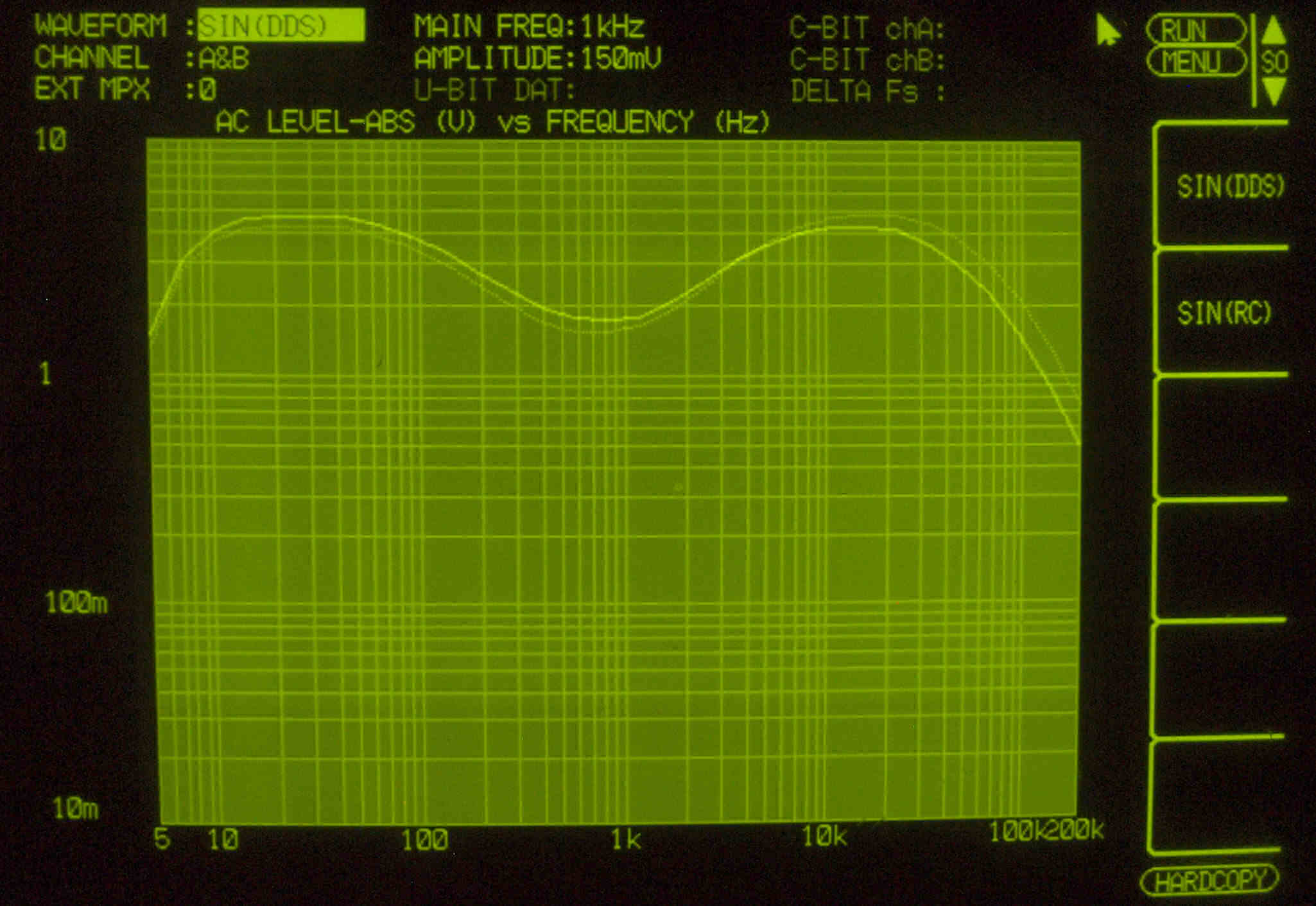 | E32. MM 100Hz入力、R側出力電圧=2V、 0.325%歪み。 L側出力電圧=2V、 0.285%歪み。 「FFT分析」のオシロのカーソル周波数、左=250Hz、右=1kHz。 |