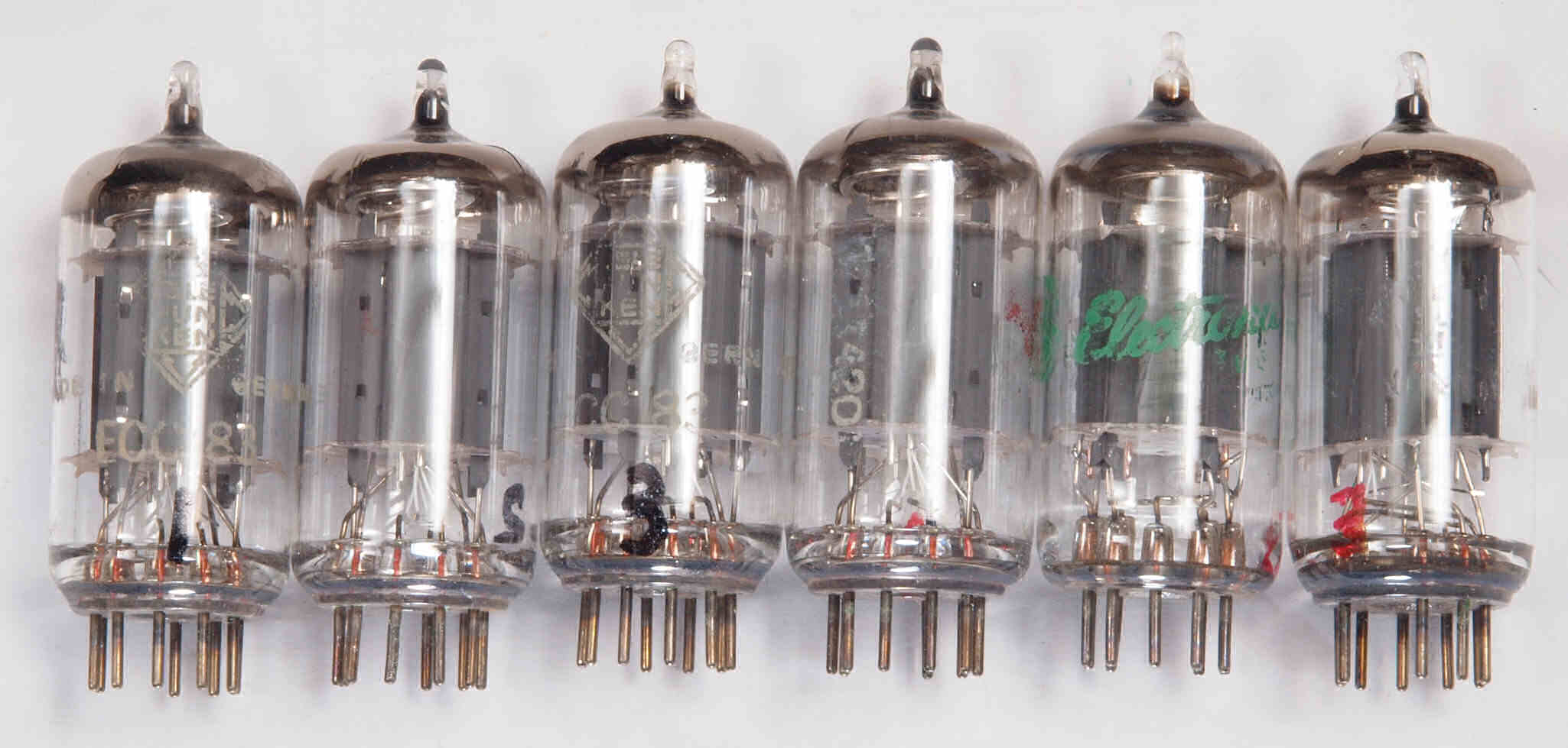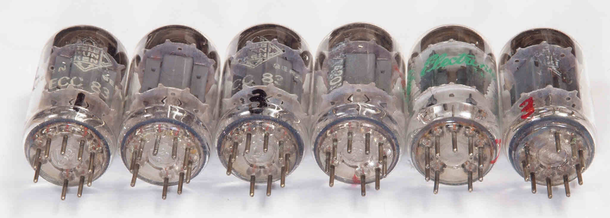 | AD1. 点検中 付属真空管12AX7(ECC83)、12AU7(ECC82)。 左3本=A=L側用、右3本=R=B側用。 左から1本目ECC83、ECC82、2本目ECC83。 |