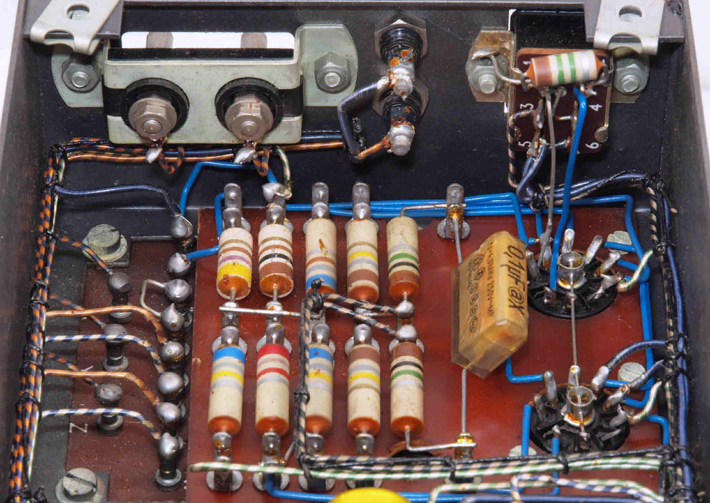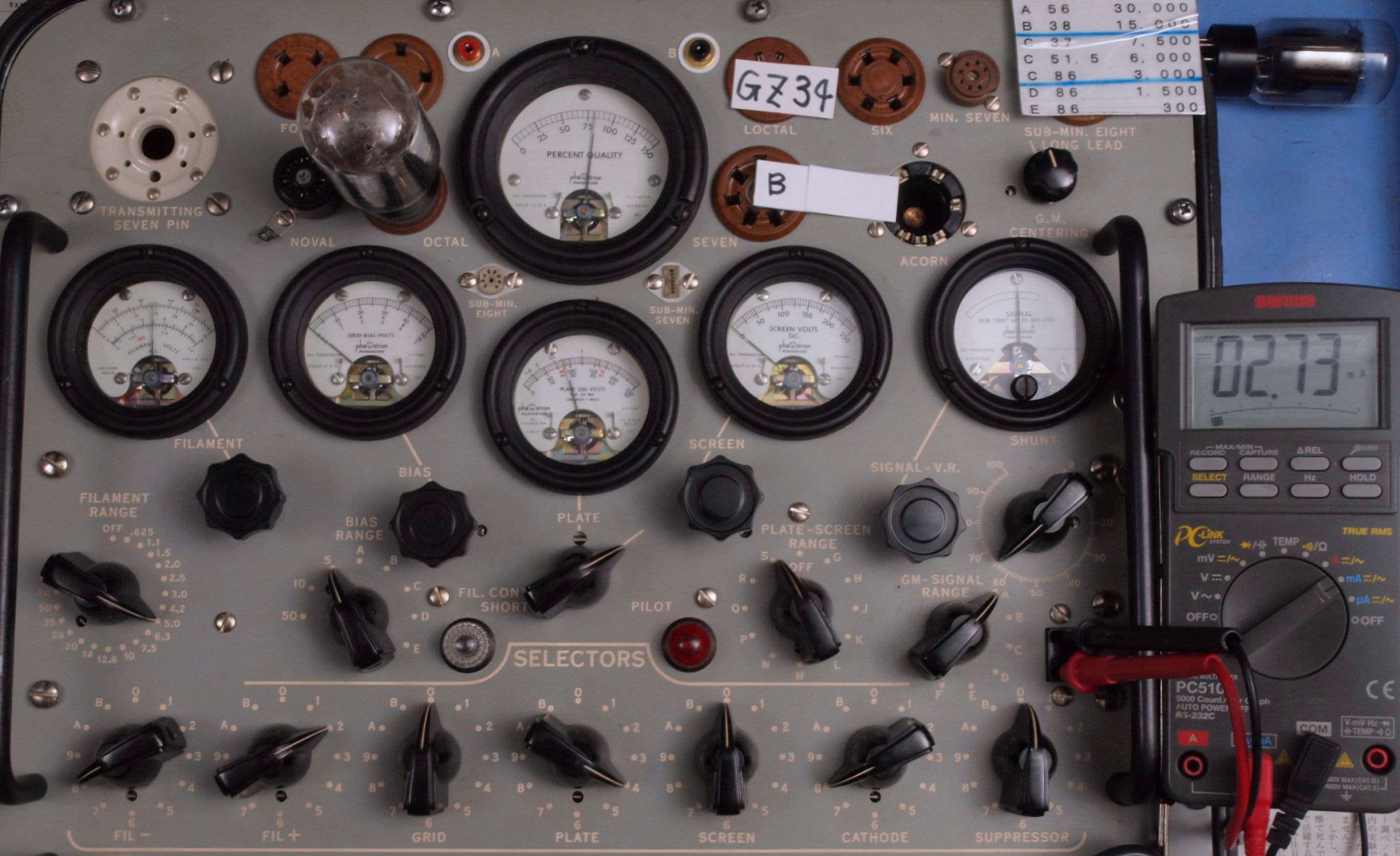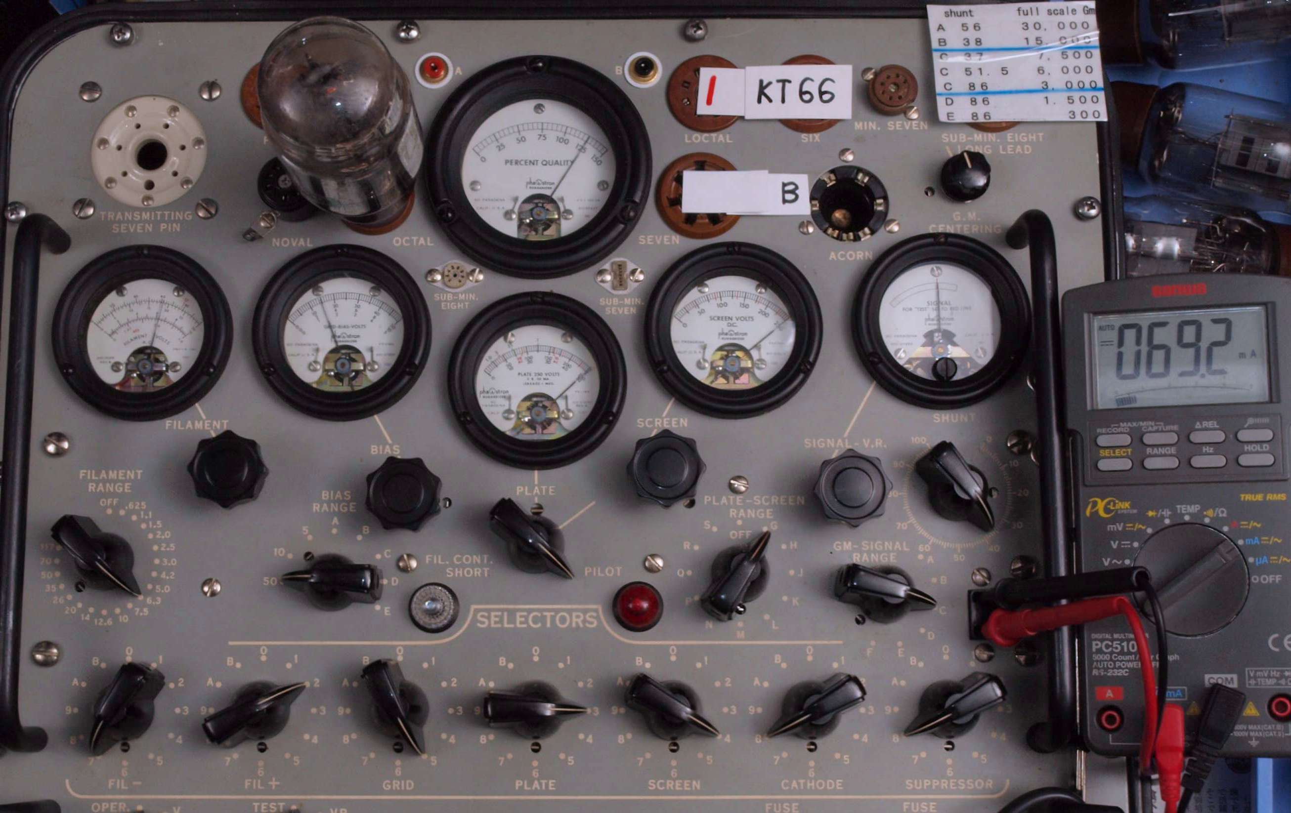 | U. TubeTester HickokTV−2B/Uによる付属真空管測定 。 真空管ハンドブック(規格表)の、 6267(EF86)相互コンダクタンス=2000μmho「Ep=250V、Ip=3mA、Esg=140V、Eg1=−2V」。 KT66相互コンダクタンス=6300μmho「Ep=250V、Esg=250V、Ip=85mA、Eg1=−15V」。 1960/1962/1964/1966ナショナル真空管ハンドブック、1995オーディオ用真空管マニアル、60/62/69東芝電子管ハンドブック、1962日立電子管ハンドブック、1965/1971全日本真空管マニュアル、RC15/19/26/27/28/29/30 Receiving Tube Manual、1966/実用真空管ハンドブック、1995世界の真空管カタログより。 5GK4(5AR45)エミション測定=VacuumTubeTester Hickok TV-2B/U の「5U4」検査方法による、破棄値=75。 |